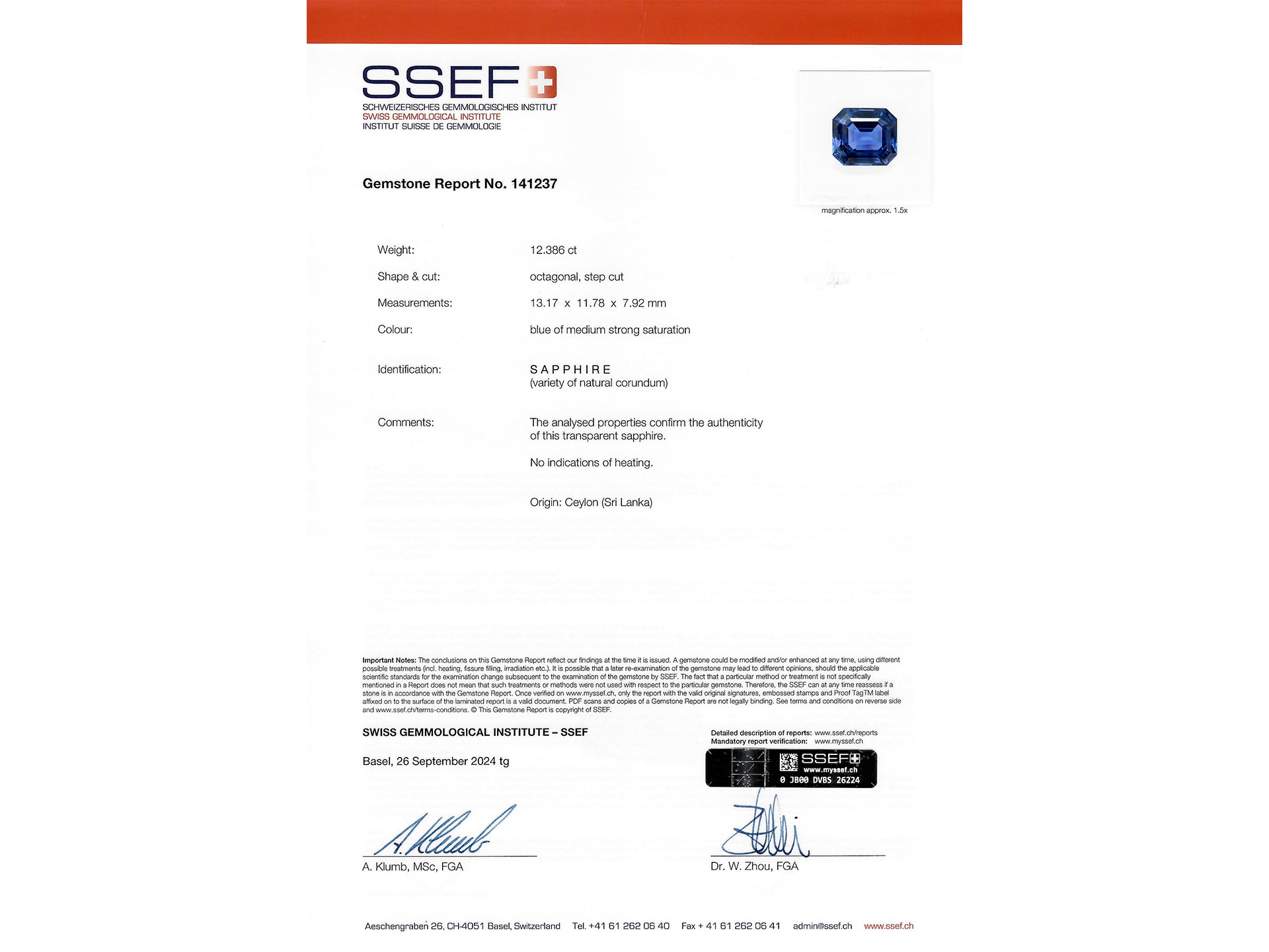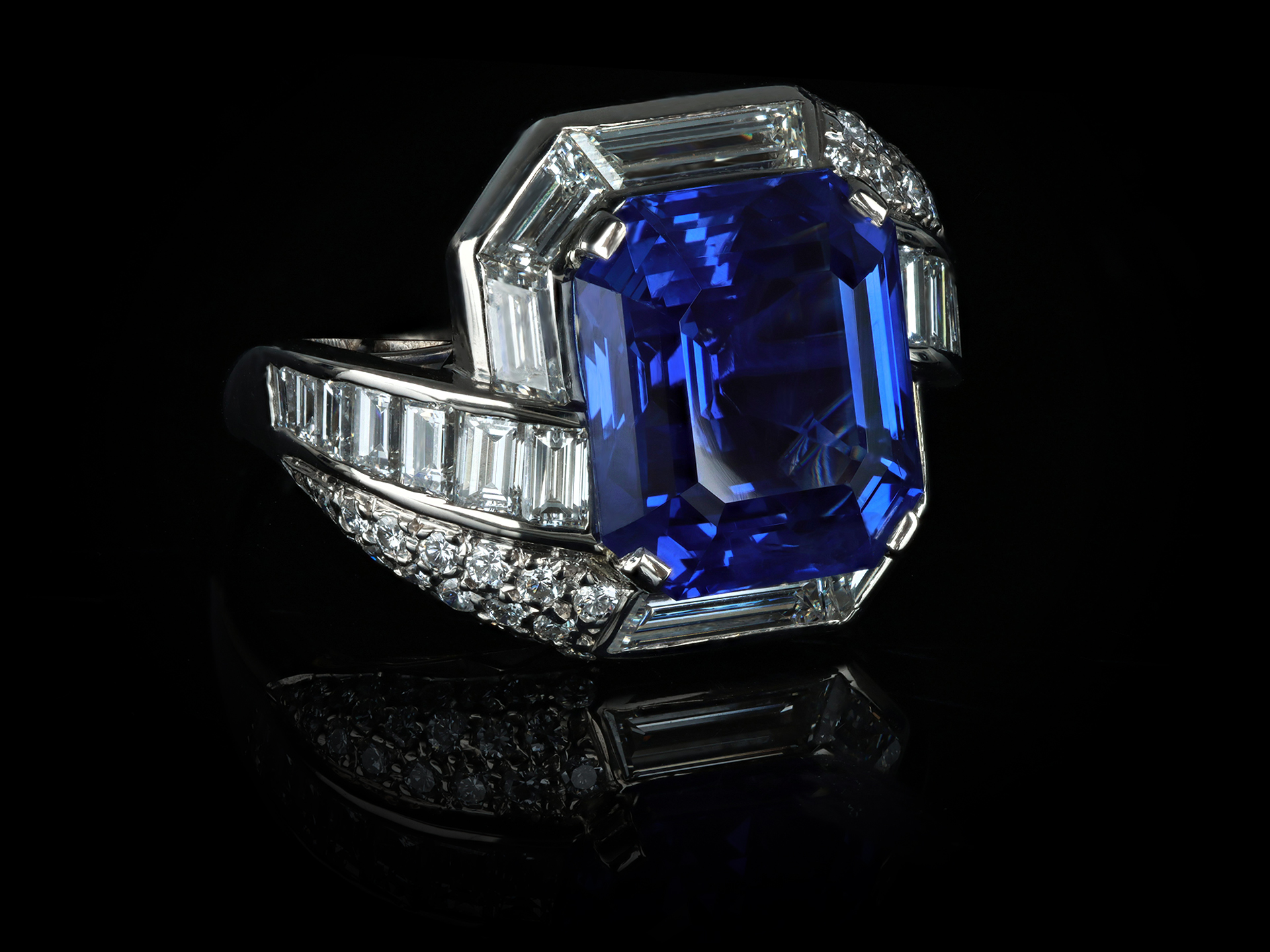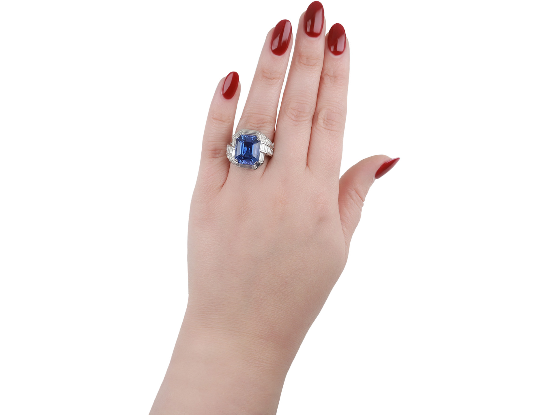 Ceylon sapphire and diamond cluster ring. Set to centre with an octagonal emerald-cut natural unenhanced Ceylon sapphire in an open back claw setting with a weight of 12.38 carats, further set with twenty tapered baguette cut diamonds in open back rubover settings with a combined approximate weight of 2.75 carats, and decorated with forty-two round brilliant cut diamonds in open back grain settings with a combined weight of 0.65 carats. The total approximate diamond weight is 3.40 carats, to an impressive geometric cluster design featuring polished edges, a decoratively pierced gallery with triangular motifs and chenier detail, and fancy shape open backholing, leading to tapering asymmetric shoulders and flowing through to a solid D-shape shank. Tested platinum and iridium, American, circa 1960, accompanied by SSEF report #141237 and The Gem and Pearl Laboratory report #25069.