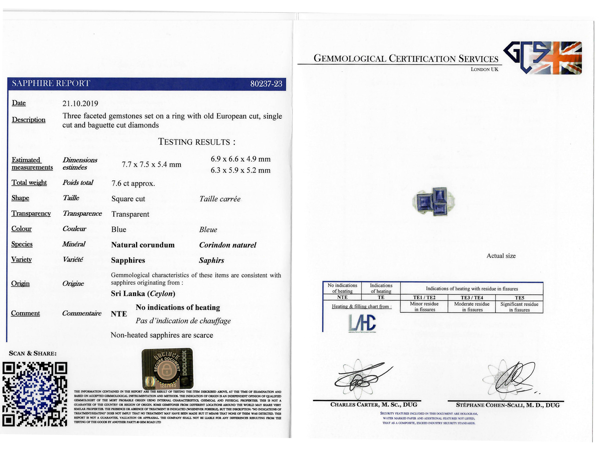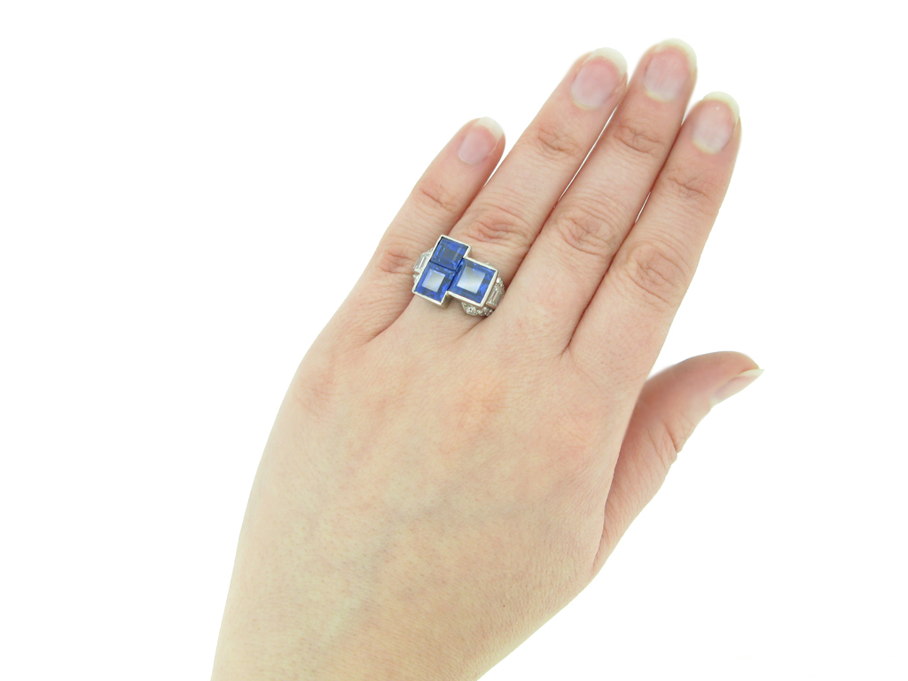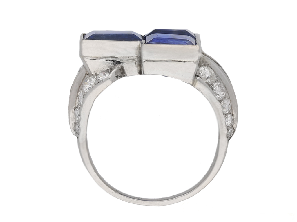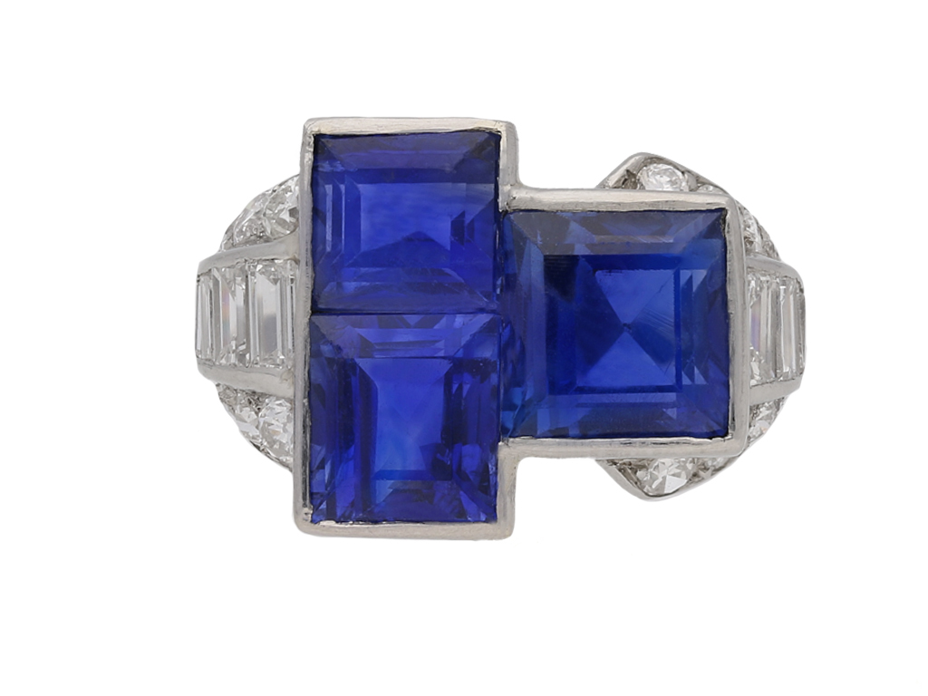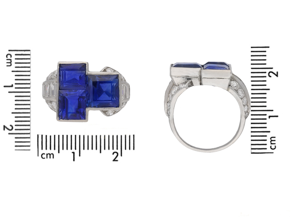 Ceylon sapphire and diamond cluster ring. Set to centre with three square step cut natural unenhanced Ceylon sapphires in open back rubover channel settings with an approximate combined weight of 9.50 carats, the shoulders set with ten rectangular baguette cut diamonds in open back channel settings with a combined approximate weight of 1.10 carats, and further enhanced by twenty round old cut diamonds in open back grain settings with a combined weight of 1.00 carats. The total approximate diamond weight is 2.10 carats, to an asymmetrical geometric cluster design with a closed gallery and fancy backholing, proceeding to curved trumpeting shoulders and terminating in a solid D-shape shank. Tested platinum, circa 1925, accompanied by a Gemmological Certification Services report #80237-23.