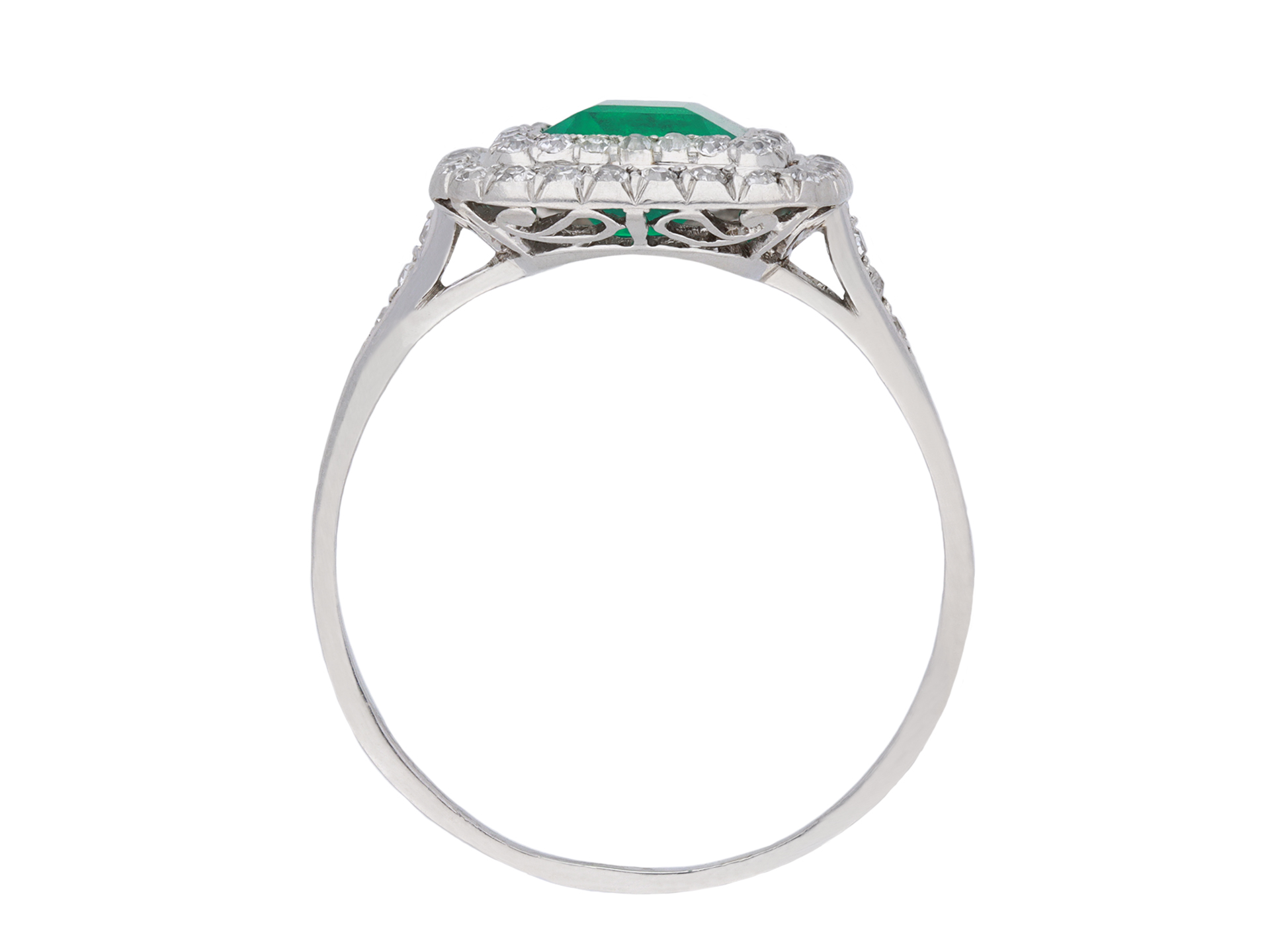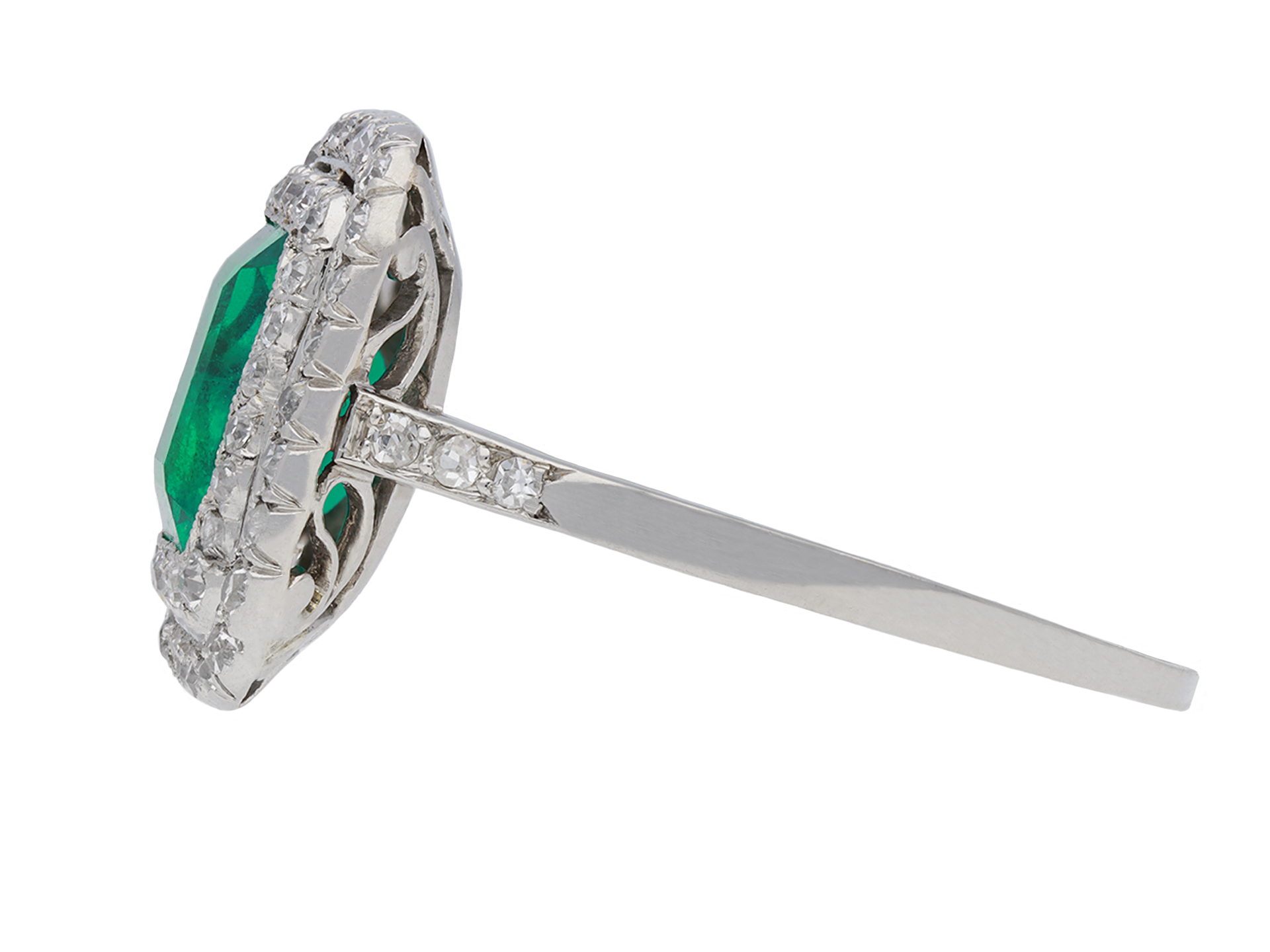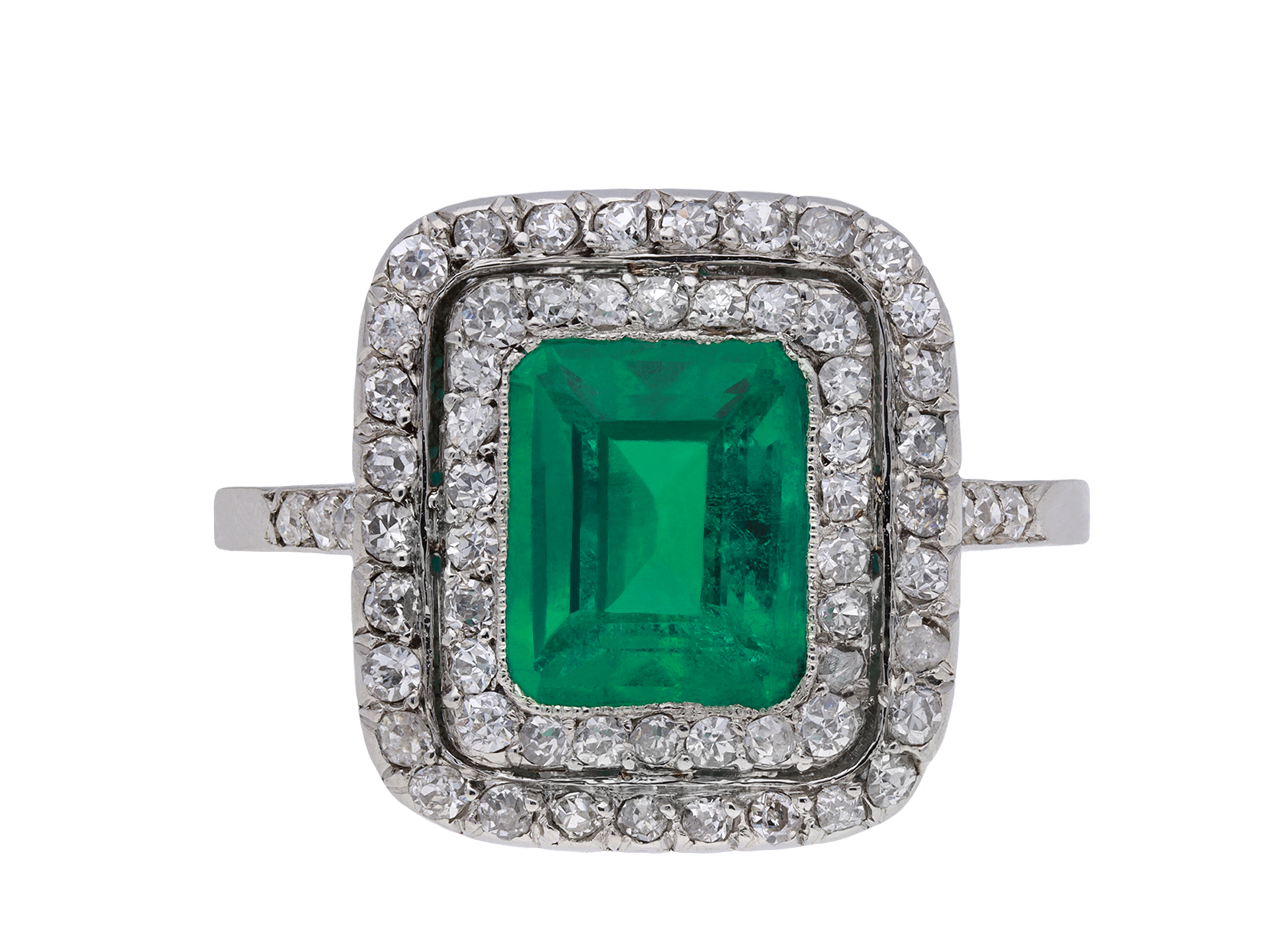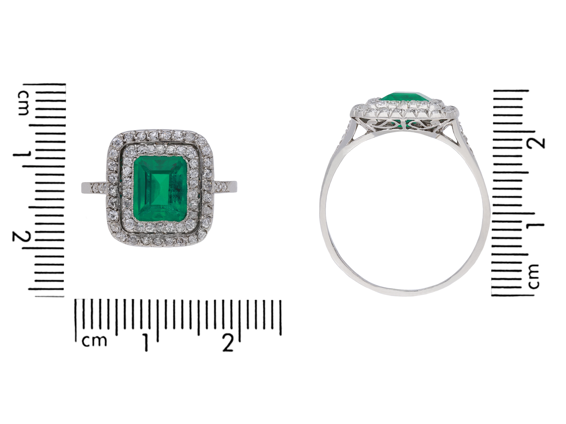 Colombian emerald and diamond cluster ring. Set to centre with an octagonal step cut natural Colombian emerald with minor clarity enhancement in an open back rubover setting with an approximate weight of 1.70 carats, further decorated with sixty two round mixed old cut diamonds in open back grain and cut-down settings with a combined approximate weight of 0.62 carats, to a geometric double row cluster design featuring millegrain edging, an intricately pierced gallery with scrolling motifs, and fancy shape open backholing, leading to raised shoulders and flowing through to a solid flat shank. Marked platinum, French, circa 1915, accompanied by a Gemmological Certification Services report #5782-918.