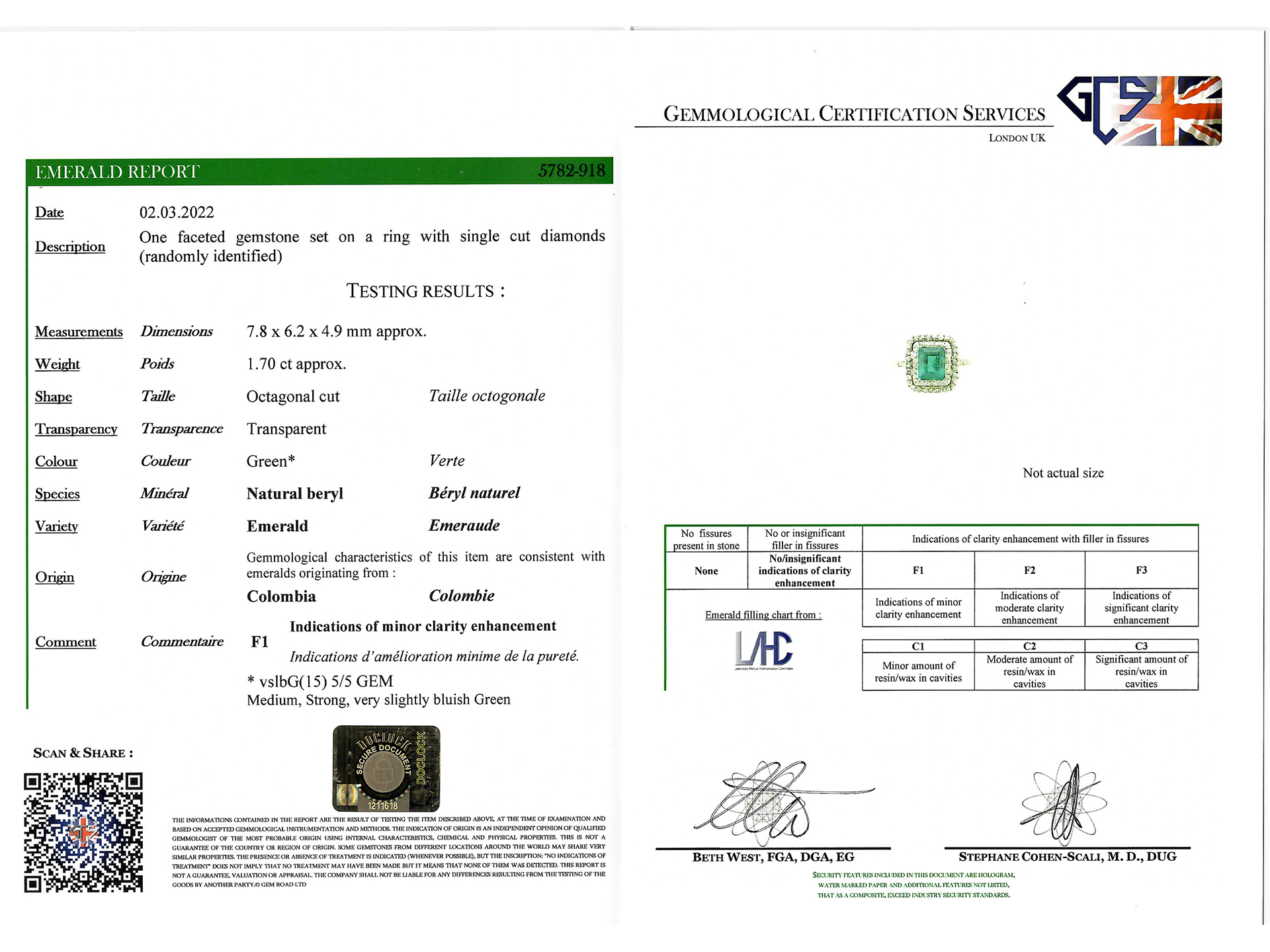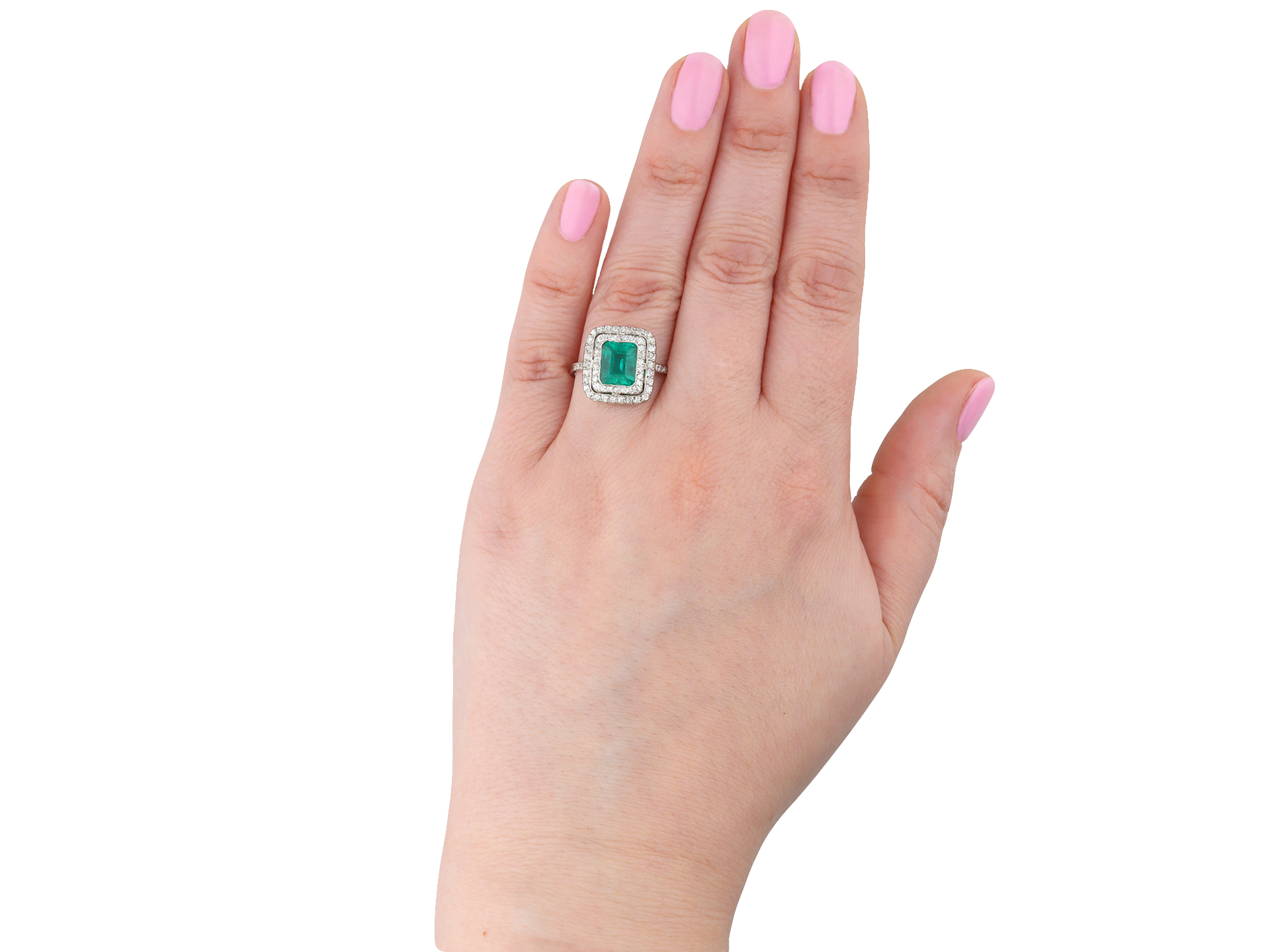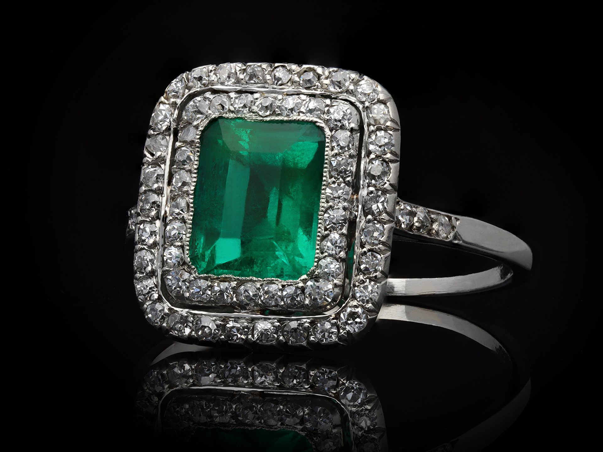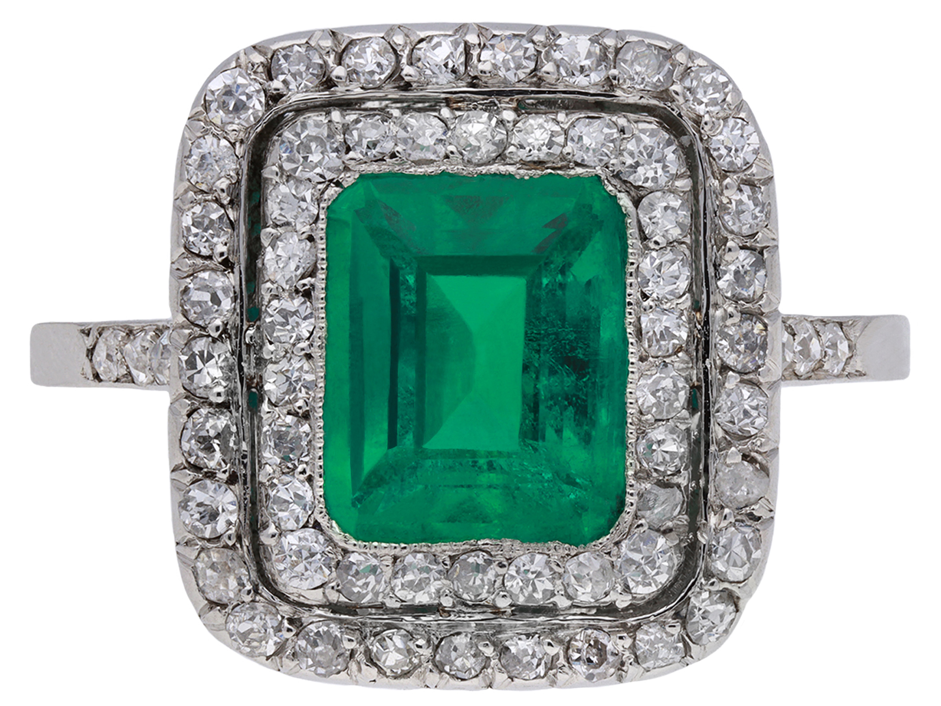 Colombian emerald and diamond cluster ring. Set to centre with an octagonal step cut natural Colombian emerald with minor clarity enhancement in an open back rubover setting with an approximate weight of 1.70 carats, further decorated with sixty two round mixed old cut diamonds in open back grain and cut-down settings with a combined approximate weight of 0.62 carats, to a geometric double row cluster design featuring millegrain edging, an intricately pierced gallery with scrolling motifs, and fancy shape open backholing, leading to raised shoulders and flowing through to a solid flat shank. Marked platinum, French, circa 1915, accompanied by a Gemmological Certification Services report #5782-918.