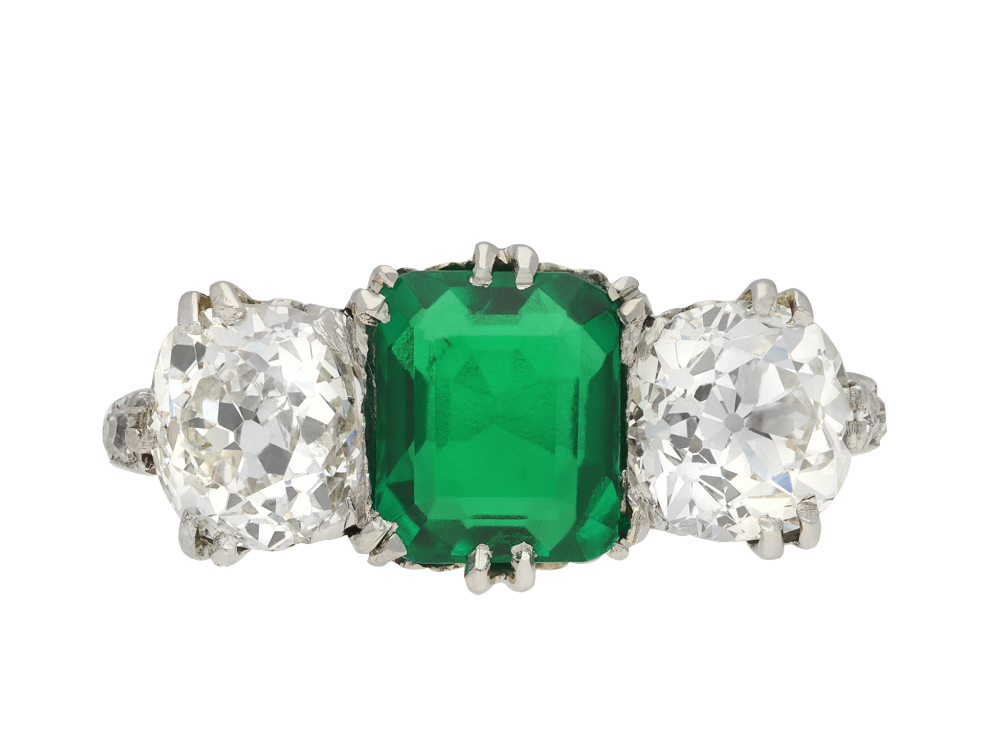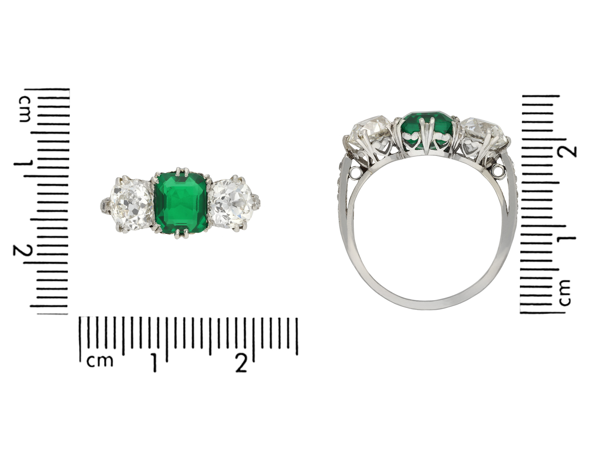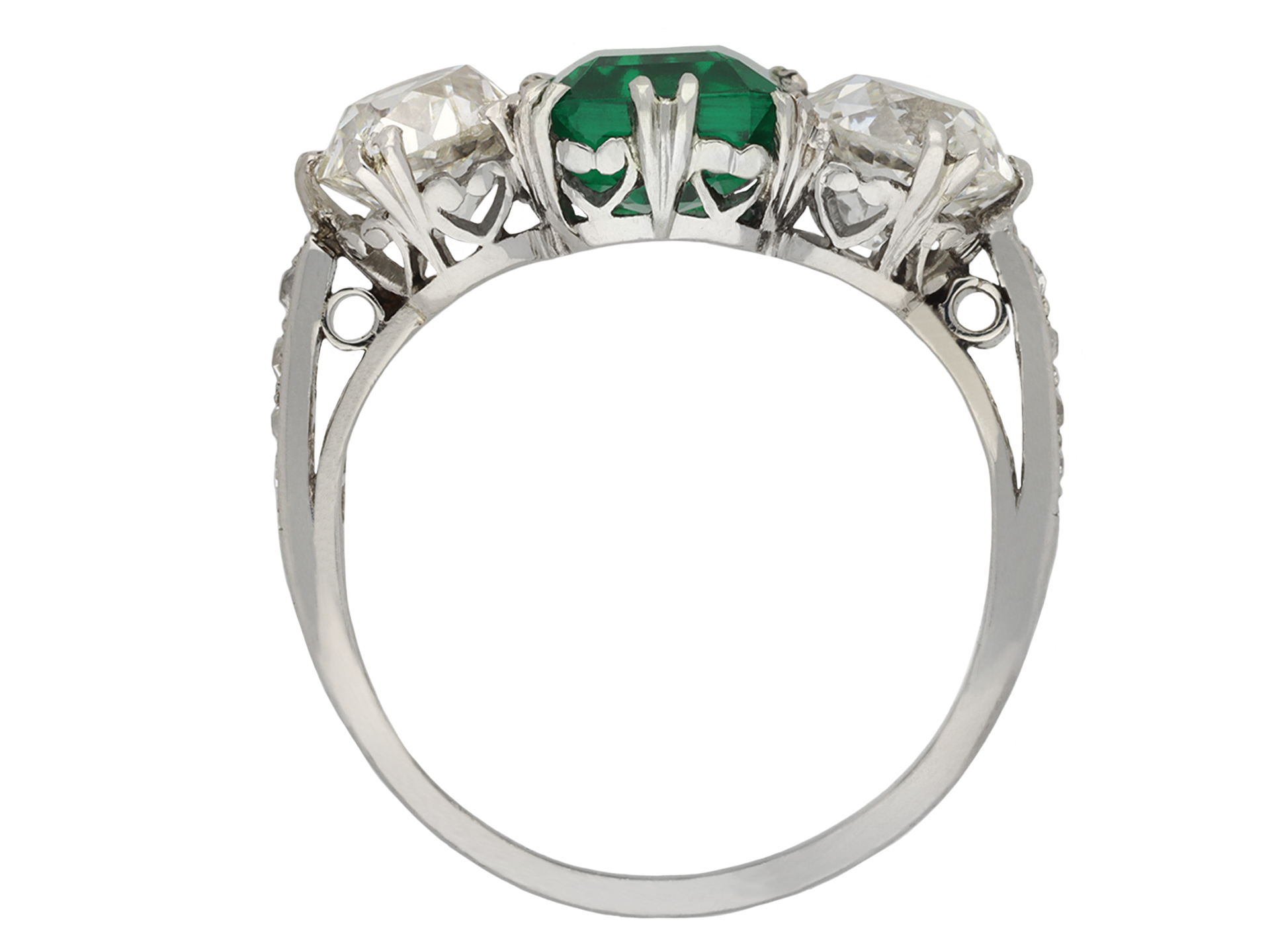 No oil Colombian emerald and diamond three stone ring. Set with a rectangular emerald-cut natural Colombian emerald with no oil in an open back claw setting with an approximate weight of 1.37 carats, flanked by two cushion shape old mine diamonds in open back claw settings with a combined weight of 2.07 carats, flanked by eight round eight cut diamonds in open back grain with a combined weight of 0.15 carats. The total approximate diamond weight is 2.22 carats, to an elegant three stone design featuring split curving claws, openwork gallery with heart motif detail and open backholing, the split diamond set shoulders supported by cheniers flowing through to a solid D-shape shank. Tested platinum, circa 1910. Accompanied by Swiss Gemmological Institute report (SSEF) #122160.