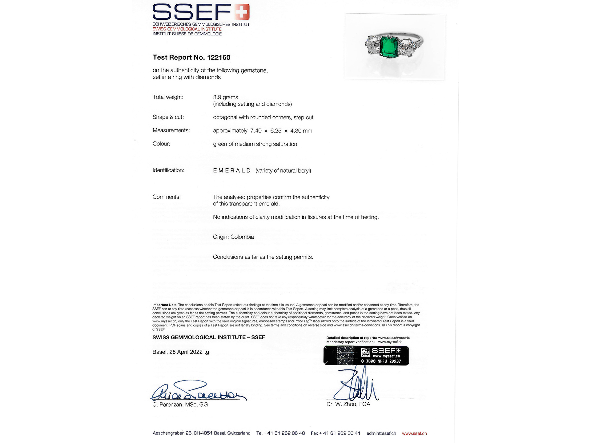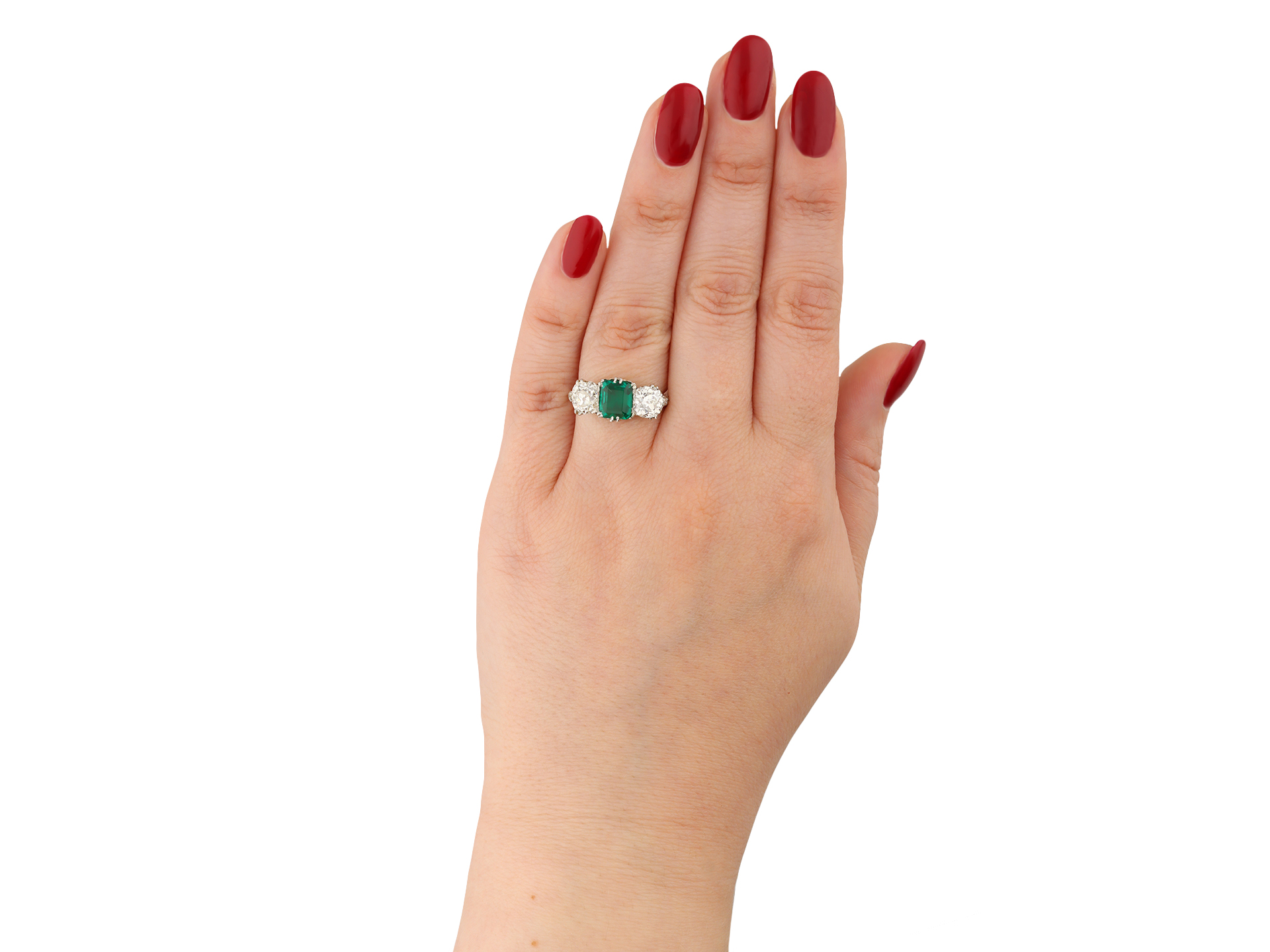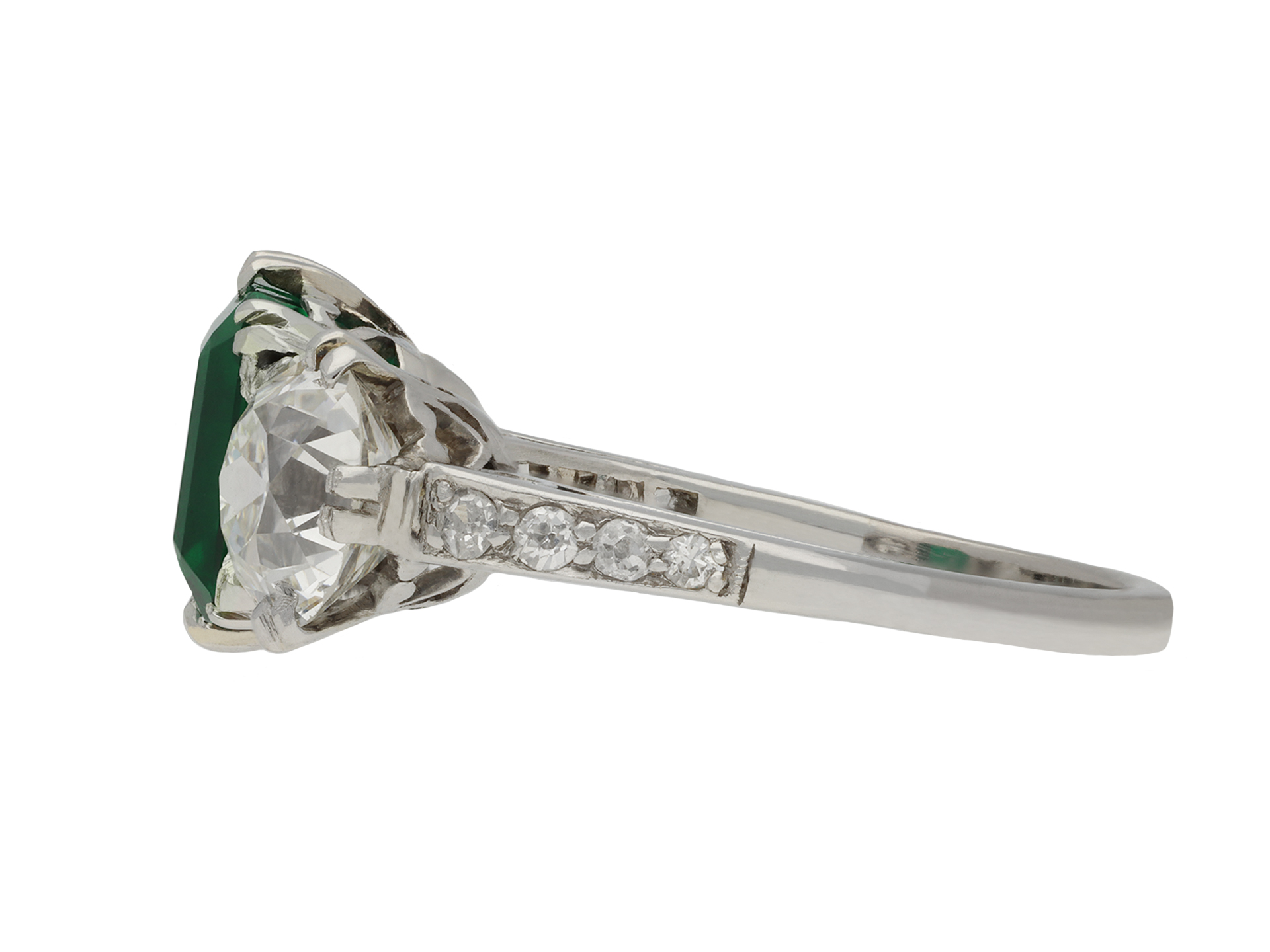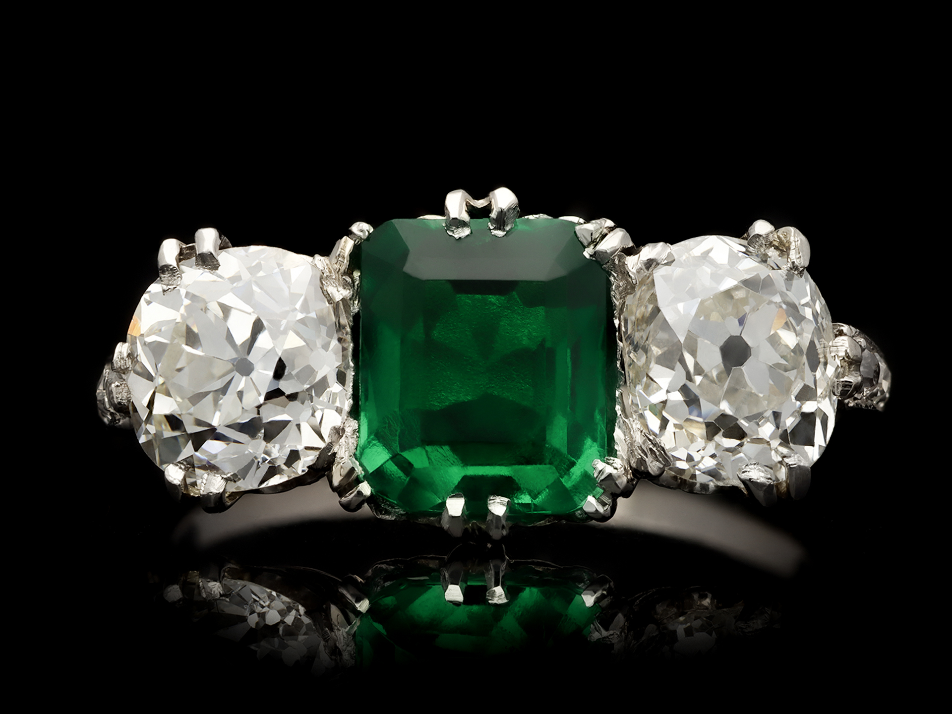 No oil Colombian emerald and diamond three stone ring. Set with a rectangular emerald-cut natural Colombian emerald with no oil in an open back claw setting with an approximate weight of 1.37 carats, flanked by two cushion shape old mine diamonds in open back claw settings with a combined weight of 2.07 carats, flanked by eight round eight cut diamonds in open back grain with a combined weight of 0.15 carats. The total approximate diamond weight is 2.22 carats, to an elegant three stone design featuring split curving claws, openwork gallery with heart motif detail and open backholing, the split diamond set shoulders supported by cheniers flowing through to a solid D-shape shank. Tested platinum, circa 1910. Accompanied by Swiss Gemmological Institute report (SSEF) #122160.