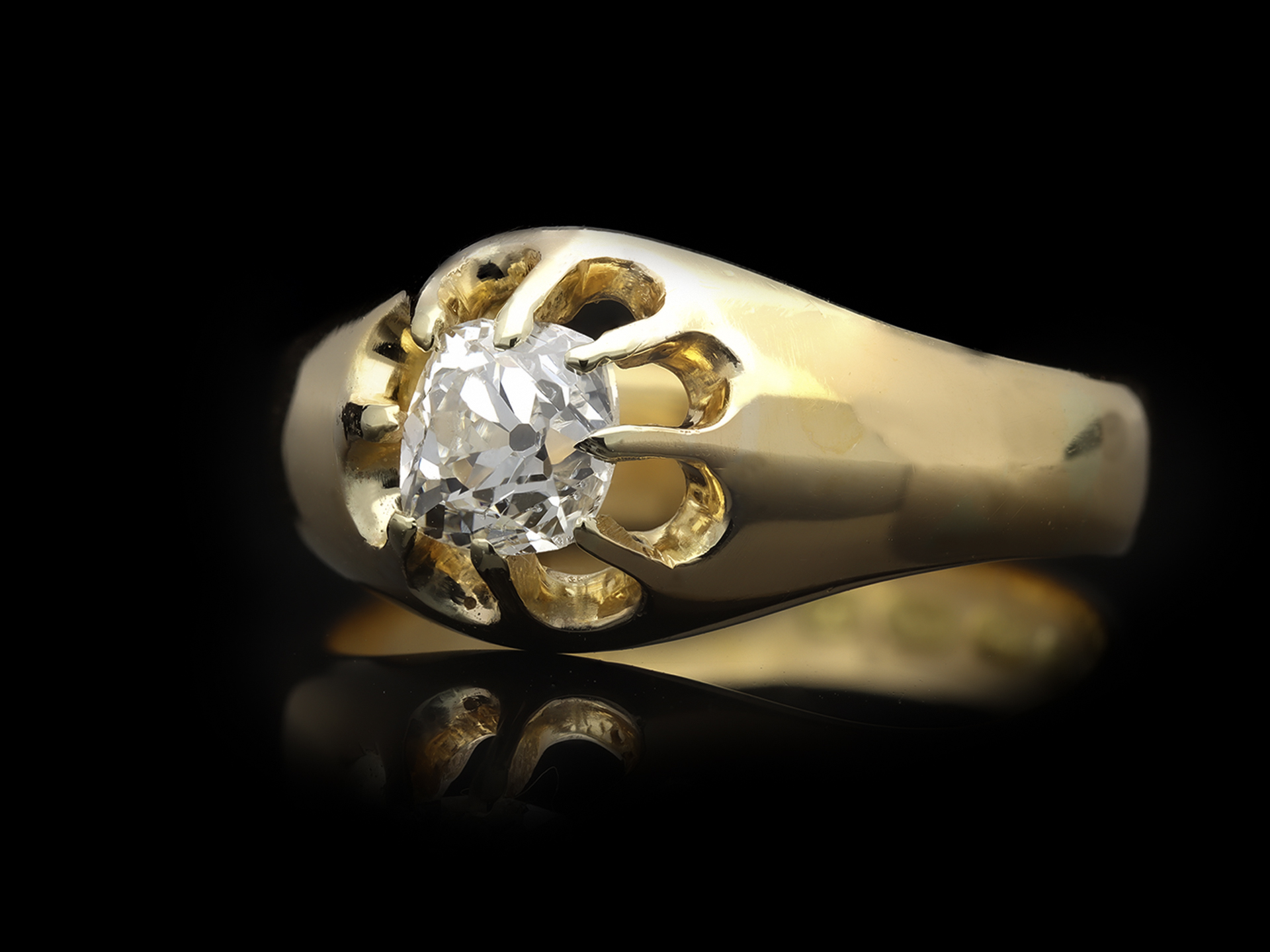 Cushion shape diamond solitaire ring. Set centrally with a cushion shape old cut diamond in an open back raised claw setting with an approximate weight of 0.65 carats, to elegantly curving claws and circular backholing, the broad integrated shoulders smoothly flowing through to a solid tapering D-shape shank. Marked 18 carat yellow gold, full hallmarks for Birmingham, maker's mark 'W.S', English, circa 1922.