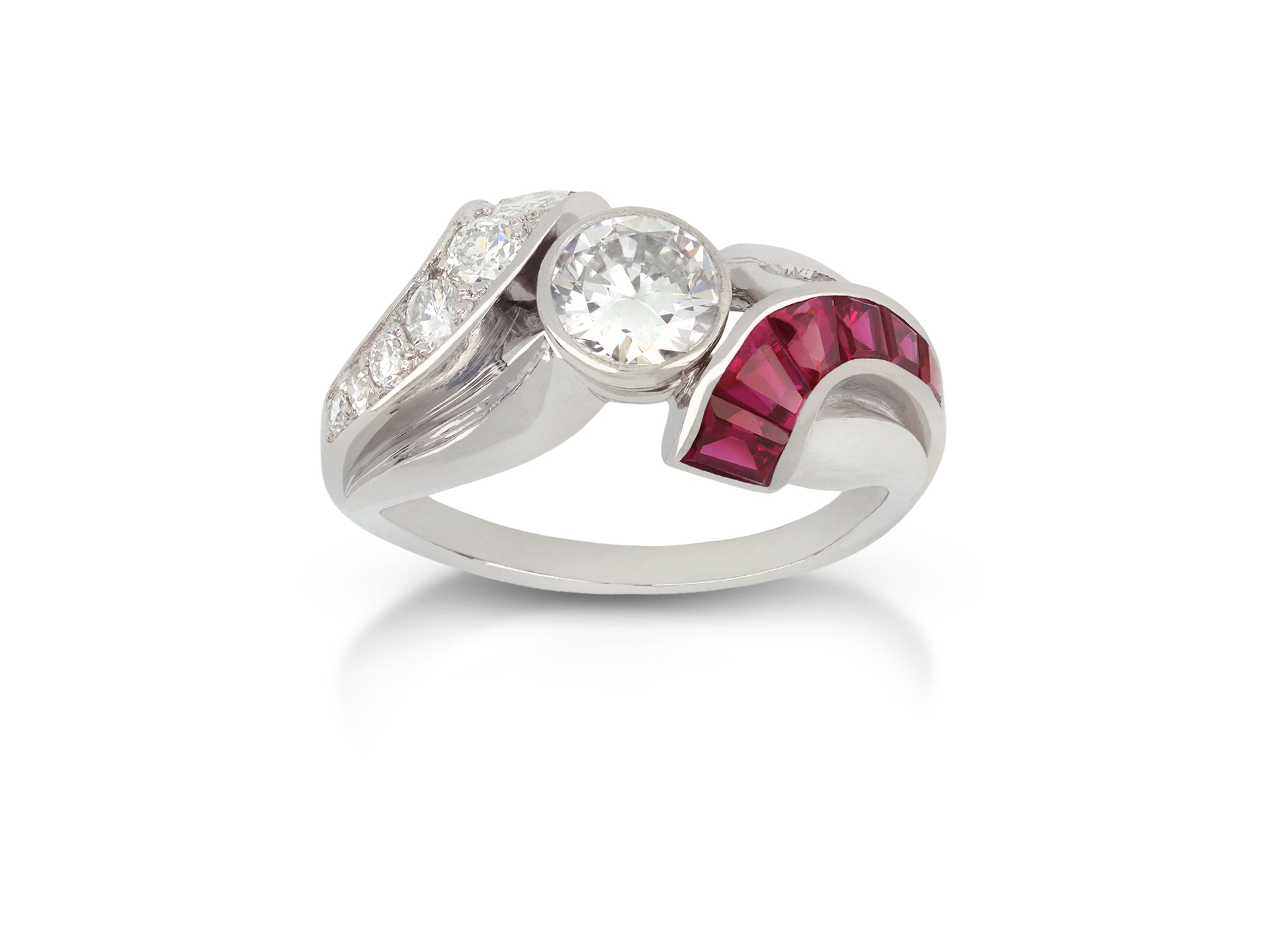 Diamond and ruby ring. Centrally set with a round old cut diamond in an open back rubover setting with an approximate weight of 0.70 carats, flanked by six round old cut diamonds in open back grain settings with a combined weight of 0.35 carats, further flanked by six calibre cut natural no heat rubies in open back channel settings with an approximate combined weight of 0.80 carats. The total approximate diamond weight is 1.05 carats, to a scrolling cross over form featuring openwork details, polished edges and open backholing, leading to stepped shoulders which taper through to a solid flat shank. Tested platinum, circa 1940.