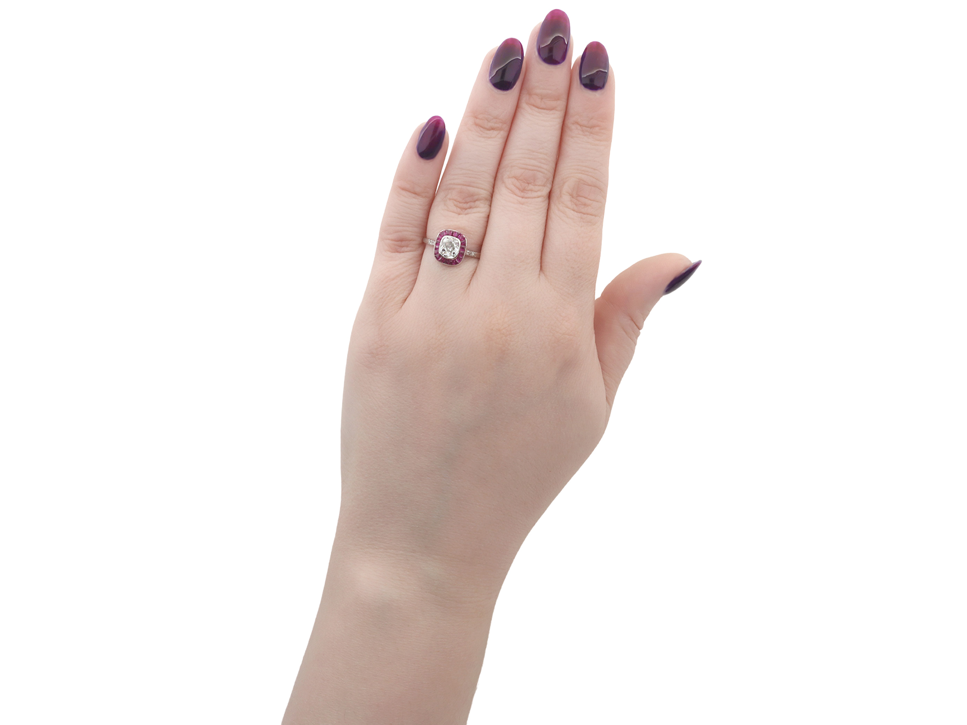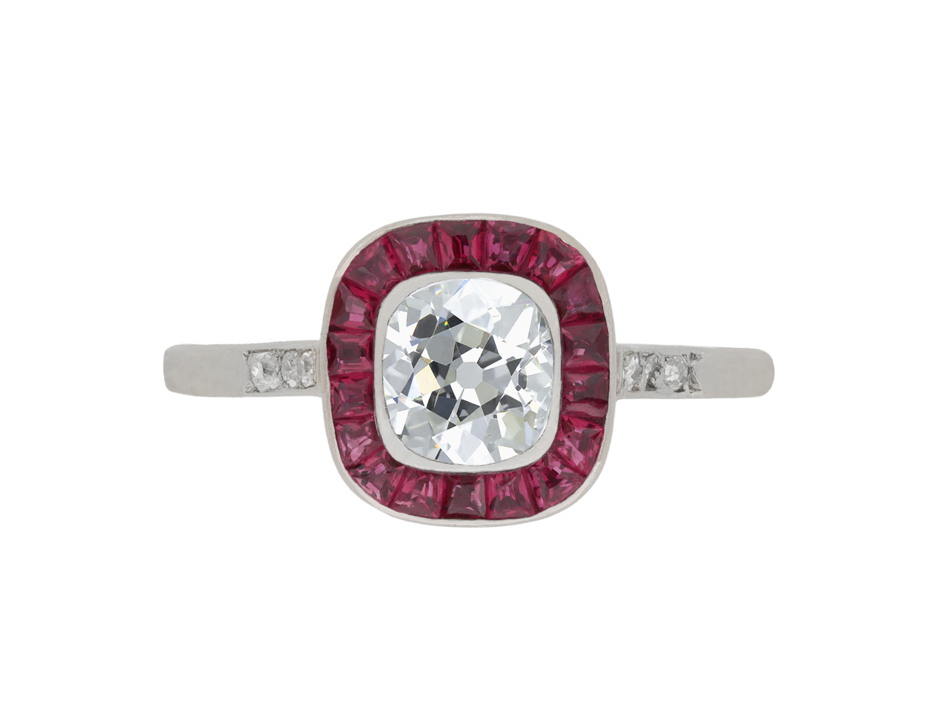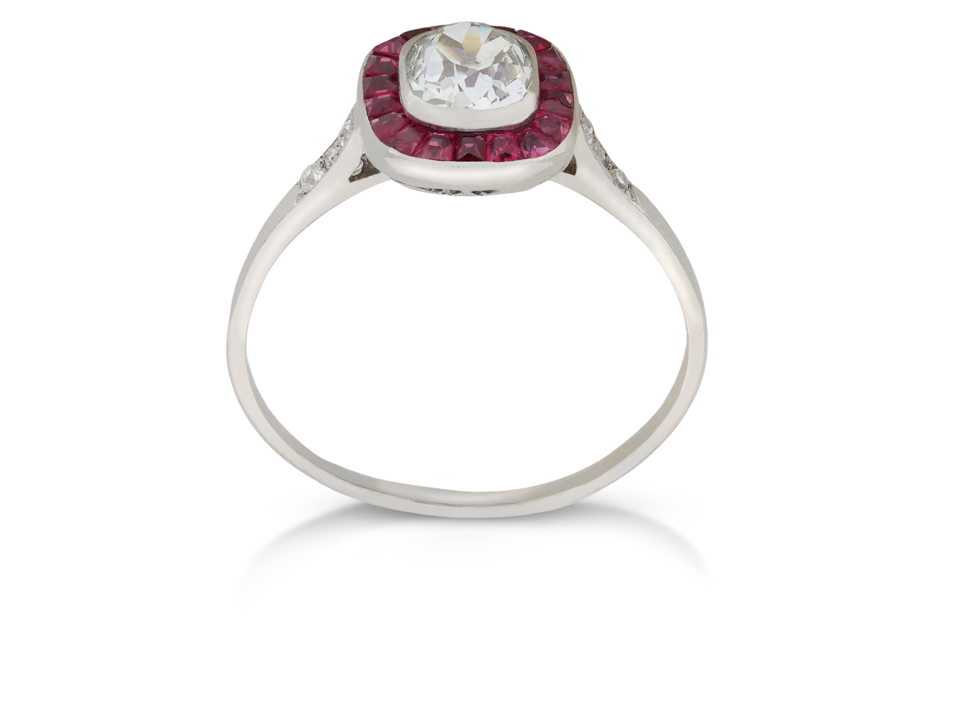 Diamond and ruby target ring. Set with a cushion shape old mine diamond in an open back rubover setting with an approximate weight of 1.00 carats, encircled by a single row of calibre cut natural unenhanced rubies in open back channel settings with a combined approximate weight of 0.72 carats, further set with six round eight cut diamonds in open back grain settings with a combined weight of 0.06 carats. The total approximate diamond weight is 1.08 carats, to a cushion shape target cluster with polished edges, a finely pierced scrolling gallery and fancy shape open backholing, flanked by raised shoulders which lead through to a solid D-shape shank. Marked platinum, numbered '2301', French, circa 1915.