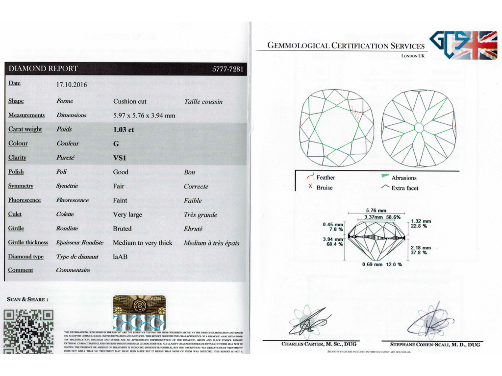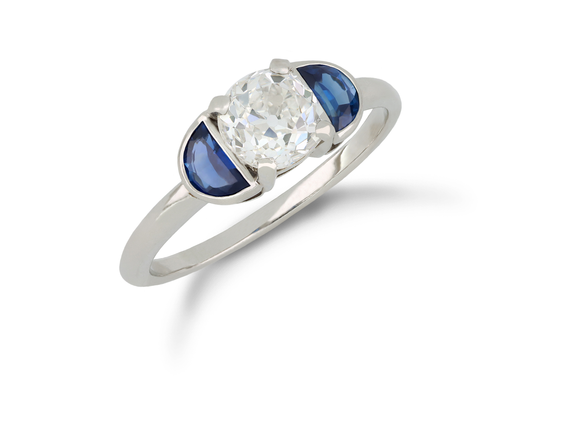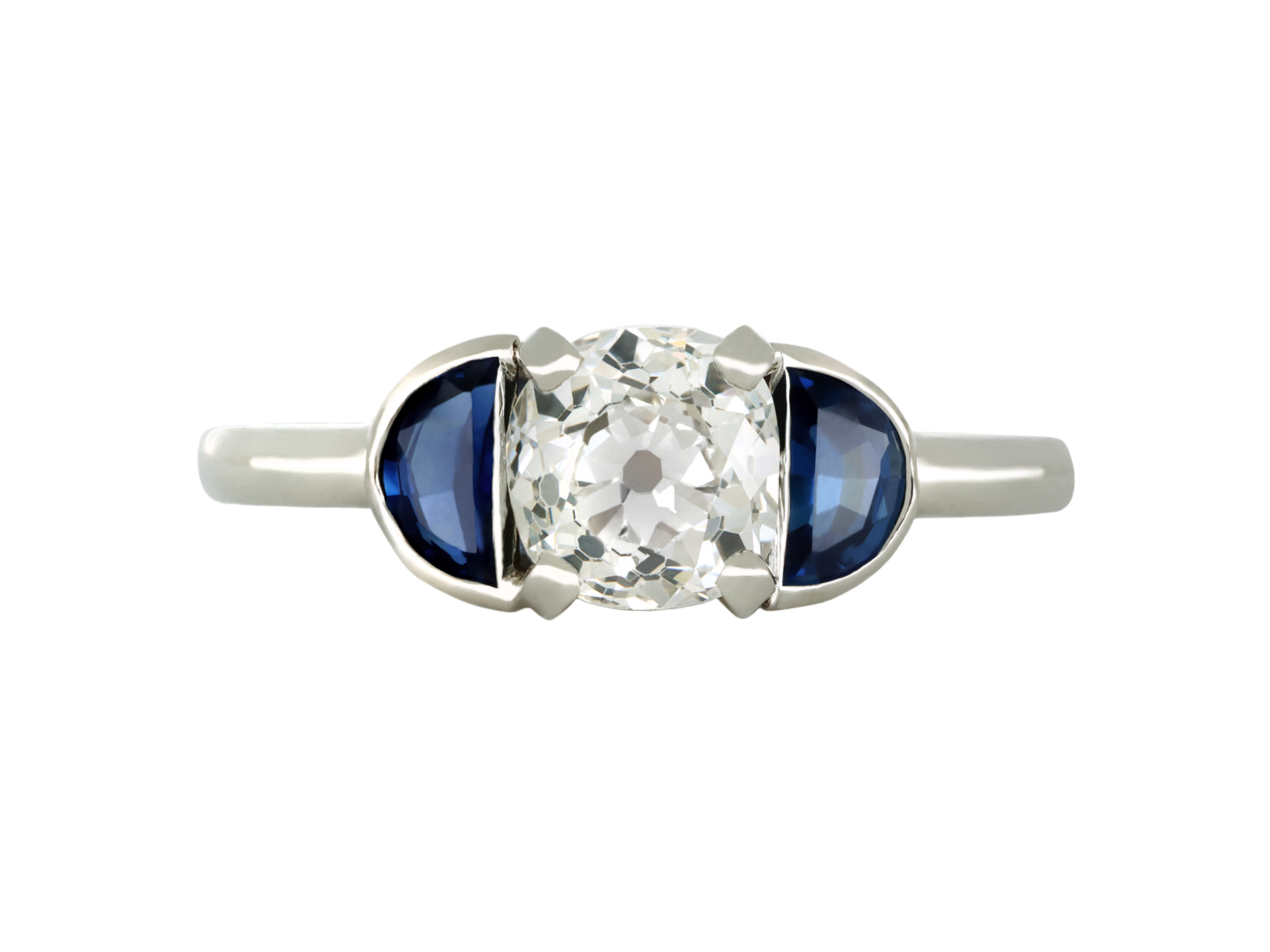 Diamond and sapphire flanked solitaire ring. Set with a cushion shape old cut diamond, G colour, VS1 clarity, with an approximate weight of 1.03 carats in an open back four claw setting, further set with two D-shape old cut natural unenhanced sapphires in open back rubover settings with a combined approximate weight of 0.50 carats, to an elegant flanked solitaire design featuring curving claws, an intricately pierced gallery and fancy open backholing, flanked by trumpeting shoulders flowing through to a solid slim shank. Marked platinum, English, circa 1920, accompanied by Gemmological Certification Services report #5777-7281.
