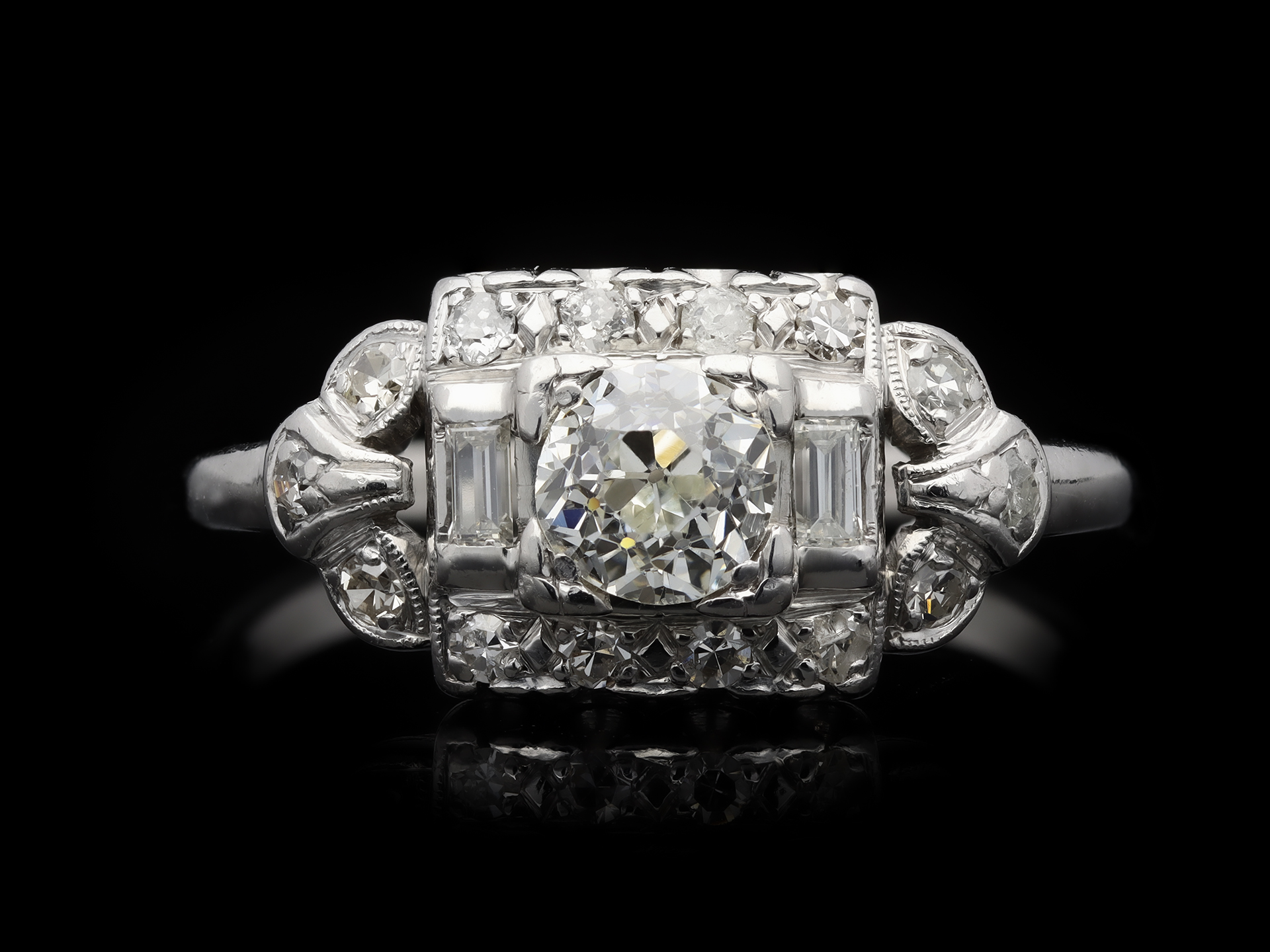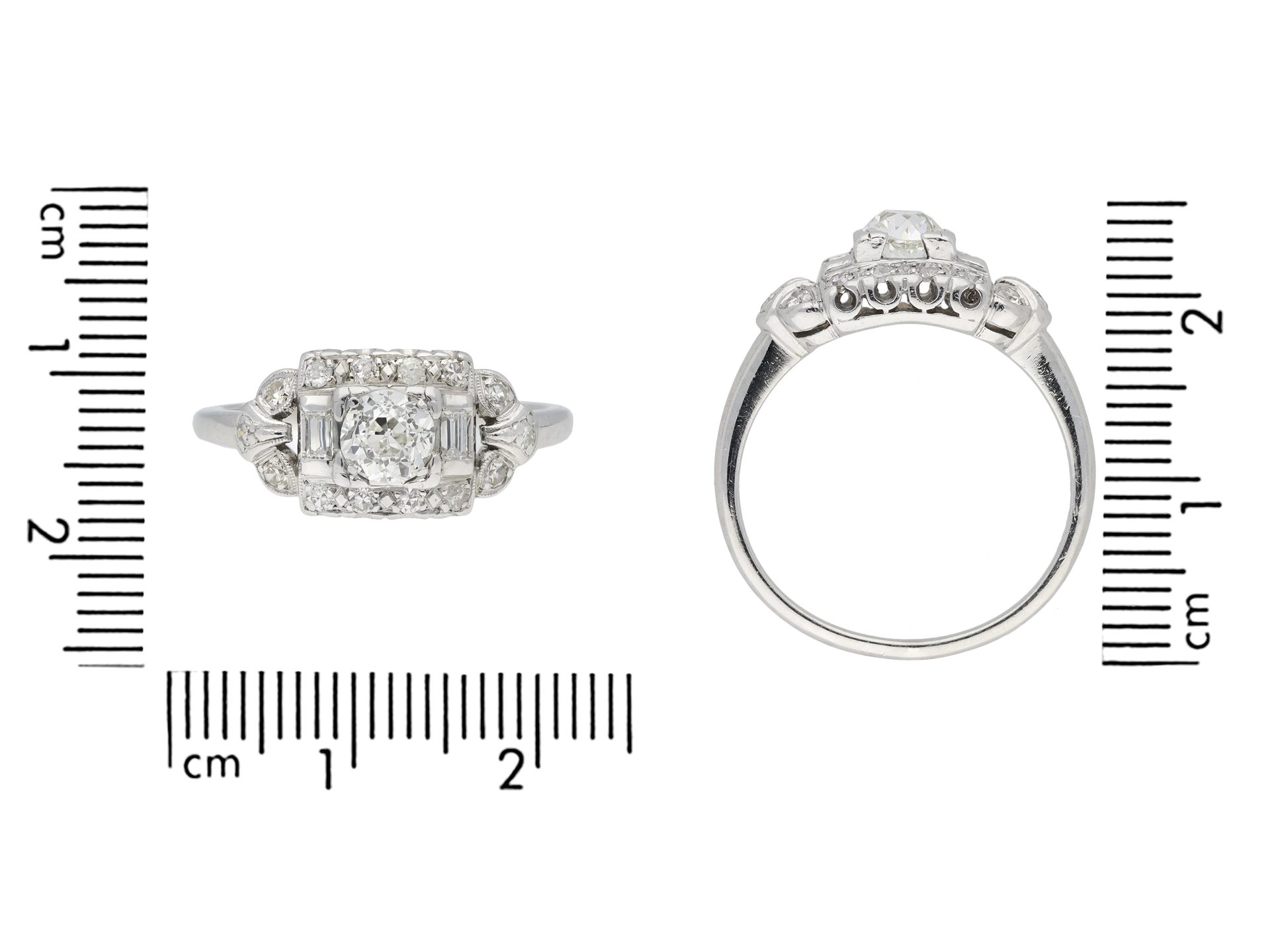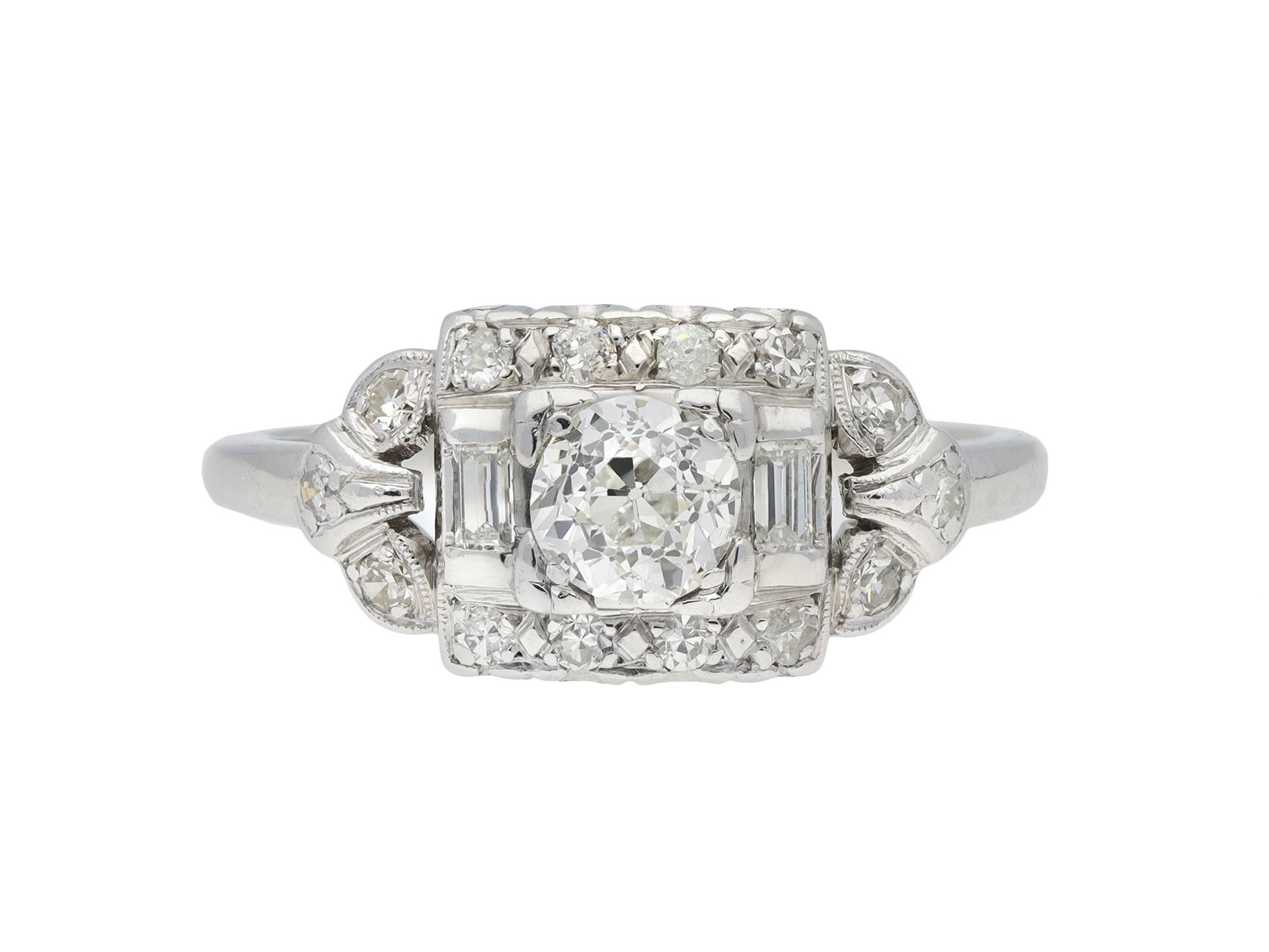 Diamond cluster ring. Set to centre with a round old cut diamond in an open back claw setting with an approximate weight of 0.55 carats, further set with two rectangular baguette cut diamonds in open back rubover settings with a combined weight of 0.10 carats, encircled by fourteen round eight-cut diamonds in open back claw and grain settings with a combined weight of 0.28 carats. The total approximate diamond weight is 0.93 carats, to an openwork cluster design featuring stylised, a pierced scrolling gallery and fancy shape open backholing, flanked by trumpeting shoulders leading to a solid D-shape shank. Marked platinum and iridium, American, circa 1950.