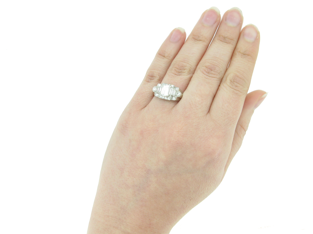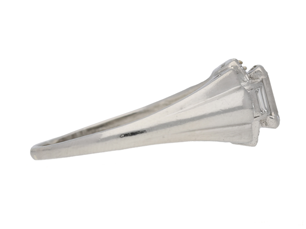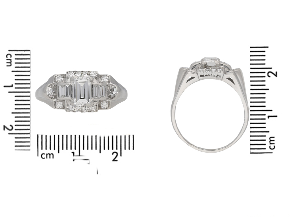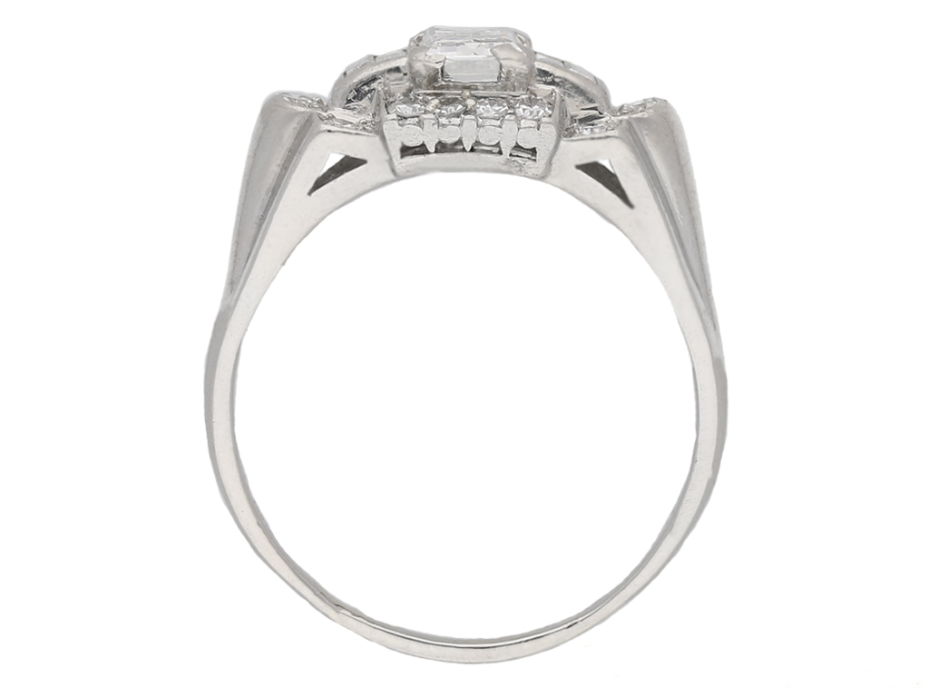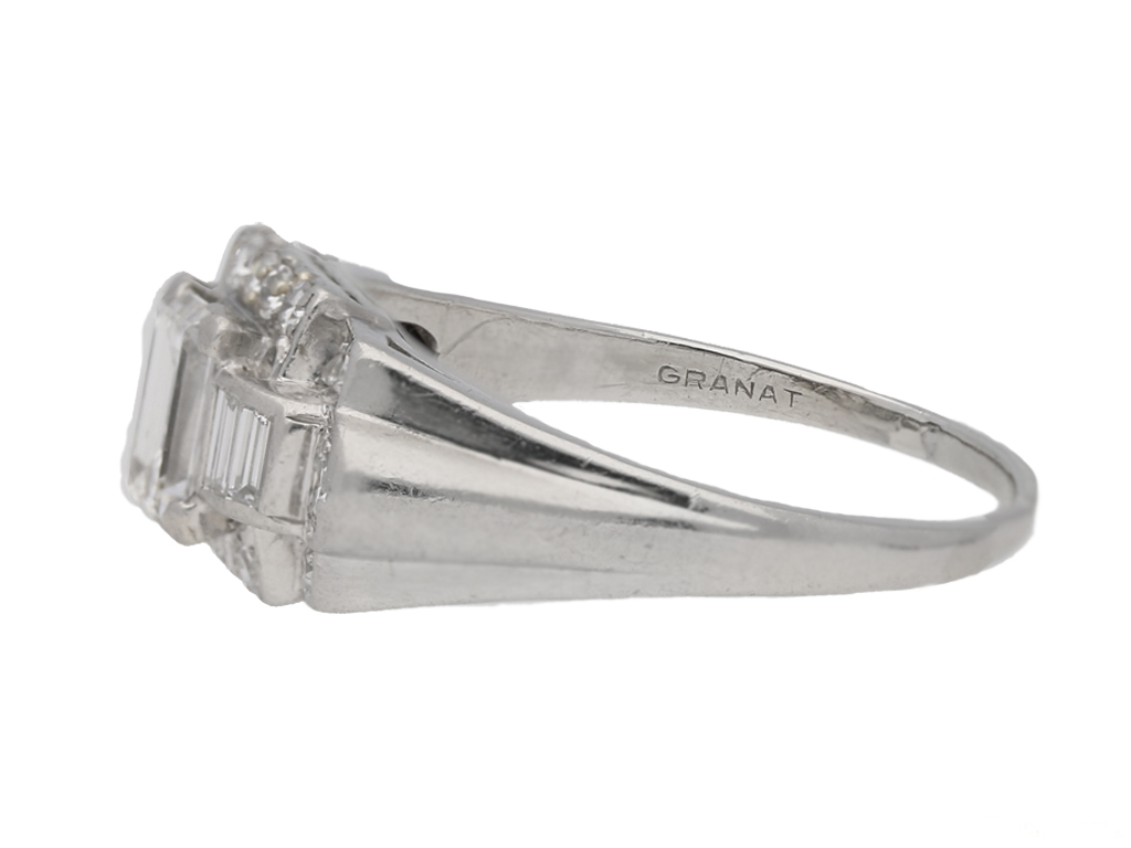 Diamond cluster ring by Granat Bros. Set to centre with a rectangular baguette cut diamond in an open back claw setting with an approximate weight of 0.65 carats, flanked by four rectangular baguette cut diamonds in open back channel settings with a combined weight of 0.30 carats, encircled by fourteen round eight cut diamonds in open back grain settings with a combined weight of 0.50 carats. The total approximate diamond weight is 1.45 carats, to an ornate cluster design featuring polished edges, a finely pierced gallery and open backholing, leading to angular trumpeting shoulders with structured ridged detail and flowing down to a solid D-shape shank. Marked platinum and iridium, signed 'GRANAT' for Granat Bros., American, circa 1950.