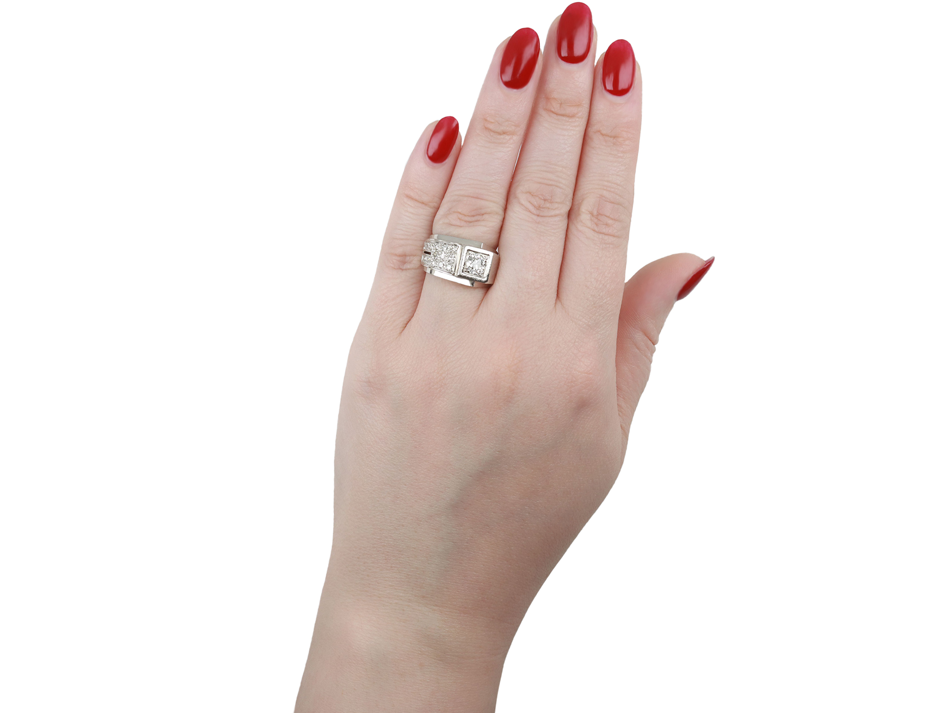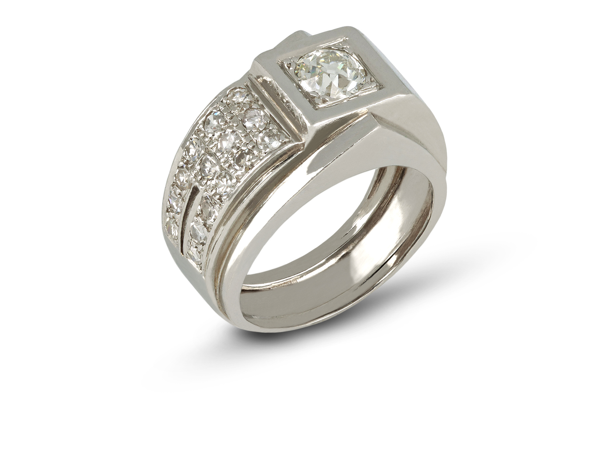 Diamond cocktail ring. Set with a round old cut diamond in an open back grain setting with an approximate weight of 0.75 carats, further enhanced by fifteen round eight cut diamonds in open back grain settings with a combined weight of 0.50 carats. The total approximate diamond weight is 1.25 carats, to a structured asymmetrical cluster ring with a closed gallery and pierced geometric backholing, leading to broad shoulders with ridged detail and flowing through to a solid D-shape shank. Marked platinum, indistinct maker's mark, French, circa 1945.