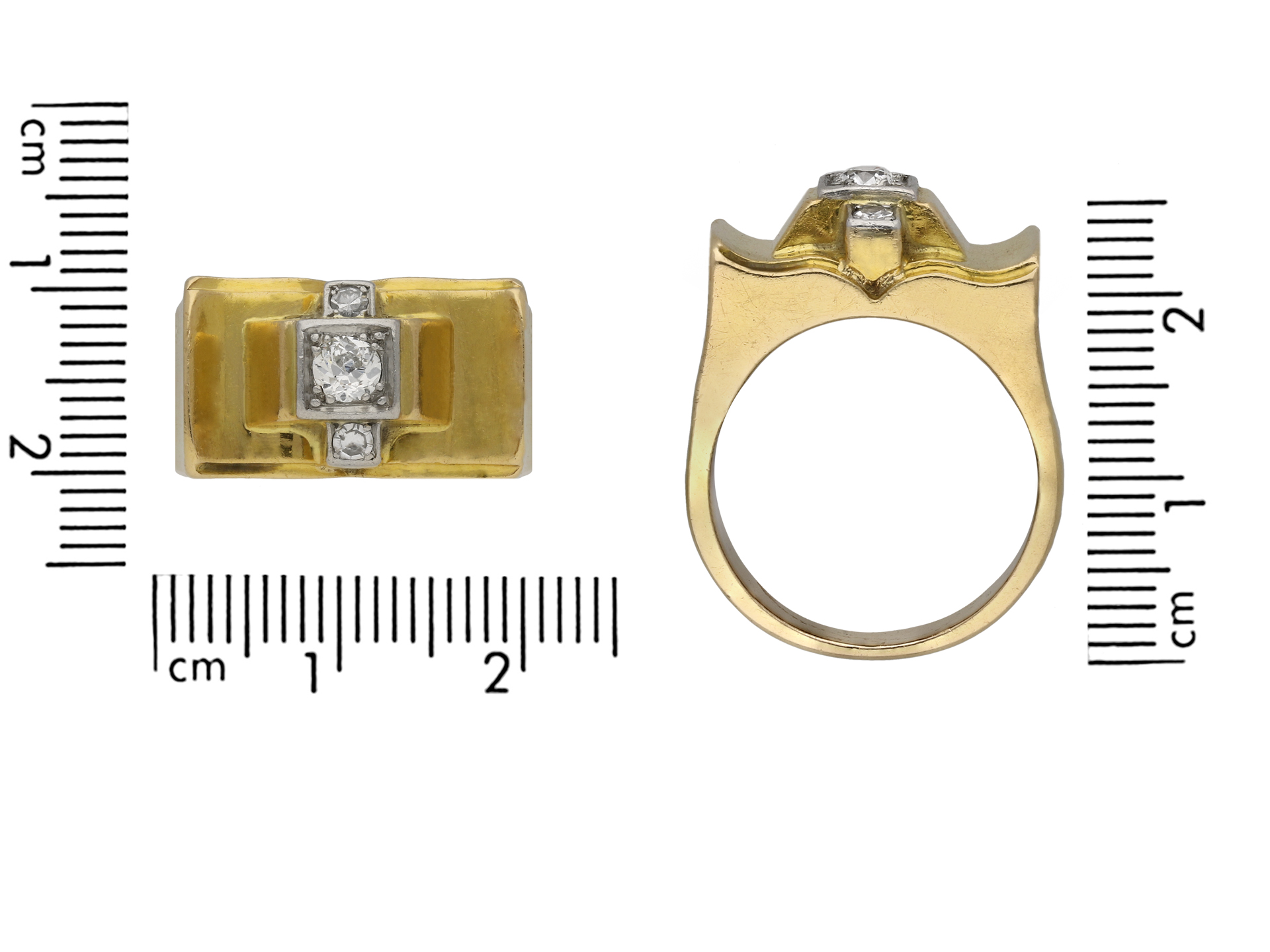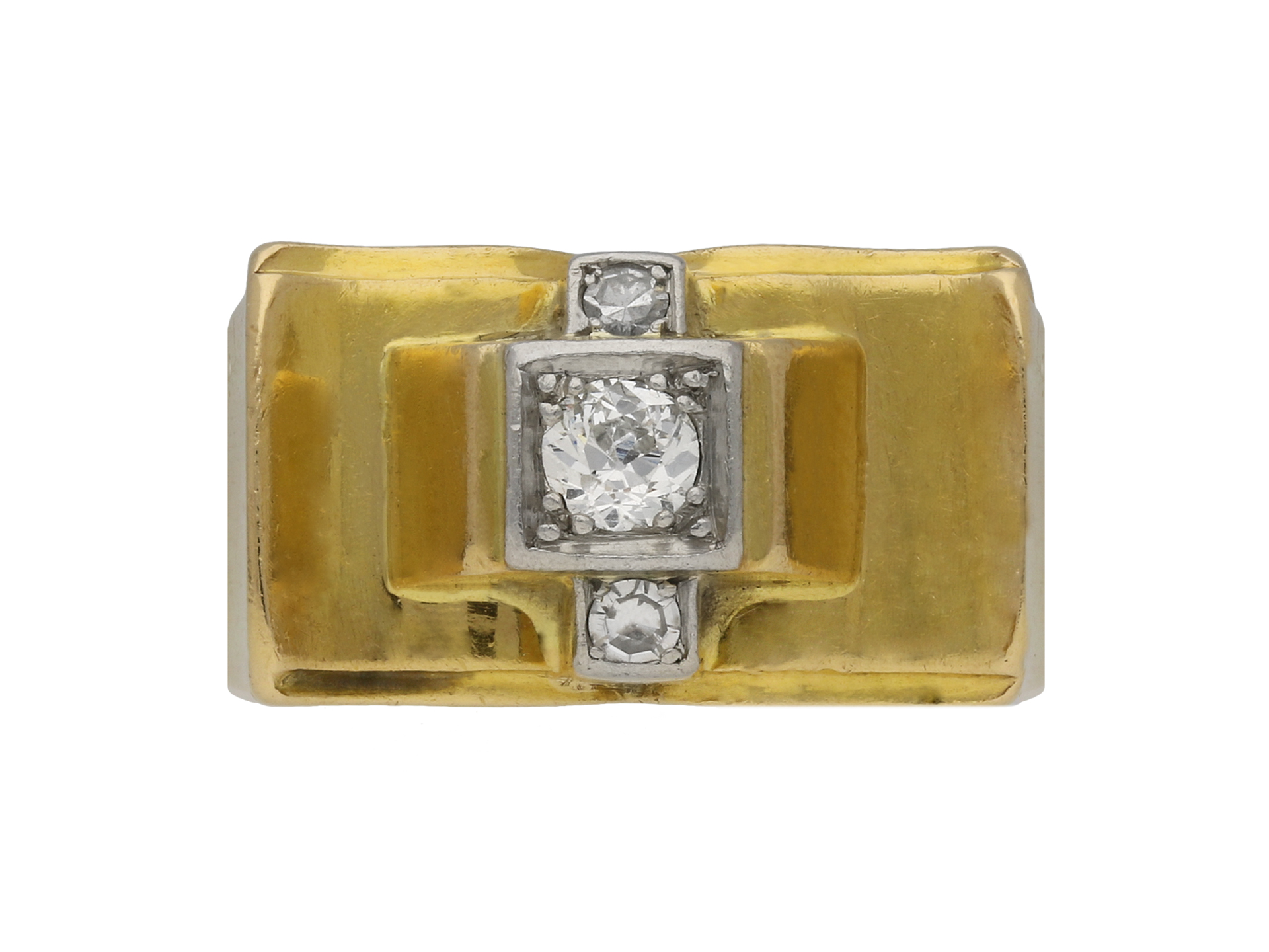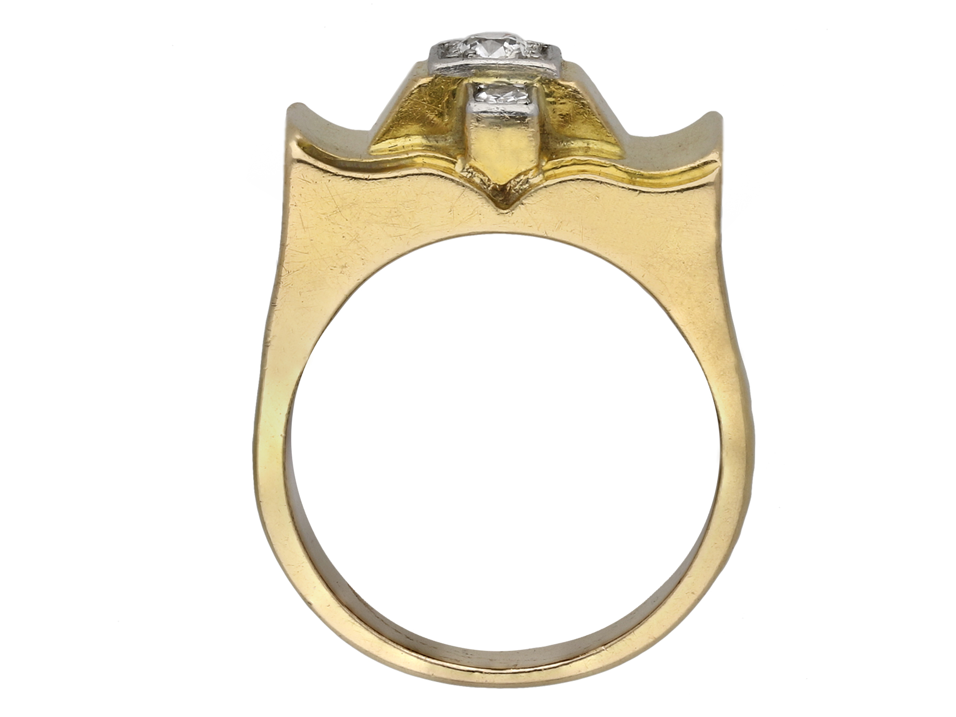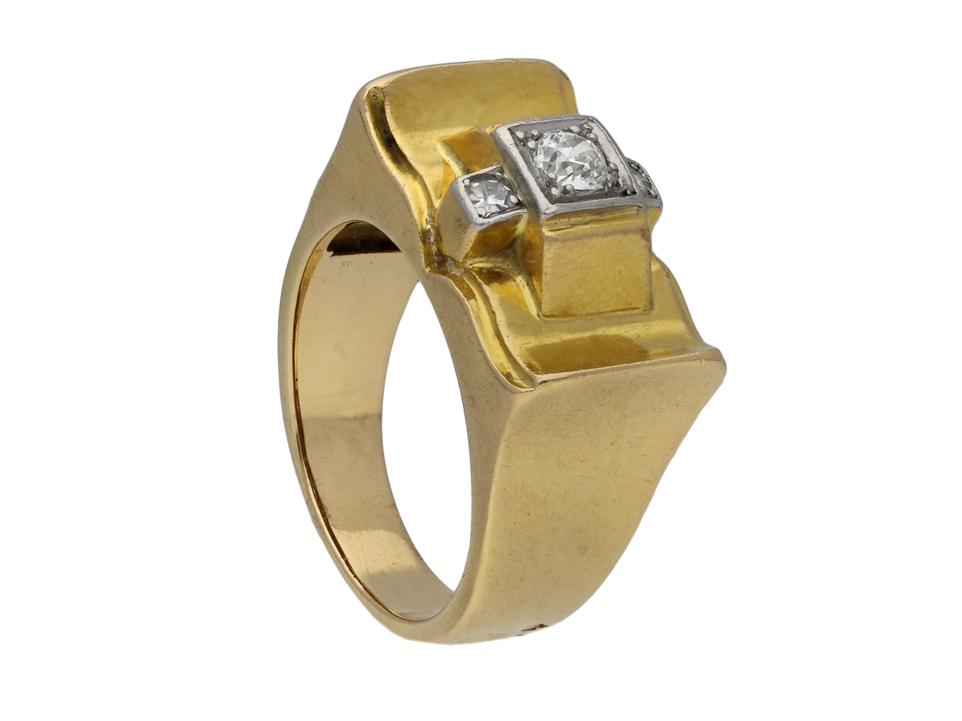 Diamond cocktail ring. Centrally set with a round old cut diamond in an open back grain setting with a weight of 0.30 carats, flanked to top and bottom with two round eight cut diamonds in open back grain settings with a combined weight of 0.06 carats. The total approximate diamond weight is 0.36 carats, to a stylish undulating rectangular plaque featuring a raised centre, incised border and shaped backholing, the broad integrated shoulders curve to a solid shank. Marked 18 carat yellow gold and platinum, French, circa 1940.