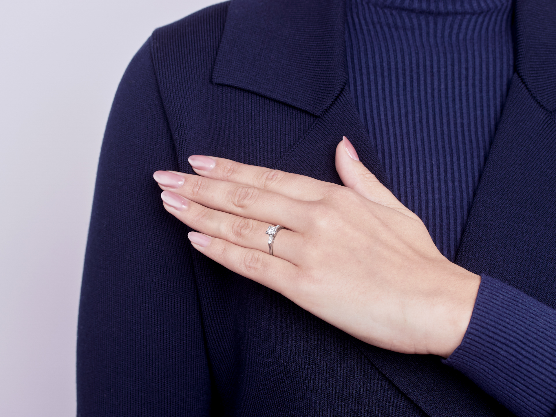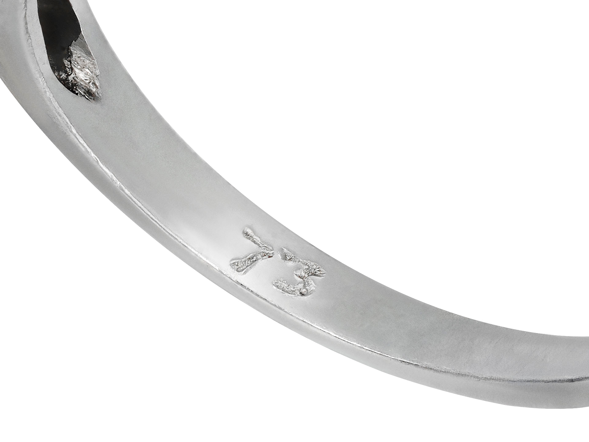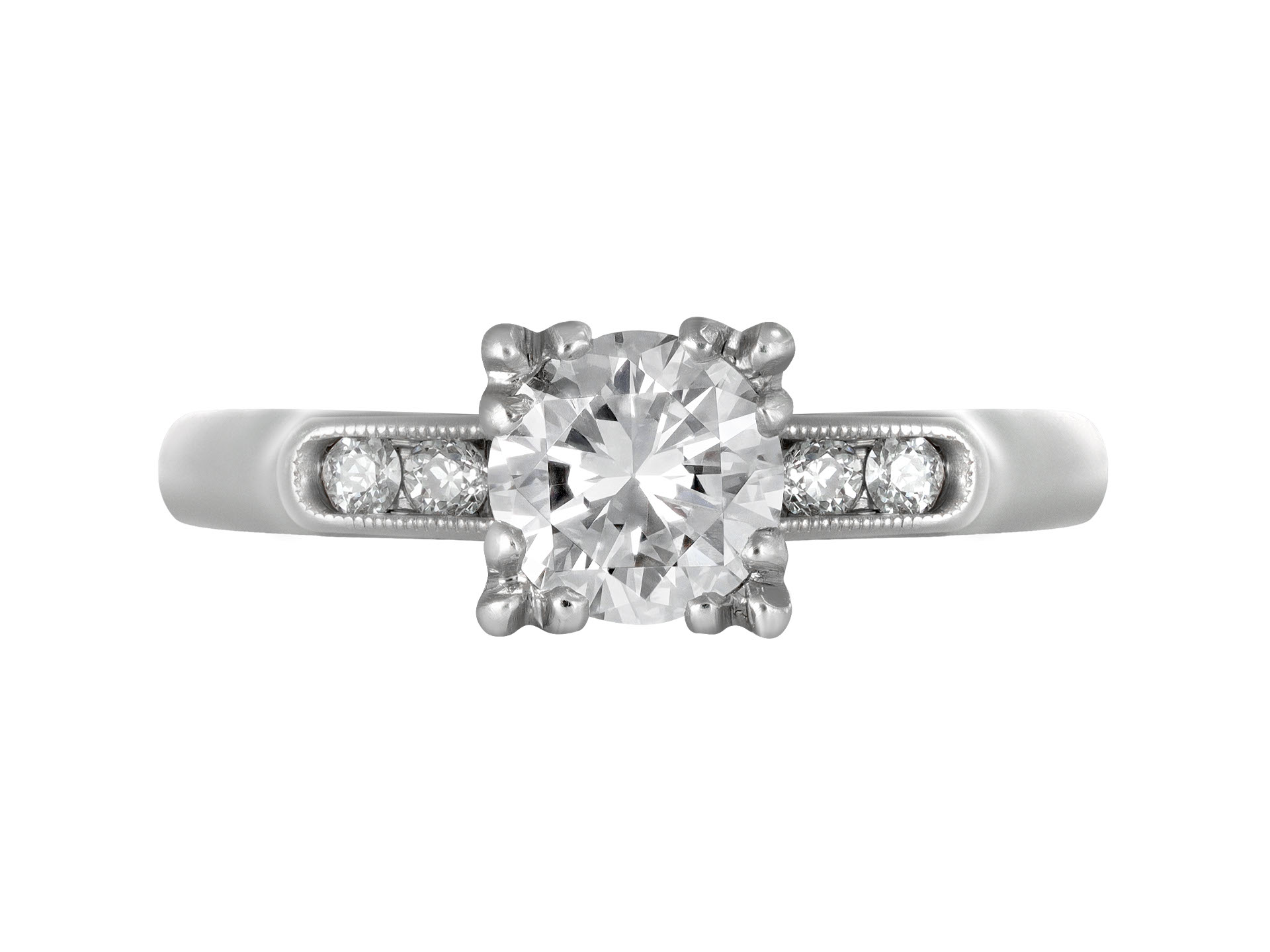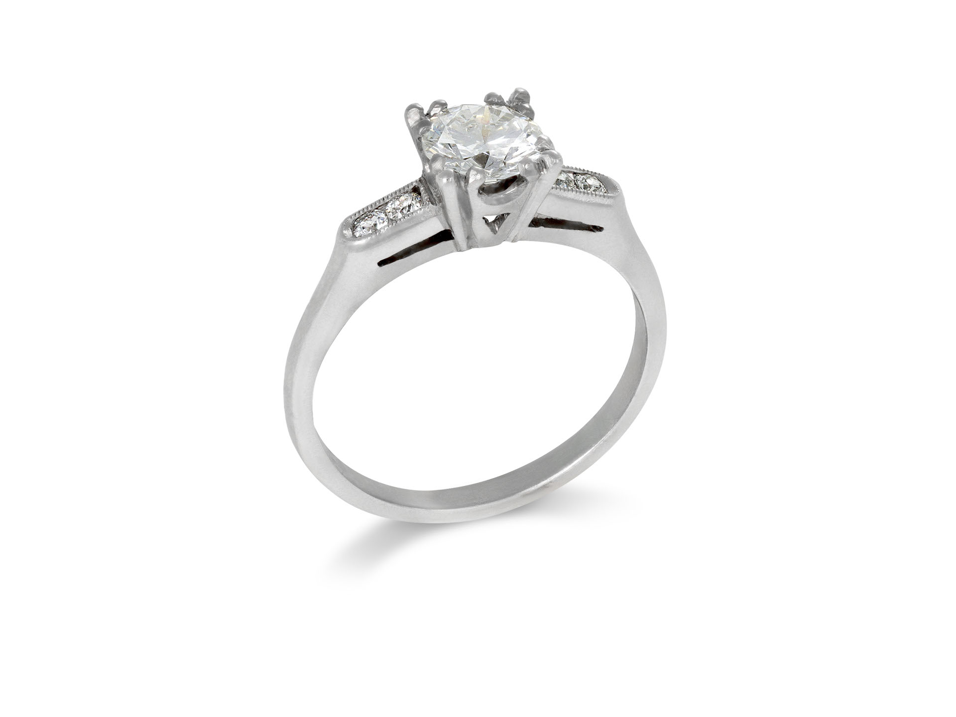 Diamond flanked solitaire ring. Set with a round old cut diamond in an open back claw setting with an approximate weight of 0.75 carats, flanked by four round old cut diamonds in open back channel settings with a combined weight of 0.08 carats. The total approximate diamond weight is 0.83 carats, to a geometric flanked design featuring structured corner claws, a pierced gallery and open backholing, the slightly raised open shoulders with fine millegrain decoration flow through to a solid D-shape shank. Marked platinum and iridium, numbered '73', American, circa 1950.