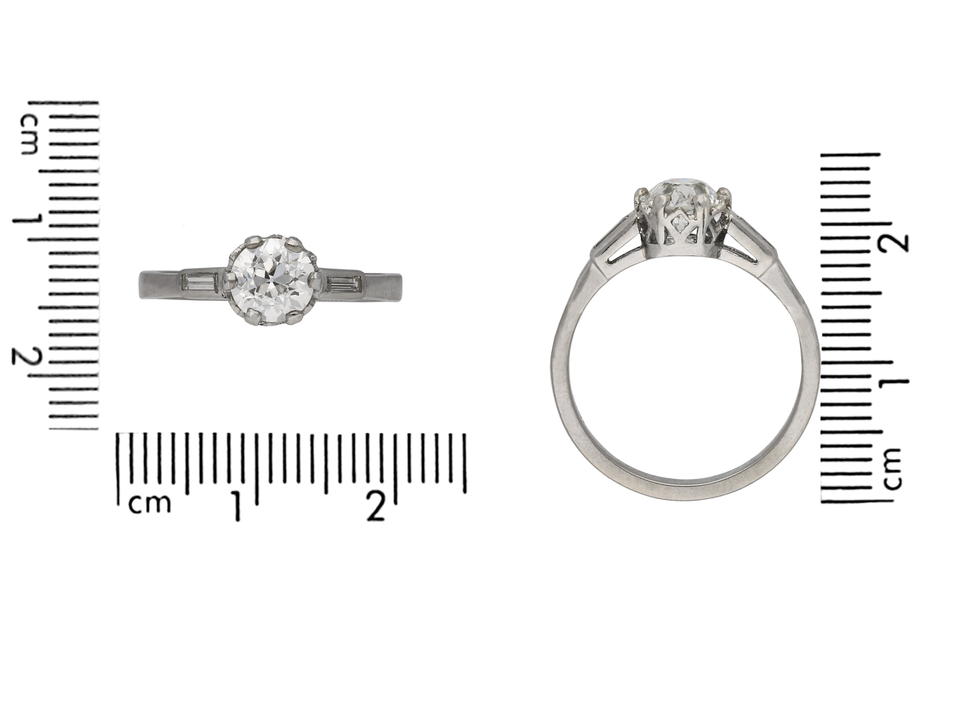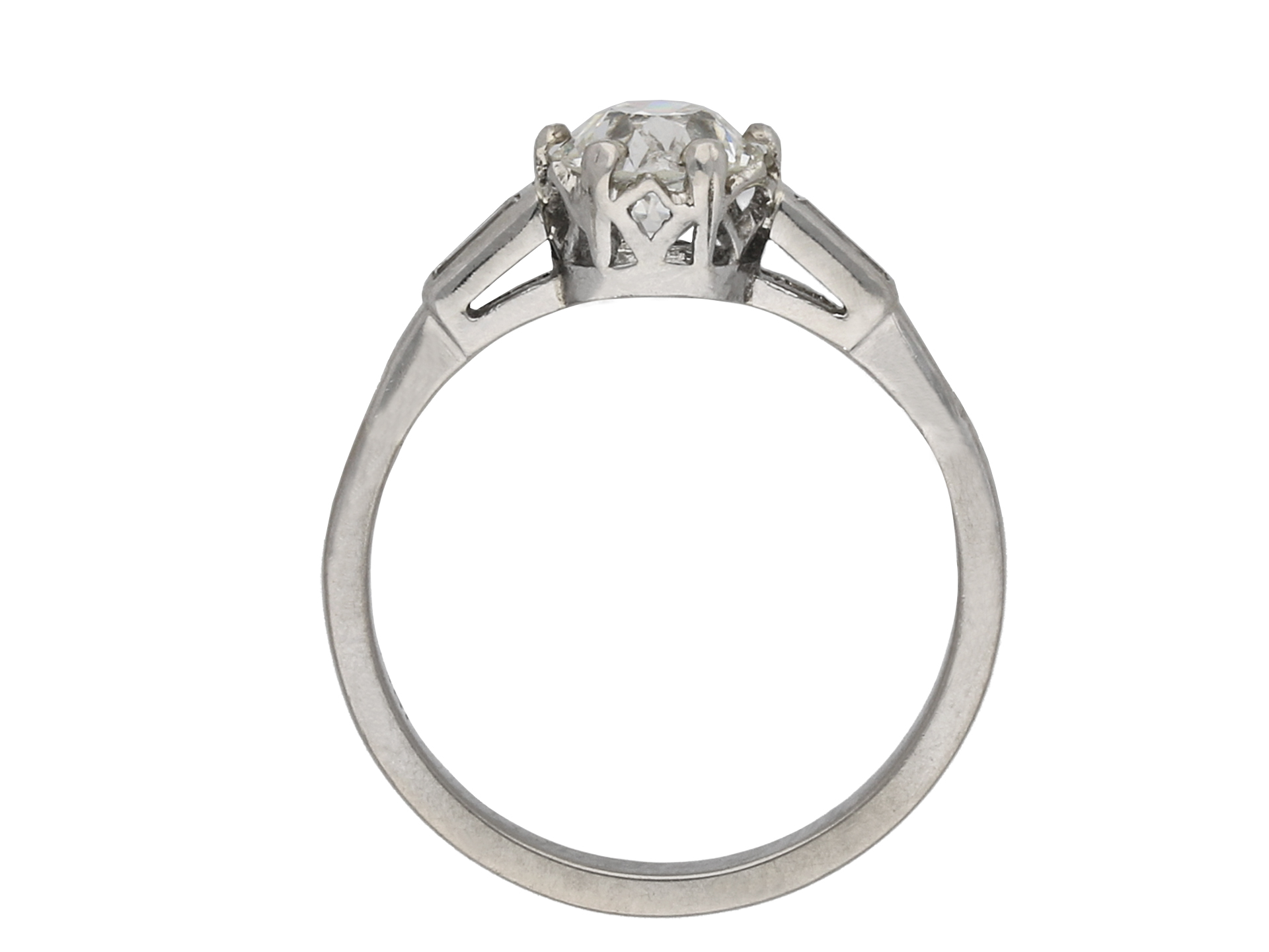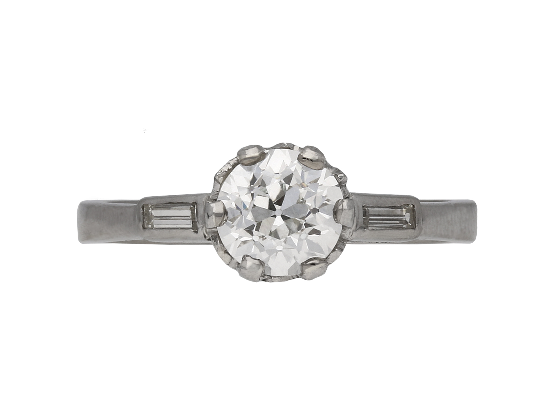 Diamond flanked solitaire ring. Set to centre with a round old cut diamond in an open back claw setting with an approximate weight of 0.95 carats, further set with two rectangular baguette cut diamonds in open back rubover settings with a combined weight of 0.08 carats. The total approximate diamond weight is 1.03, to an elegant flanked solitaire design featuring curving claws, a geometrically pierced gallery and fancy shape open backholing, flanked by openwork raised shoulders flowing through to a solid flat shank. Marked 18 carat white gold, tested platinum, English, circa 1920.