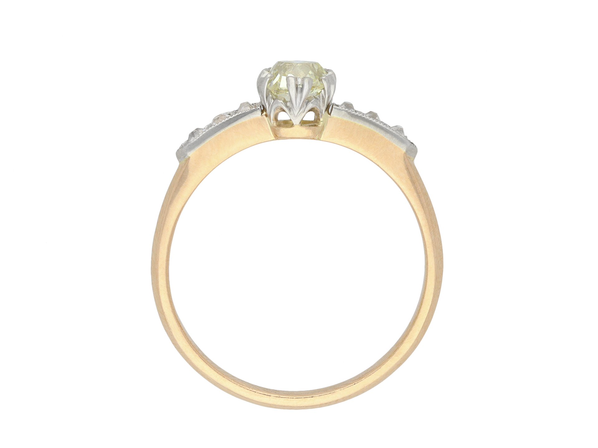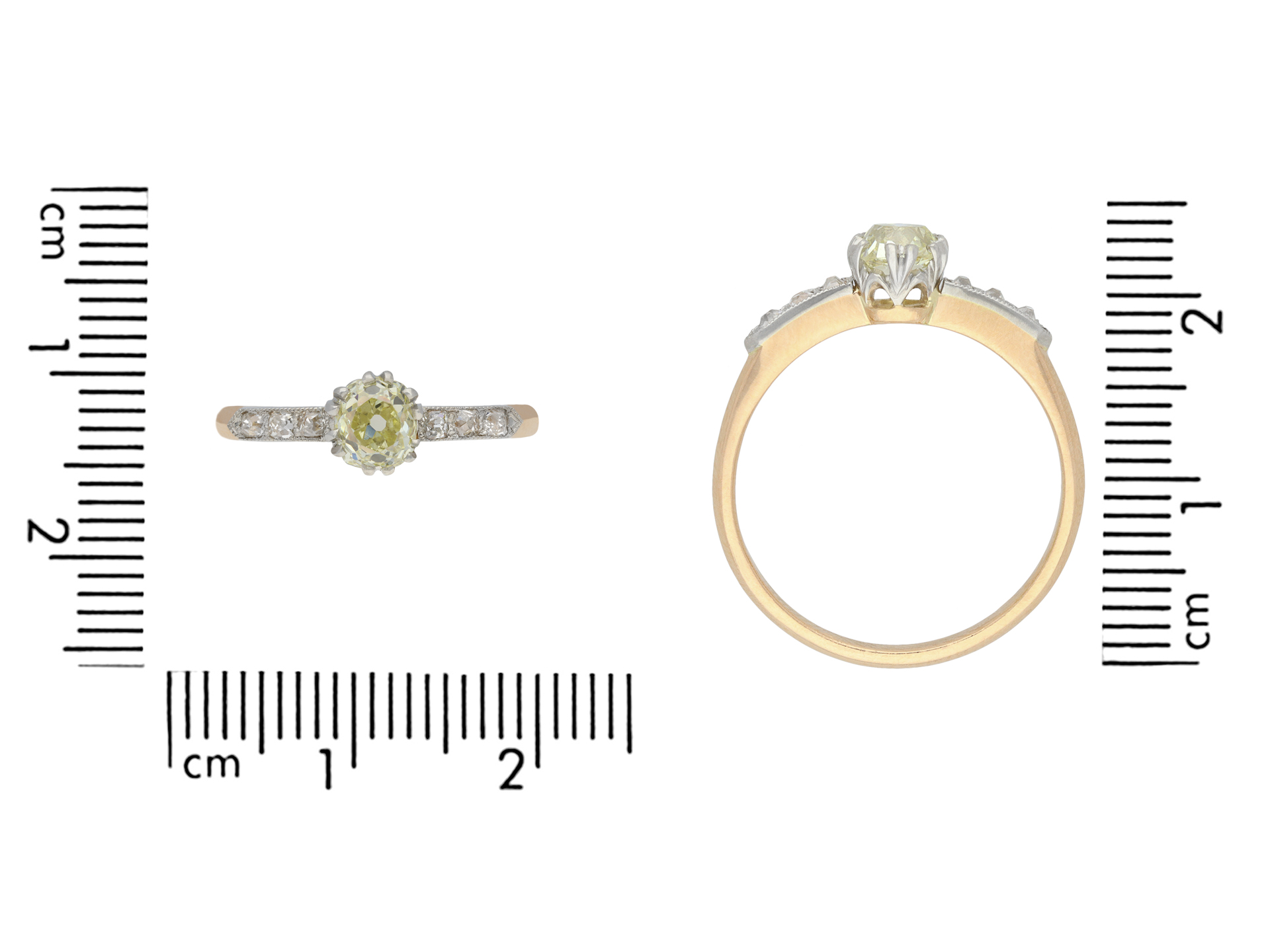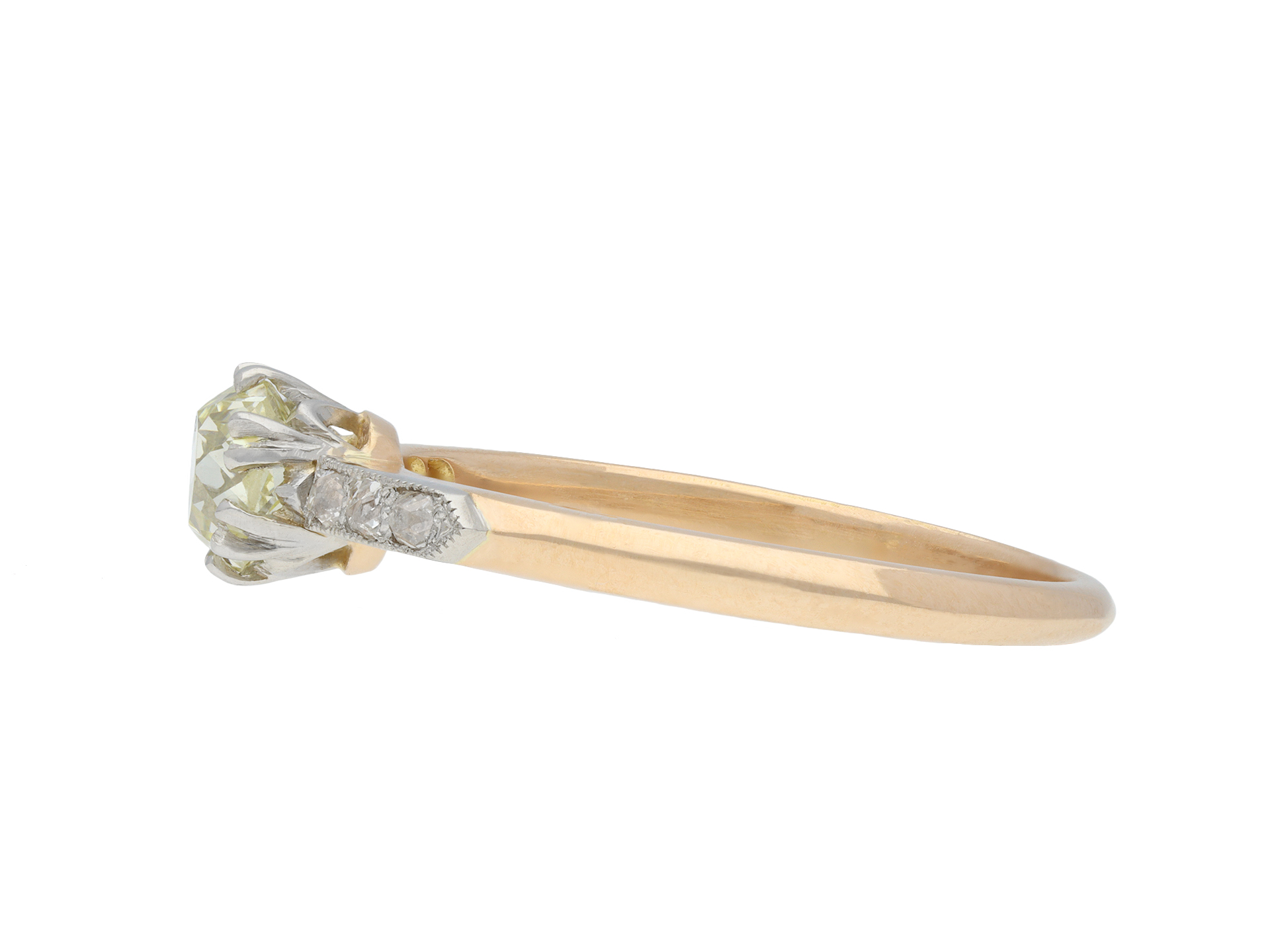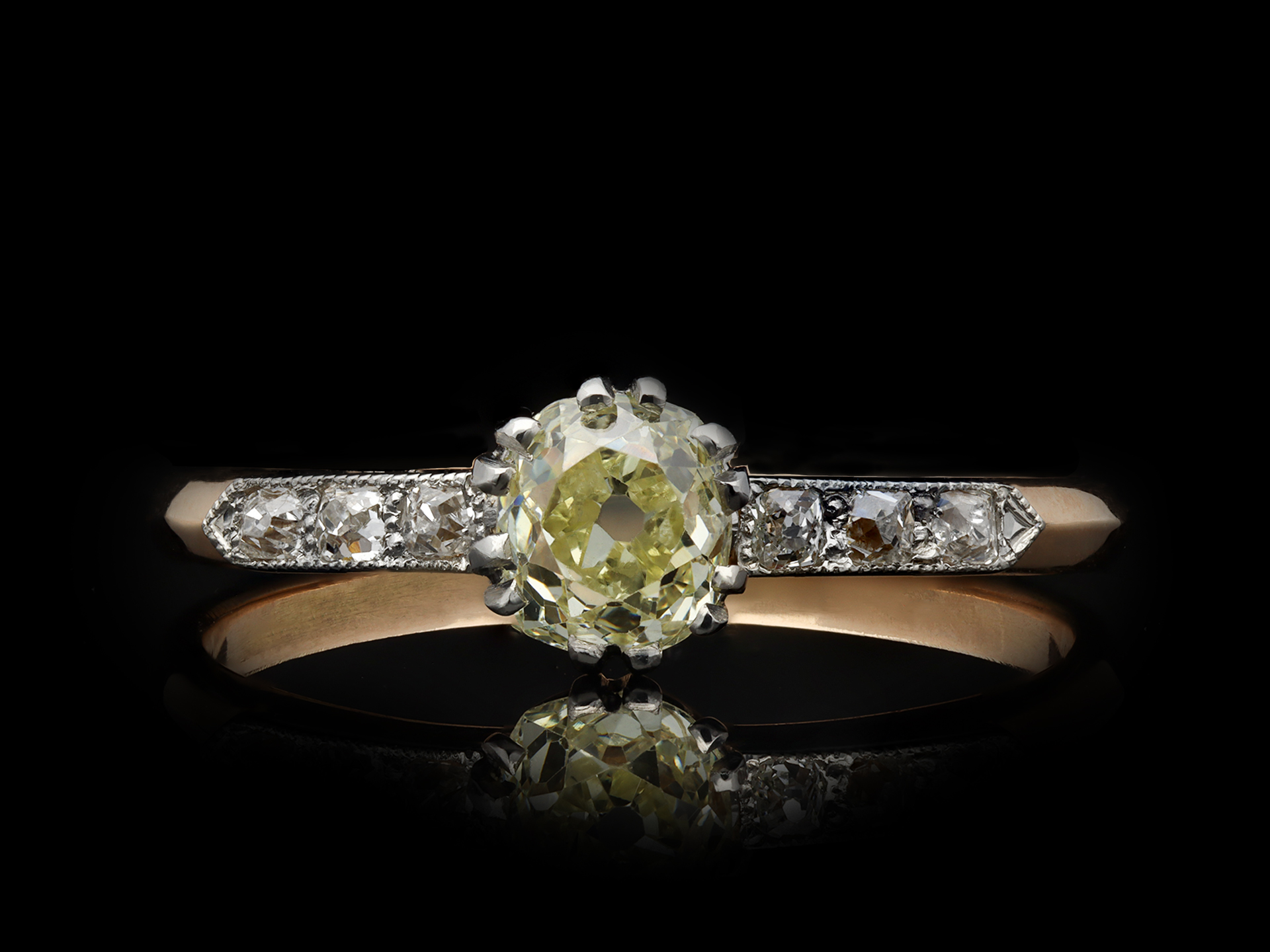 Diamond flanked solitaire ring. Set to centre with a cushion shape old mine diamond in an open back claw setting with an approximate weight of 0.60 carats, flanked by six cushion shape old mine diamonds in open back grain settings with a combined weight of 0.12 carats. The total approximate diamond weight is 0.72 carats, to an elegant flanked solitaire design featuring split curving claws and millegrain edging, a pierced openwork gallery and fancy open backholing, the raised shoulders flowing through to a solid D-shape shank. Tested rose gold, settings tested platinum, circa 1915.