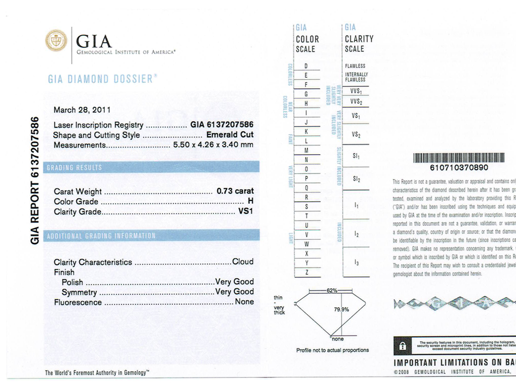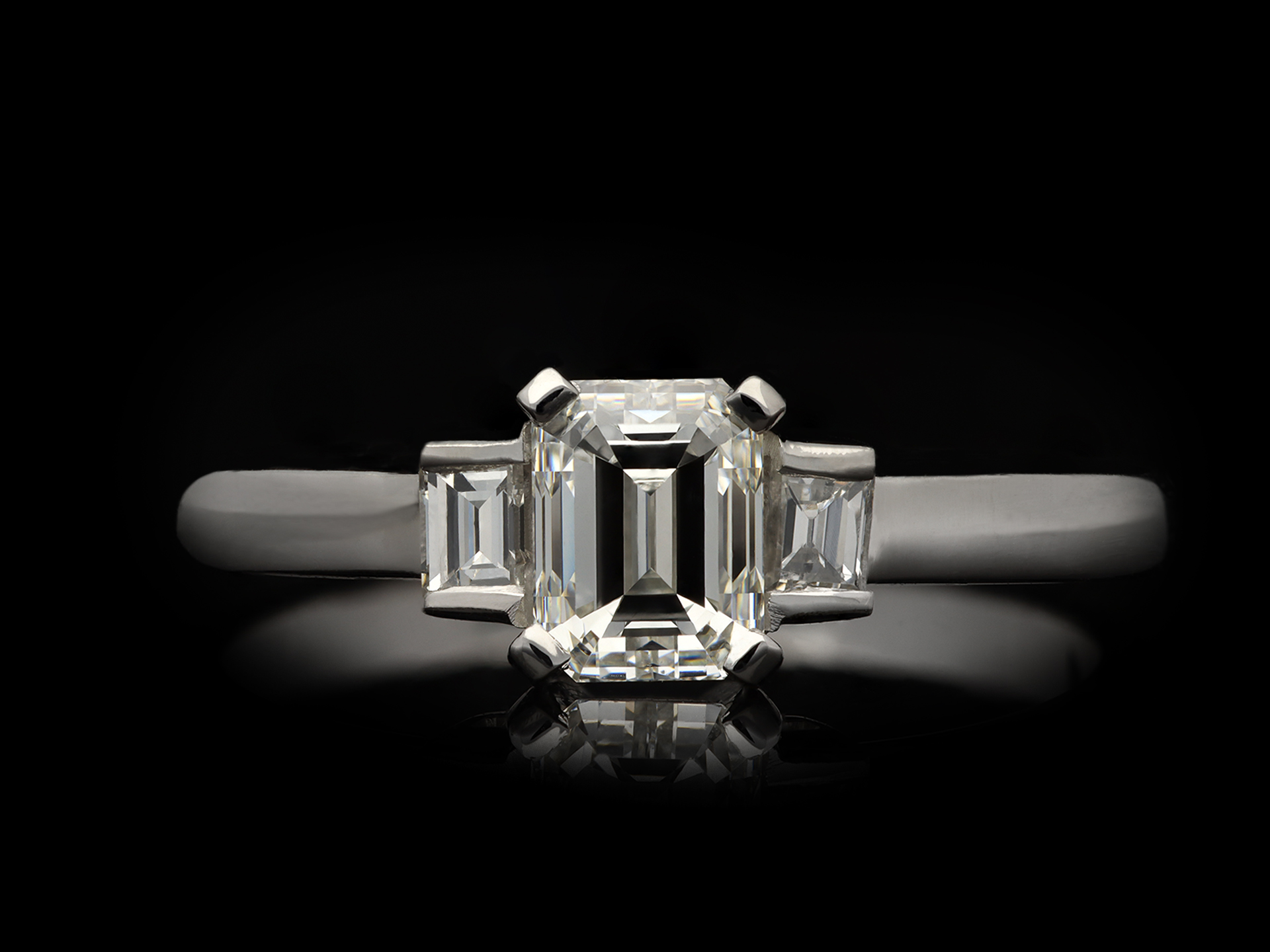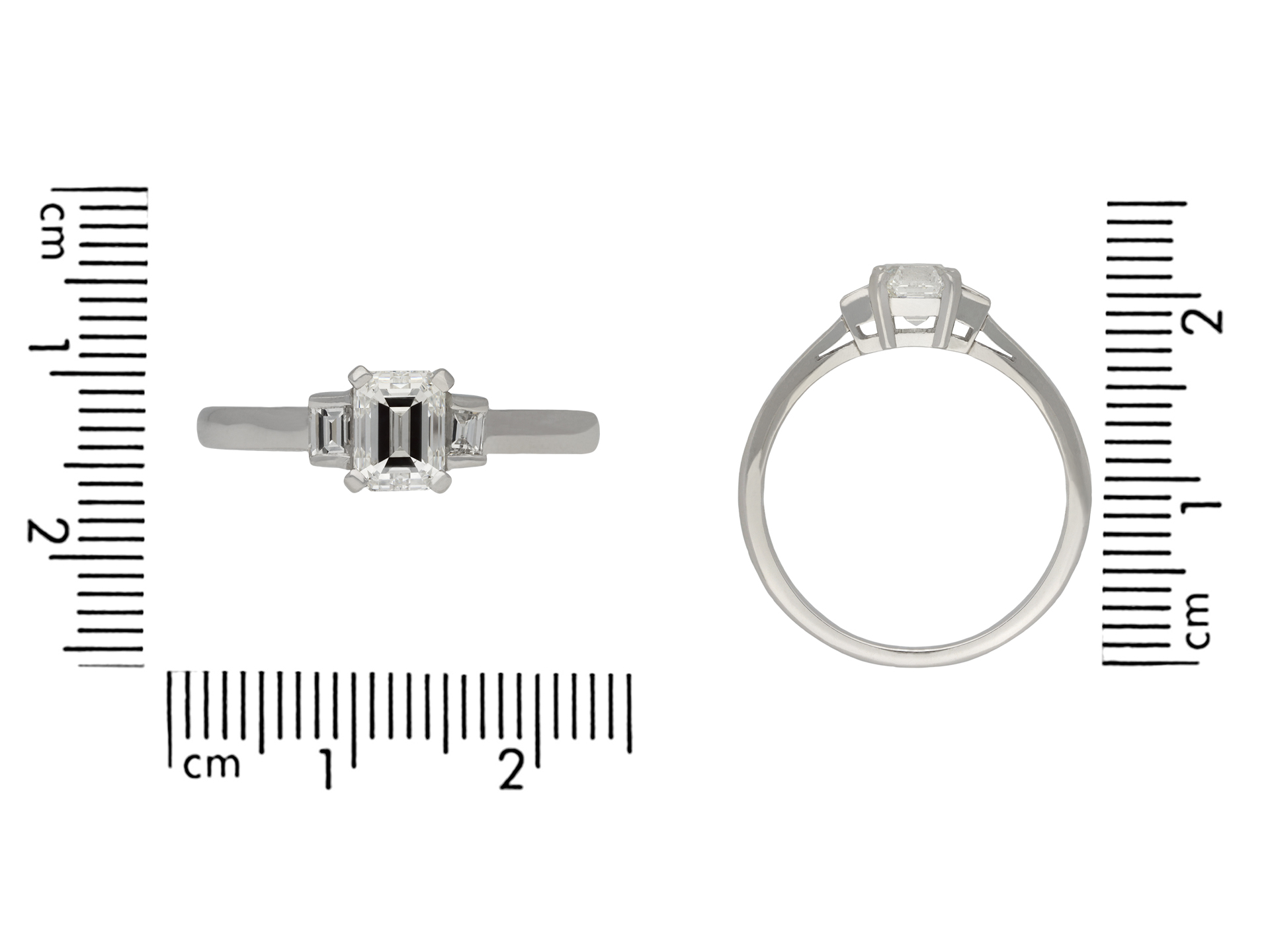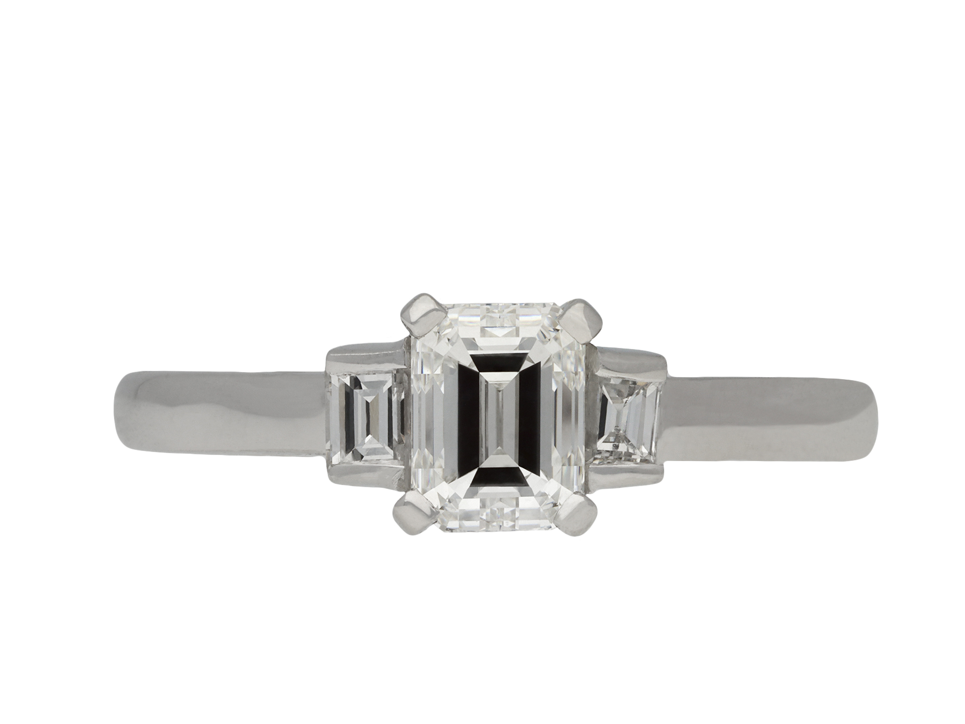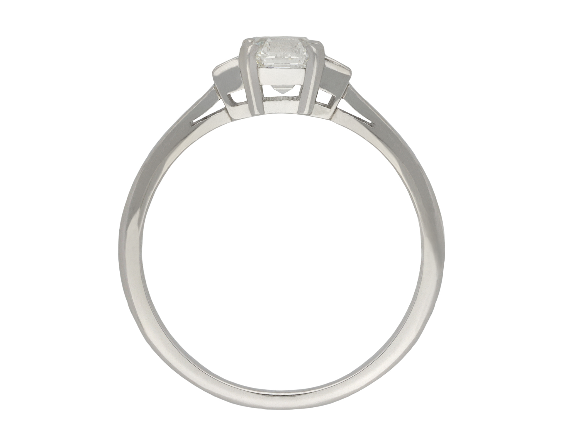 Diamond ring. Centrally set with an octagonal emerald-cut diamond, H colour, VS1 clarity, with a weight of 0.73 carats, in an open back claw setting, flanked by two baguette cut diamonds in open back half rubover settings with a combined weight of 0.16 carats. The total approximate diamond weight is 0.89 carats, to a geometric flanked solitaire design featuring curving corner claws, an openwork gallery and rectangular backholing, leading to slightly raised smooth shoulders and flowing through to a solid lightly rounded shank. Tested platinum, circa 1935, accompanied by Gemological Institute of America (GIA) report #6137207586.