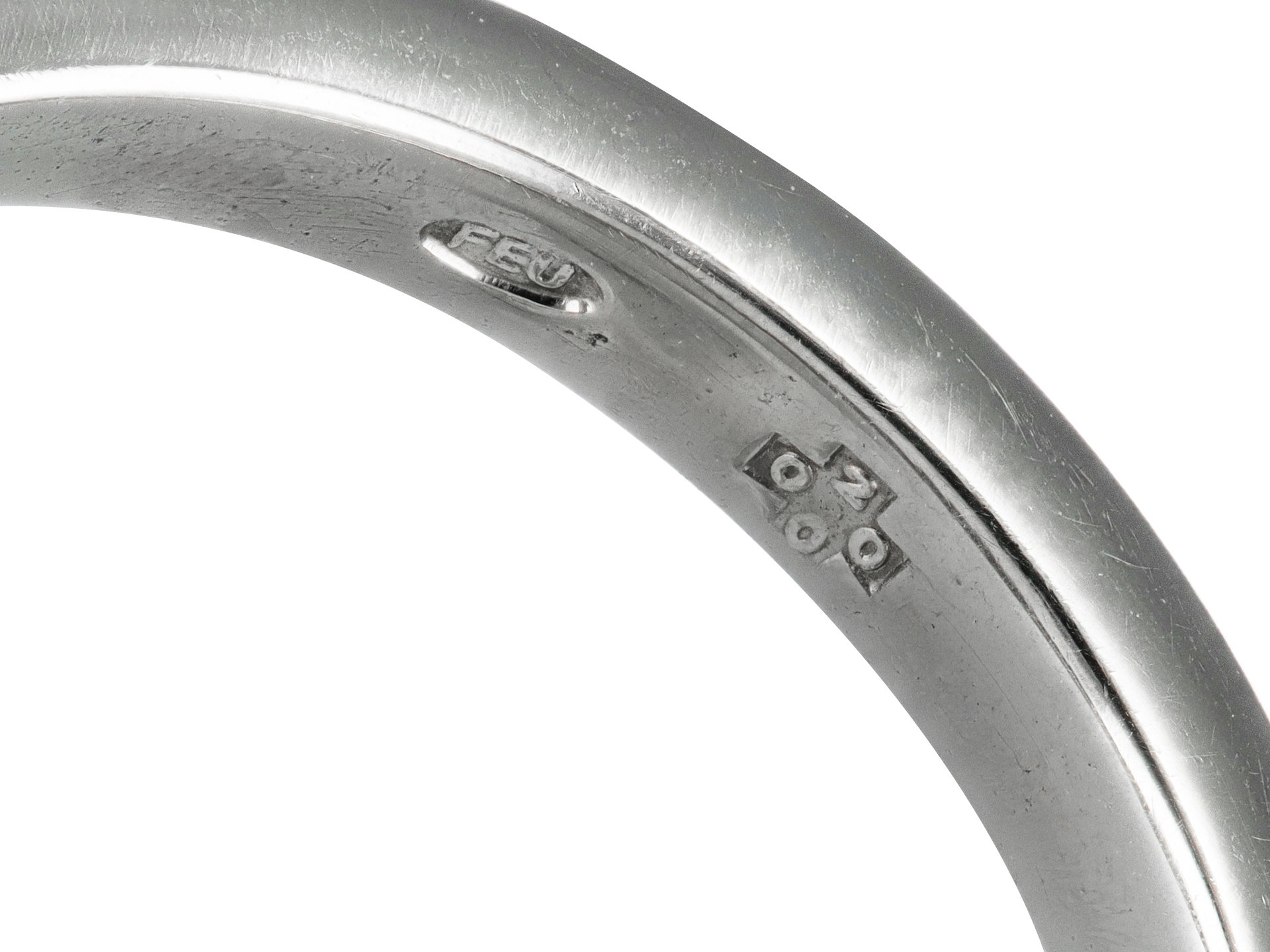 Diamond solitaire ring. Set to centre with a round brilliant cut diamond in an open back rubover setting with an approximate weight of 0.60 carats, to an elegant solitaire design featuring polished edges, a rounded collet and circular open backholing, flanked by broad shoulders flowing to a solid D-shaped shank. Marked platinum, full English hallmarks, maker's mark, with '2000' hallmark commemorating the Millenium, 1999.