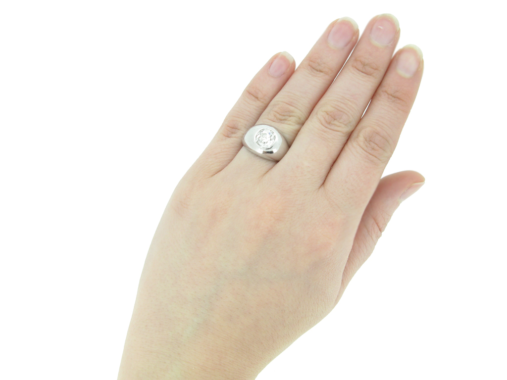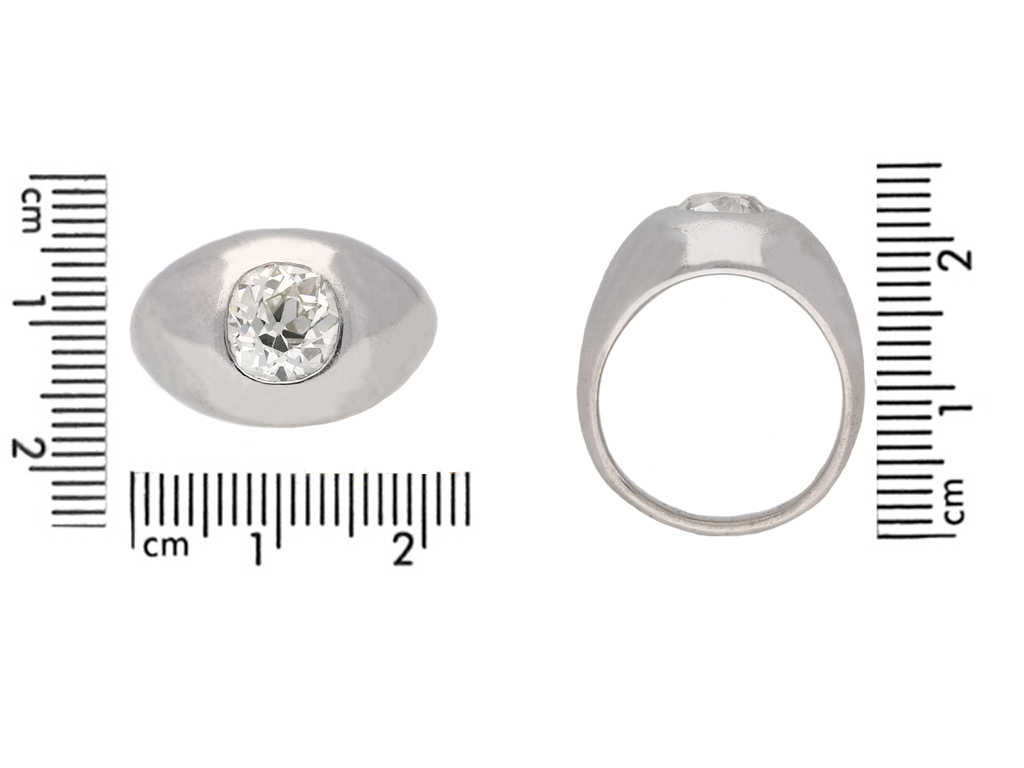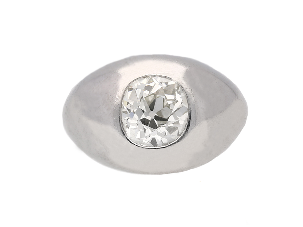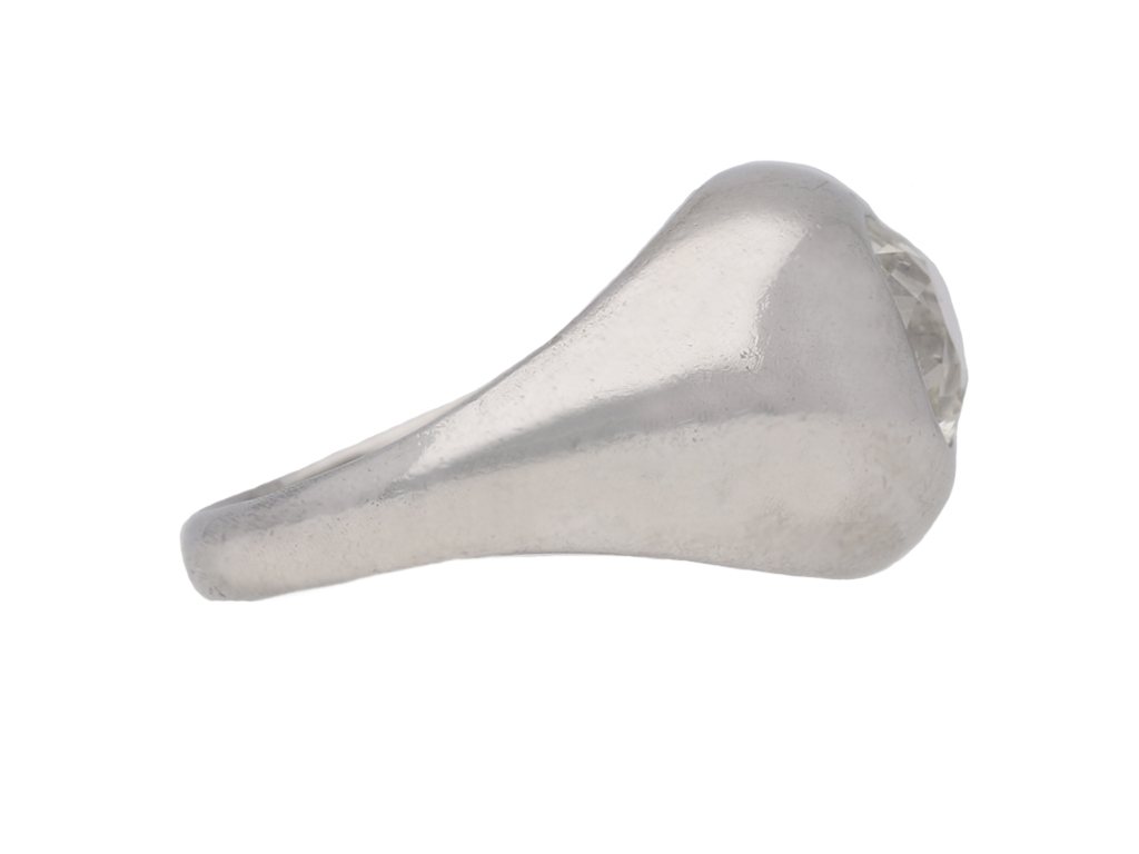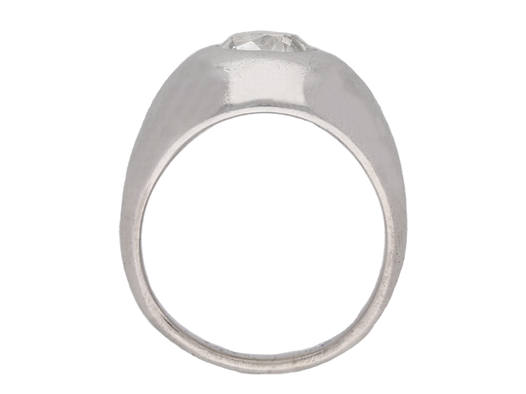 Diamond solitaire ring. Set to centre with a cushion shape old mine diamond in an open back rubover gypsy setting with an approximate weight of 2.00 carats, to a heavy bombé design with polished edges and round open backholing, flanked by smoothly conforming shoulders flowing through to a solid tapering D-shape shank. Marked platinum, indistinct maker's mark, French, circa 1930.