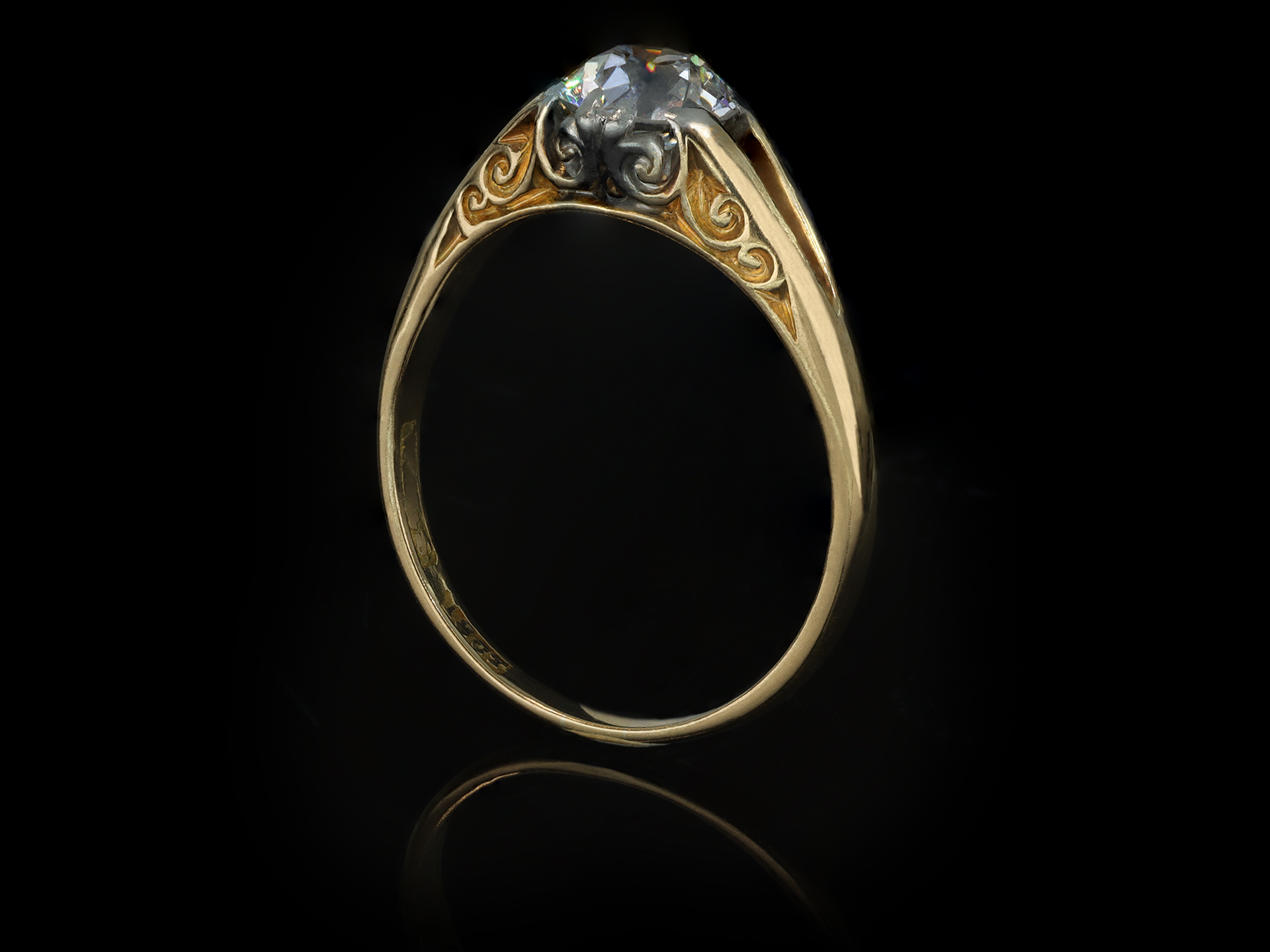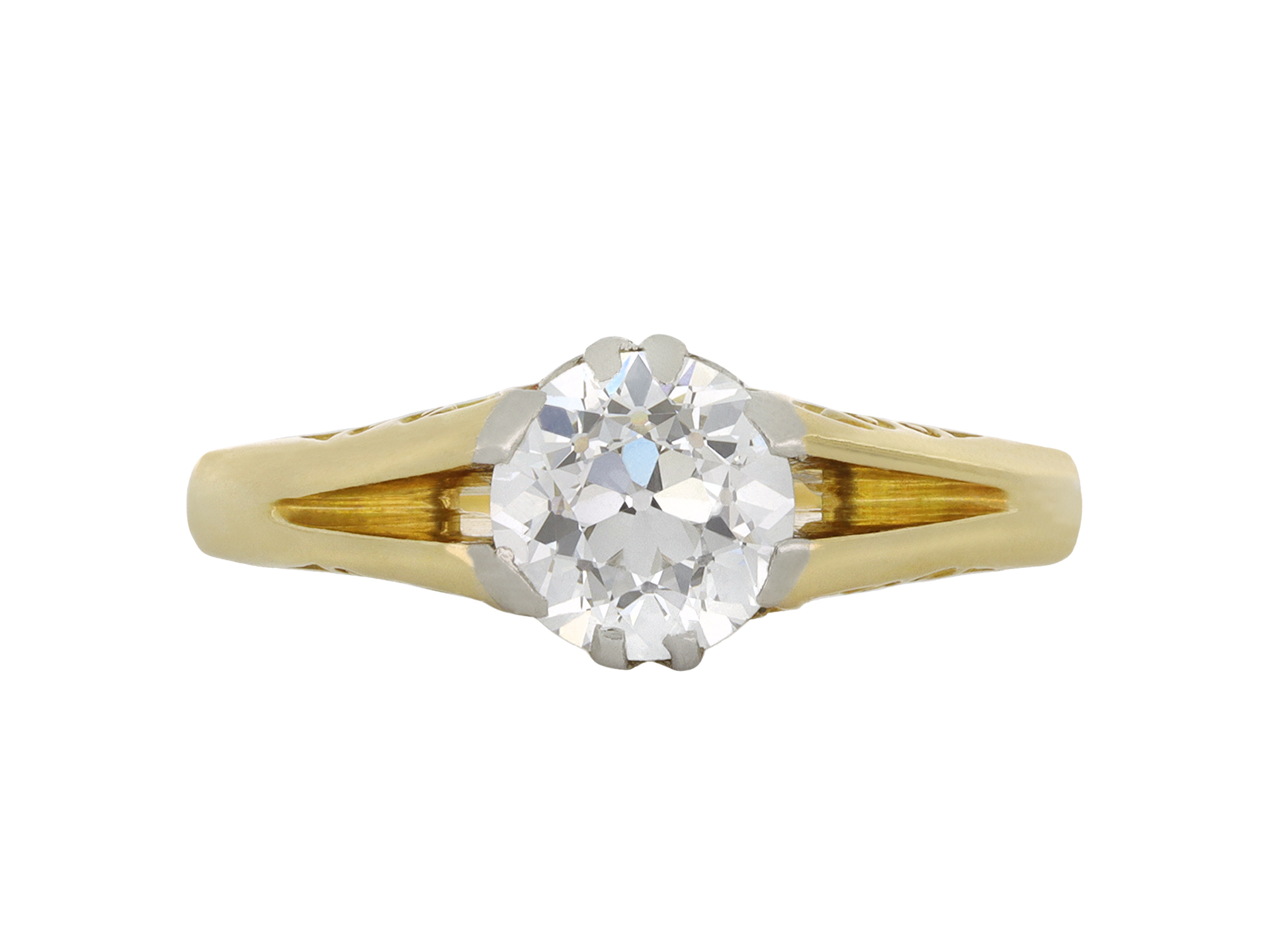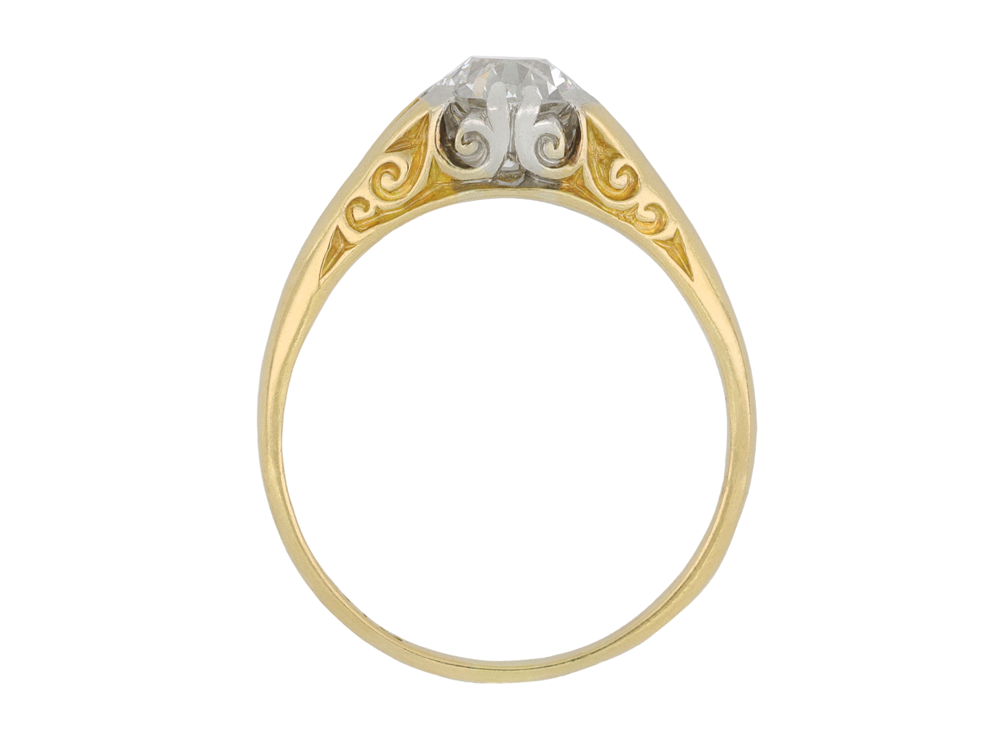Diamond solitaire ring. Set to centre with a round old cut diamond, in an open back claw setting, with an approximate weight of 1.15 carats, to an impressive solitaire design with curving claws, an intricately carved gallery with scrolling motifs, open backholing and raised split shoulders which flow through to a solid D-shape shank. Marked 18 carat yellow gold and tested platinum, maker's mark 'W.B.& S.', likely attributed to William Bruford & Sons, circa 1905.