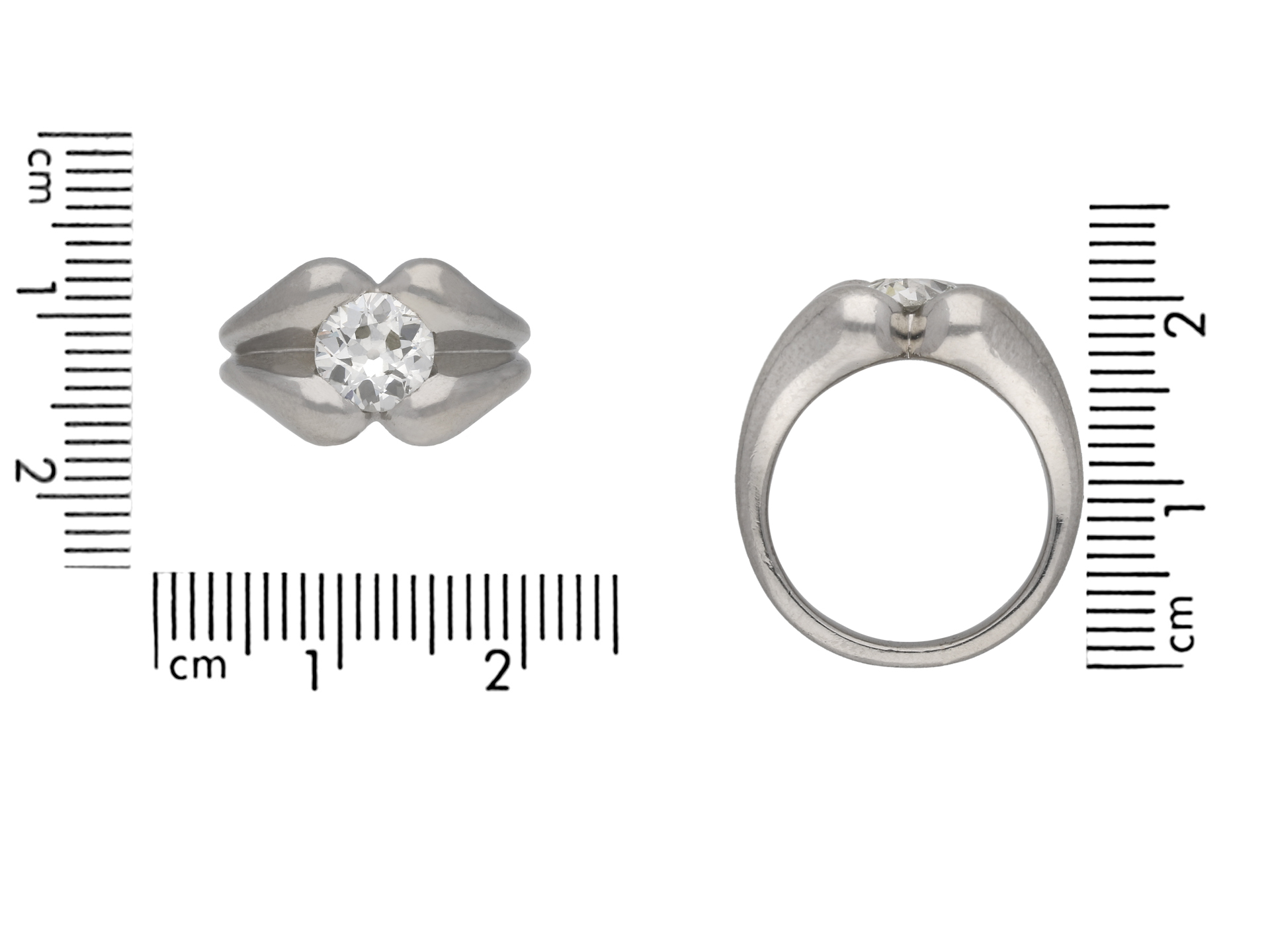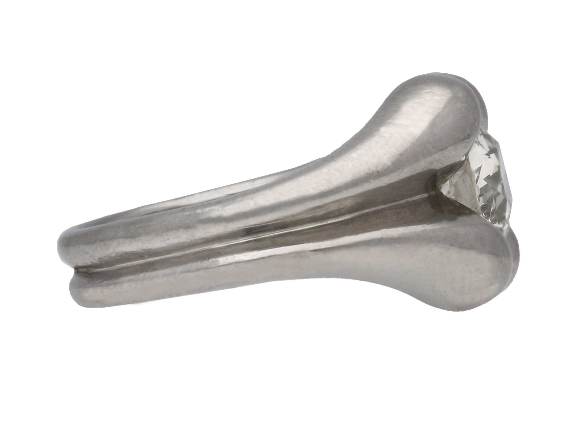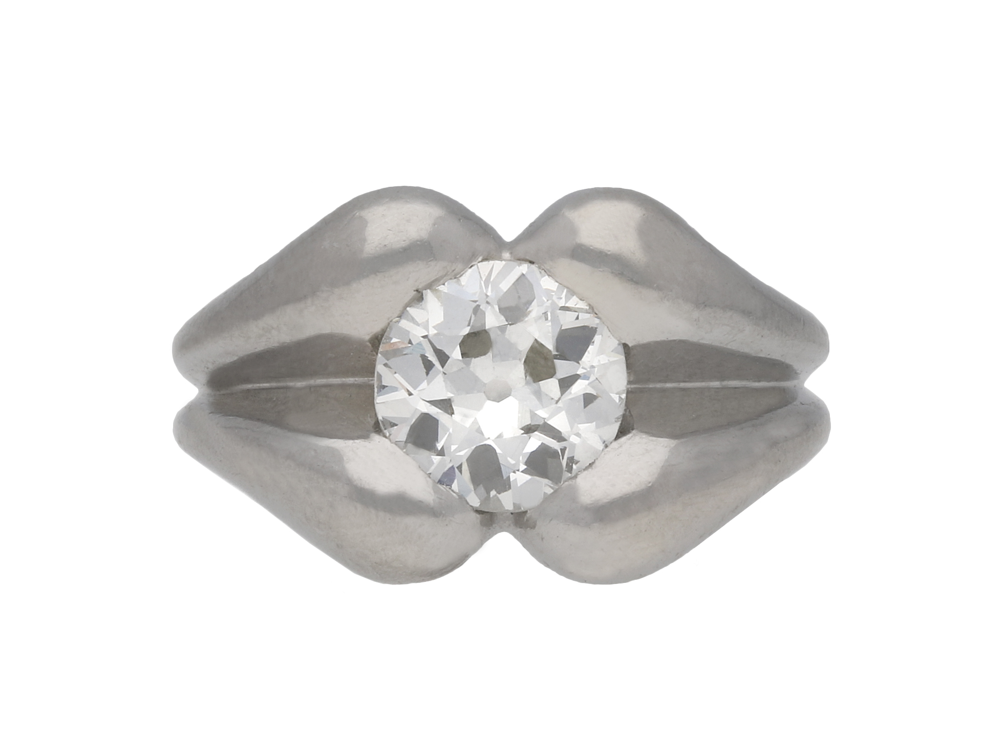 Diamond solitaire ring. Set to center with a round old cut diamond in an open back claw setting with an approximate diamond weight of 1.20 carats, to a statement solitaire design featuring stylised corner claws, smooth polished sculptural borders and circular open backholing, leading to broad trumpeting shoulders and flowing through to a solid ridged tapering D-shape shank. Marked platinum, French control marks, circa 1940.