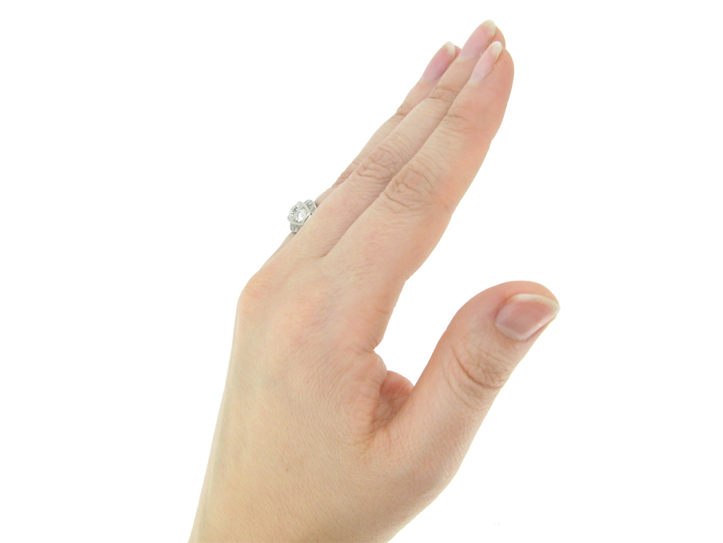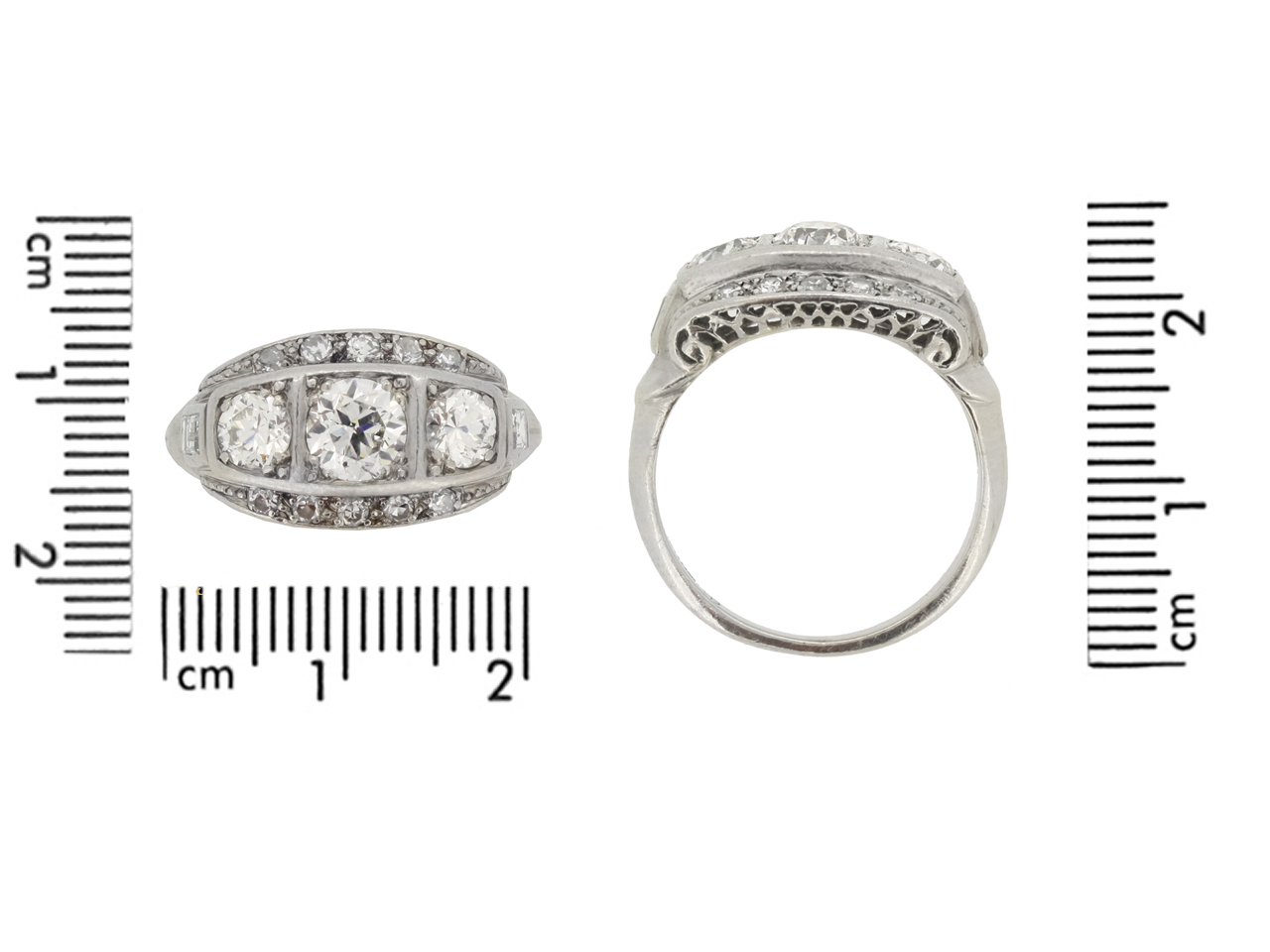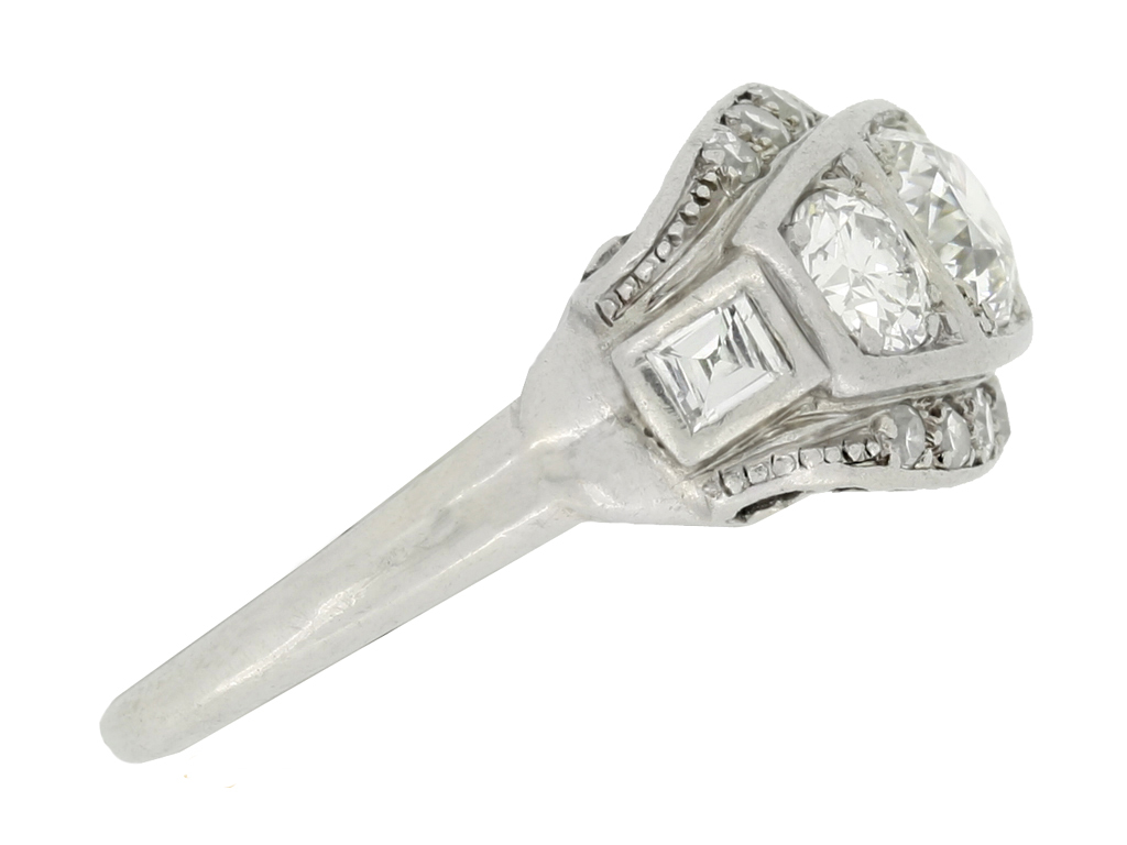 Diamond three stone cluster ring. Set with a round old cut diamond to centre in an open back grain setting with an approximate weight of 0.50 carats, further set with two round old cut diamonds in open back grain settings with a combined weight of 0.50 carats, encircled by a row of ten round eight cut diamonds in open back grain settings with a combined weight of 0.20 carats, further adorned with two square baguette cut diamonds in open back rubover settings with a combined weight of 0.20 carats. The total approximate diamond weight is 1.40 carats, to an elegant oval cluster design featuring polished edges, an intricately pierced scrolling gallery and fancy shape open backholing, flanked by trumpeting foliate form shoulders flowing down to a solid tapered D-shape shank. Tested white gold, maker's mark, circa 1930.