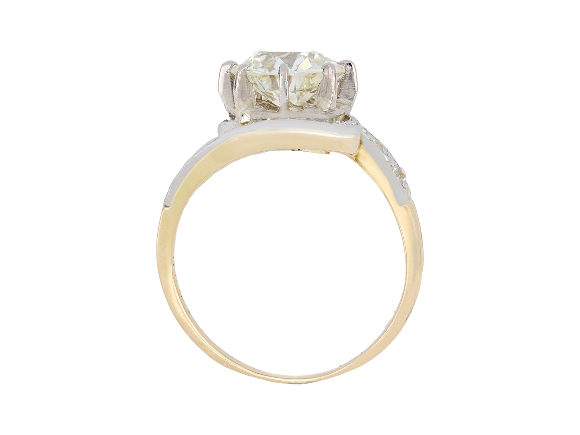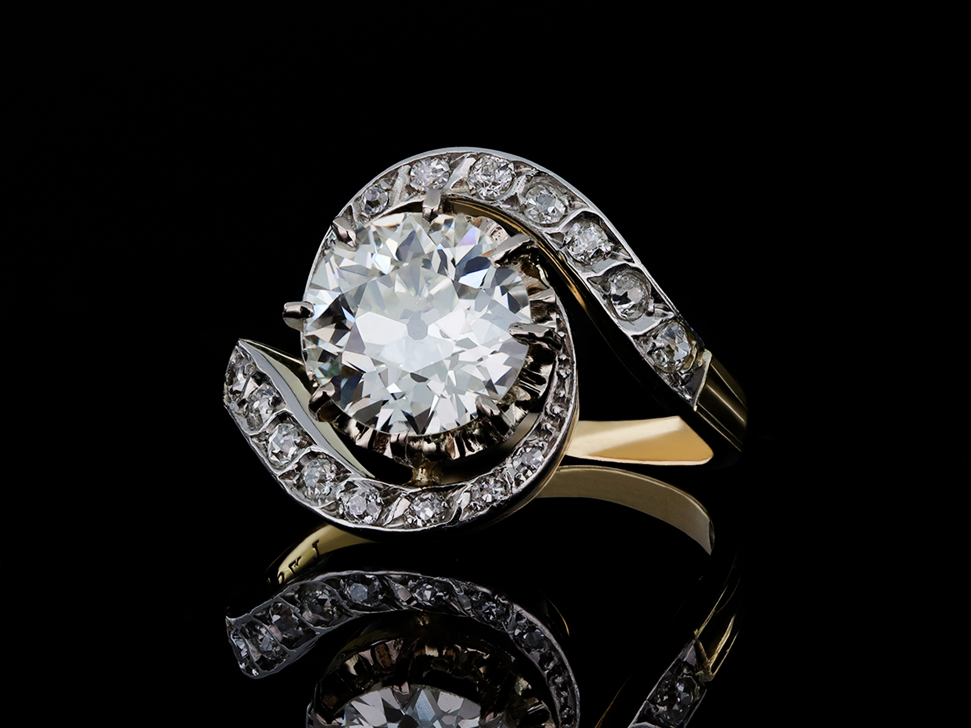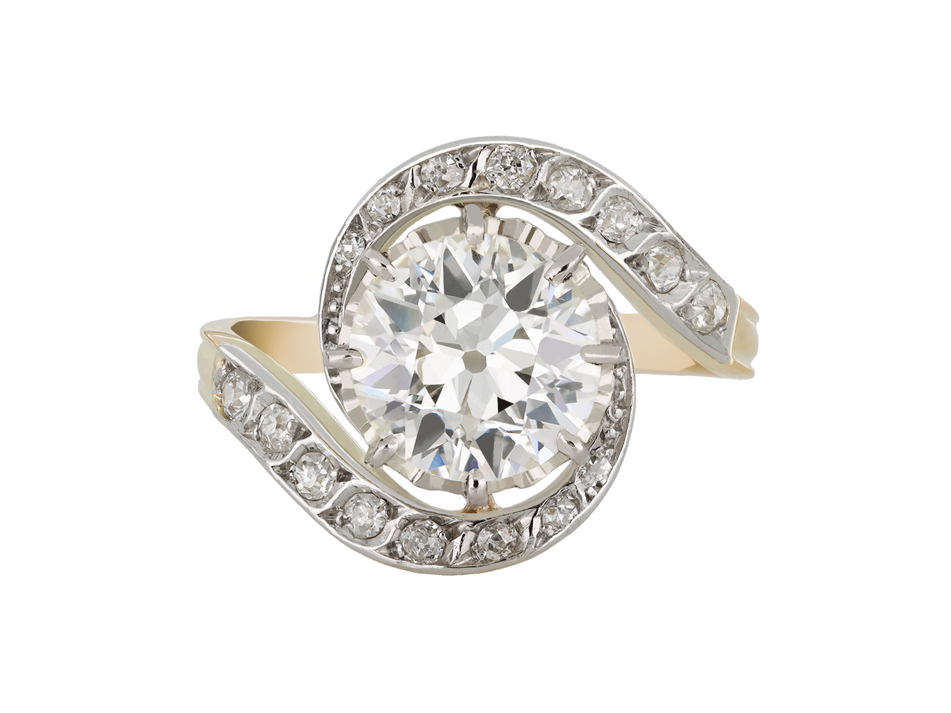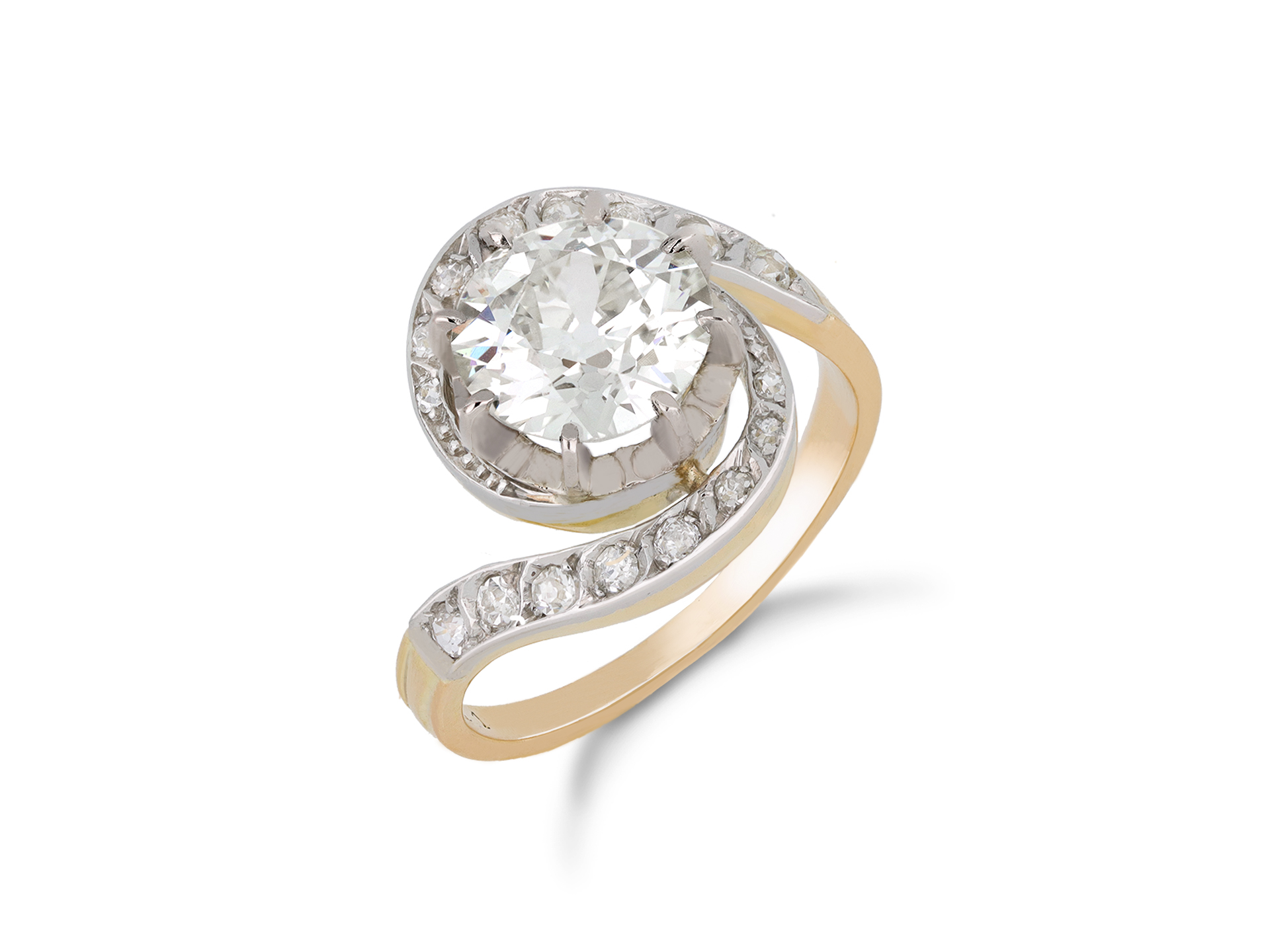 Diamond tourbillon ring. Set with one round old cut diamond, N colour, VS2 clarity with a weight of 2.20 carats in an open back claw setting, adorned with sixteen round mixed cut diamonds in open back grain settings with a combined weight of 0.40 carats. The total approximate diamond weight is 2.60 carats, to a sinuous tourbillon design, featuring curving claws, undulating collet and fancy open backholing, the inwardly tapering swirling shoulders terminate in ridged detail and flow through to a solid D-shaped band. Tested gold, marked platinum, numbered '3841', French, circa 1910. accompanied by Gemological Institute of America (GIA) report #6237334381.