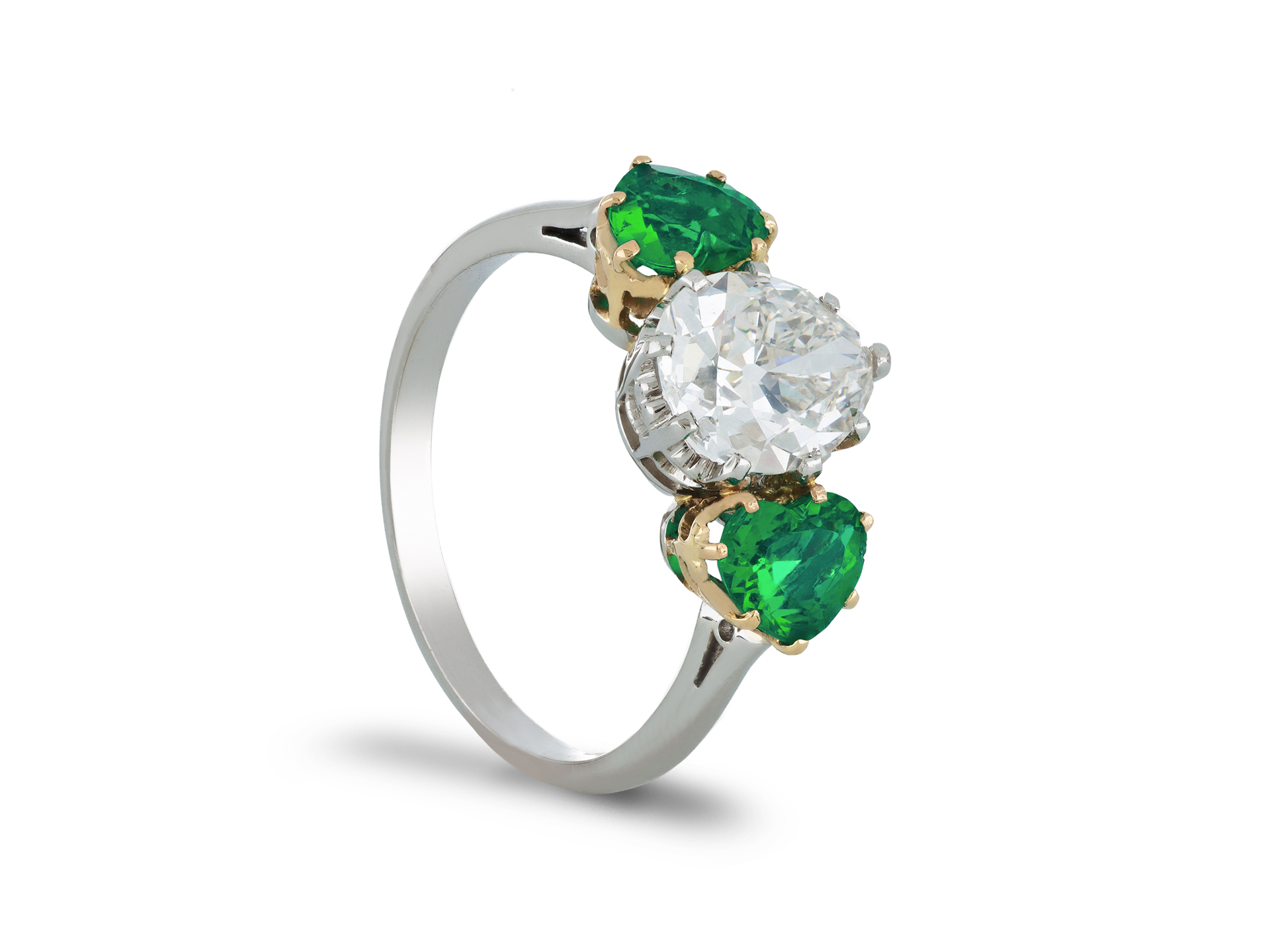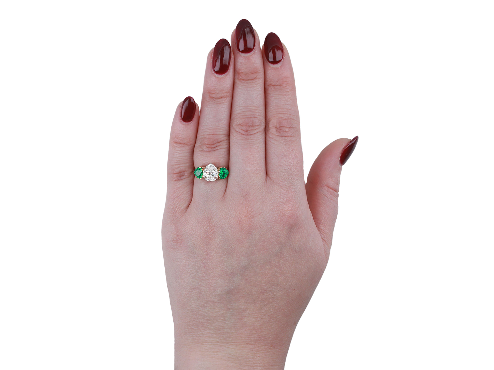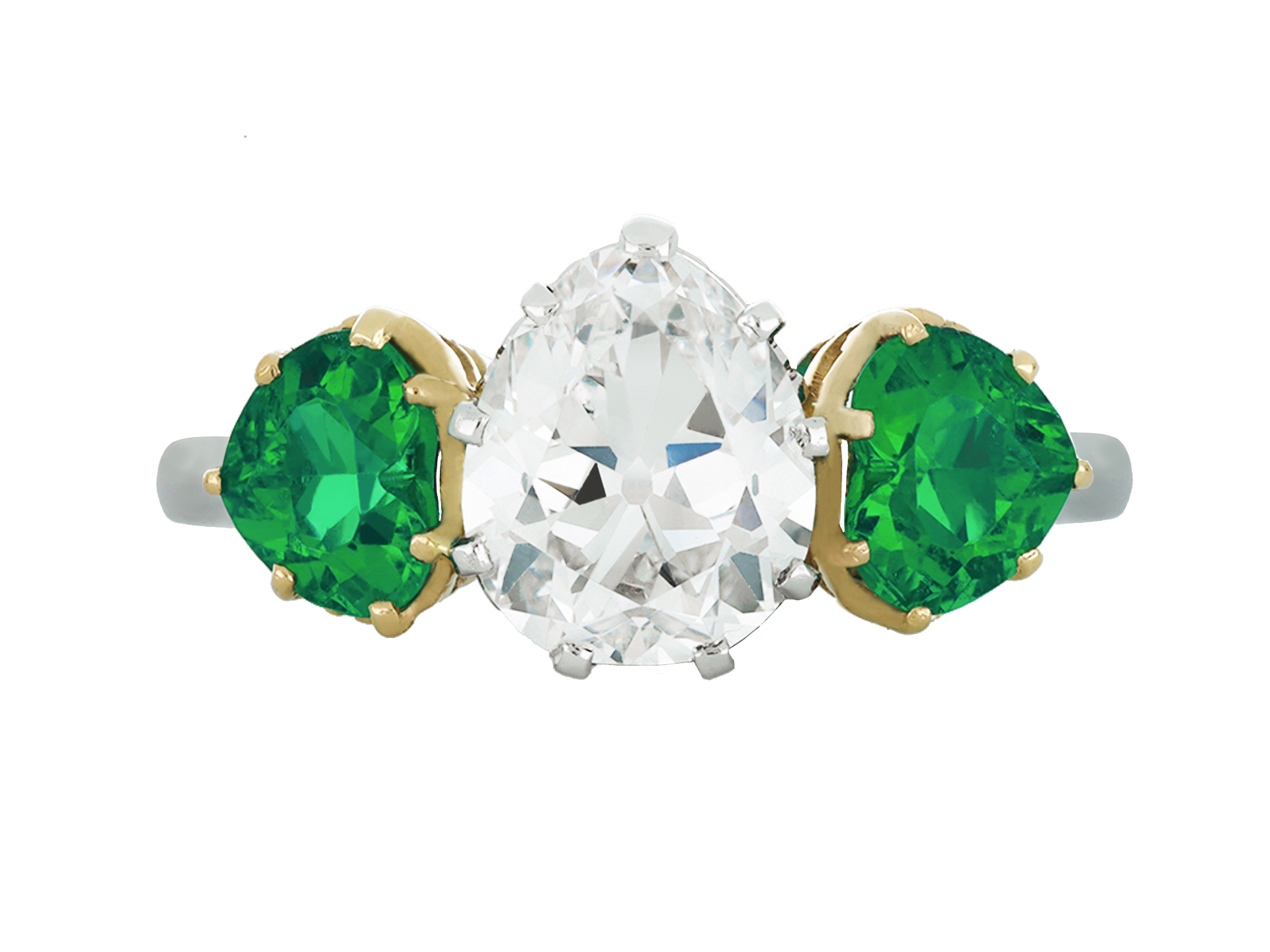 Drop shape old mine diamond and Colombian emerald ring. Set to the centre with a drop shape old mine diamond, F colour, VS2 clarity, with a weight of 1.56 carats, flanked by two drop shape old cut natural Colombian emeralds with minor clarity enhancement in open back claw settings, with an approximate combined weight of 0.80 carats, to a three stone design, featuring curving claws, an intricate pierced gallery with scrolling motifs and fancy shaped backholing, leading to inwardly tapering shoulders with cheniers and flowing through to a solid shank. Tested yellow gold and platinum, circa 1920, accompanied by Gemological Institute of America (GIA) report #2231546946 and Gemmological Certification Services report #80265-53.