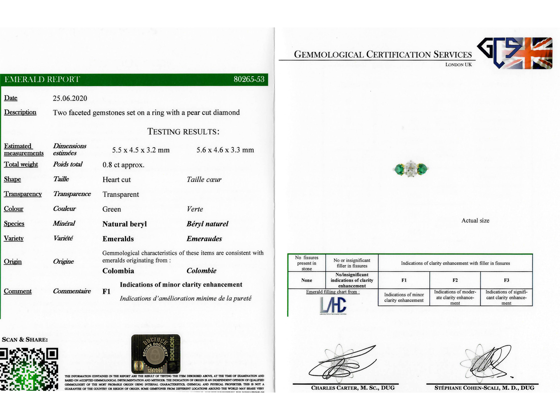 Gemstone Diamond, Drop Shape, 1.56ct 2 x Colombian Minor Oil Emeralds, Drop Shape, approximately 0.8ct total