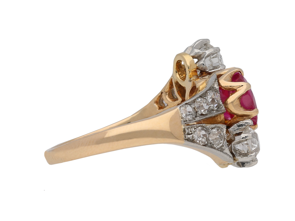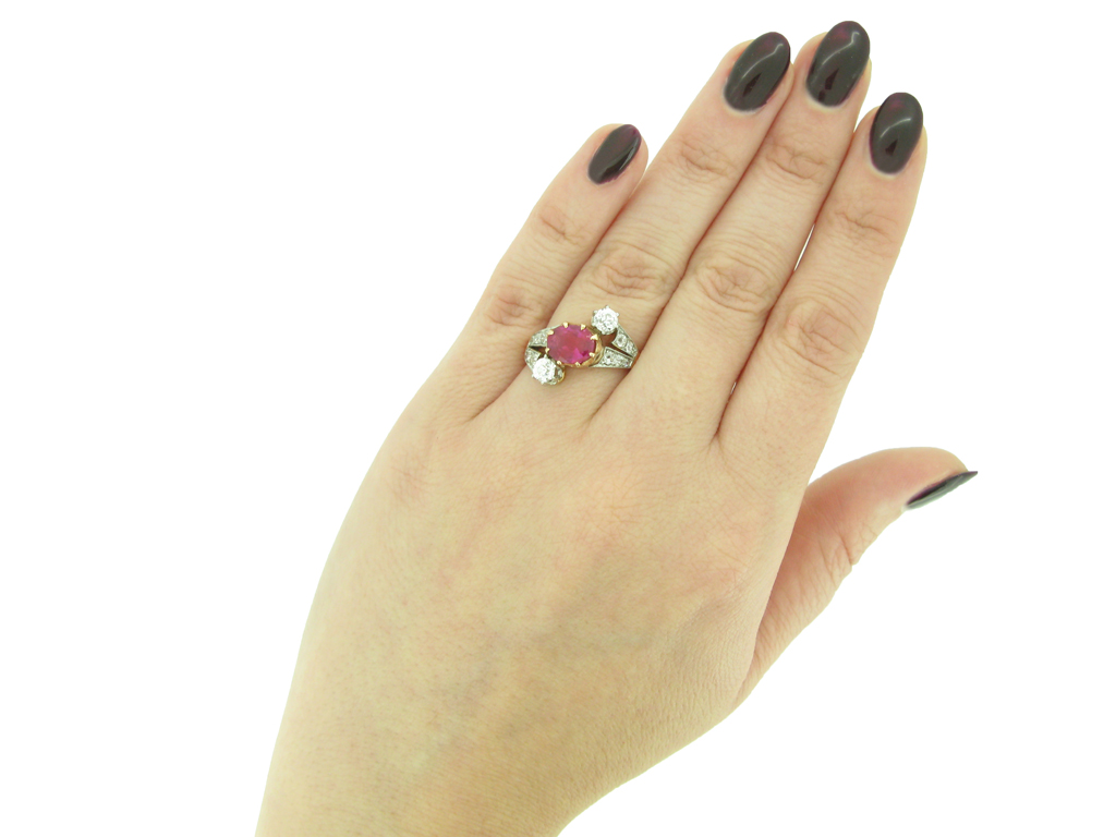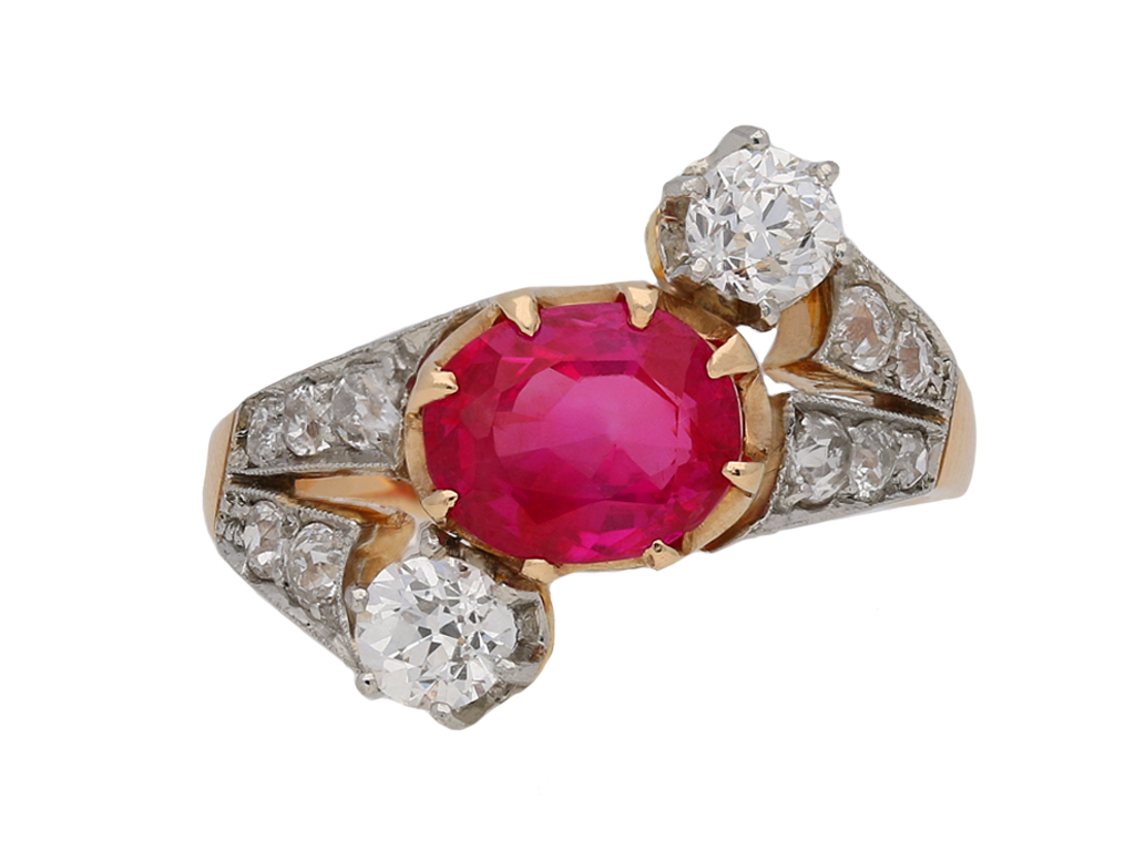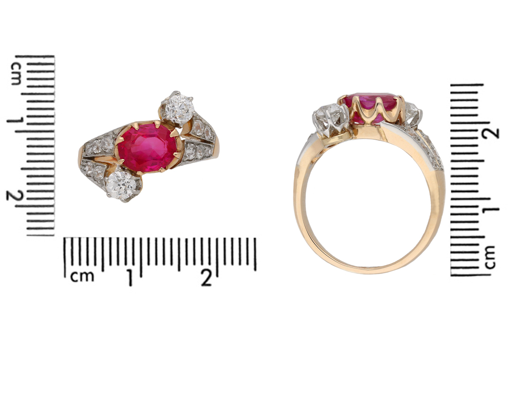 Edwardian Burmese ruby and diamond crossover ring, circa 1905.