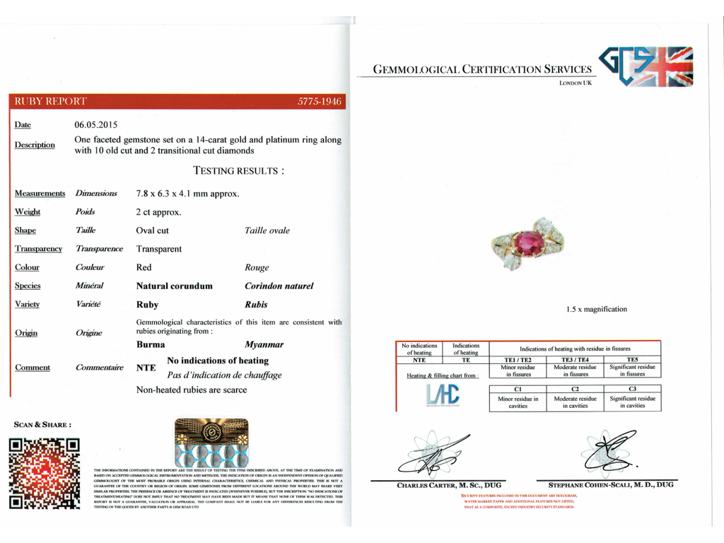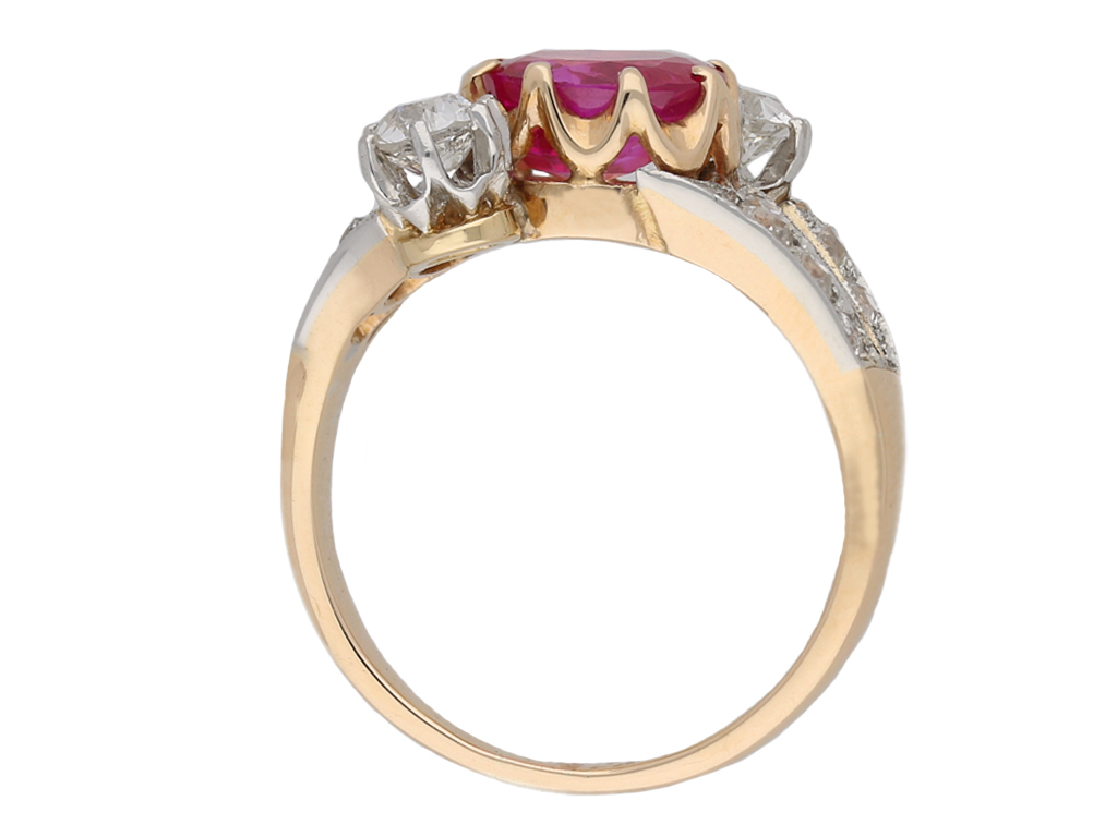 Edwardian Burmese ruby and diamond crossover ring. Set centrally with a single oval old cut natural unenhanced Burmese ruby in an open back claw setting with an approximate weight of 2.00 carats, diagonally flanked by two round old cut diamonds in open back claw settings with a combined approximate weight of 0.60 carats, further adorned with ten round old cut diamonds in open back grain settings with a combined weight of 0.40 carats. The total approximate diamond weight is 1.00 carats, to an elegant crossover design featuring millegrain edging, intricate pierced claws and open backholing, leading to trumpeting shoulders and flowing down to a solid tapered D-shape shank. Tested rose gold and platinum, circa 1905, accompanied by Gemmological Certification Services report #5775-1946.