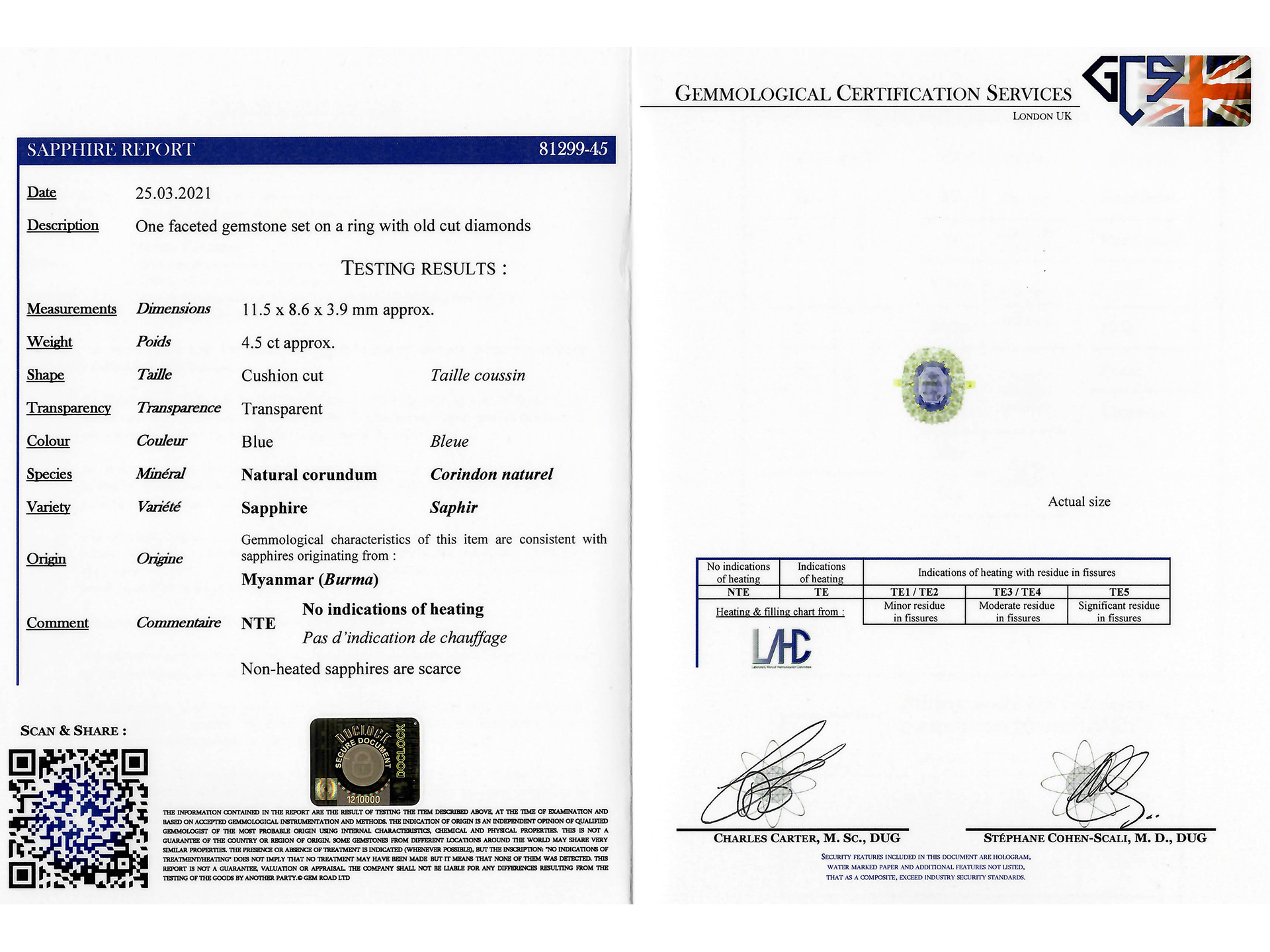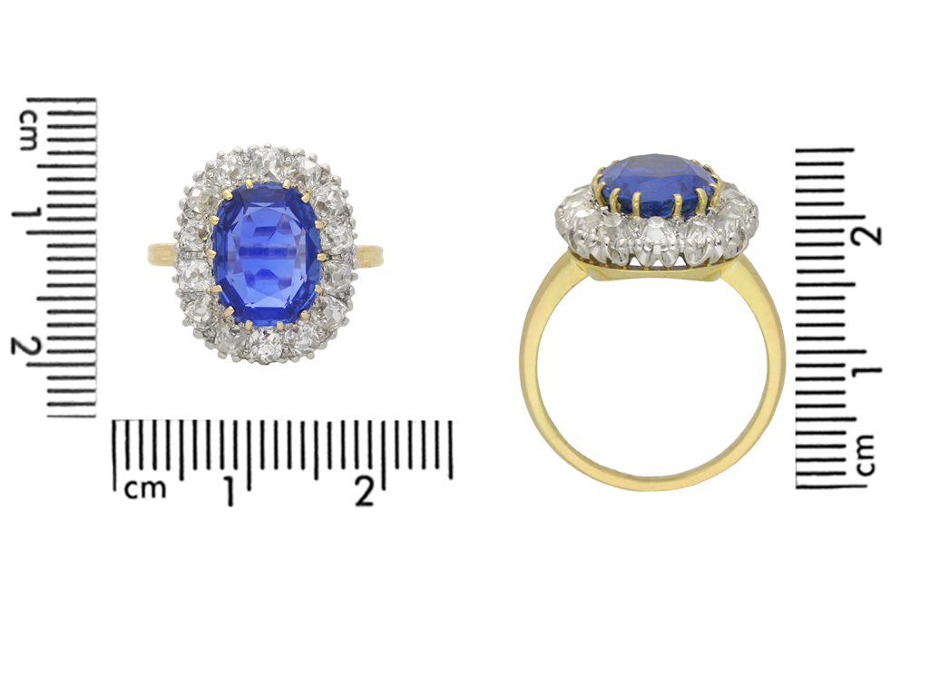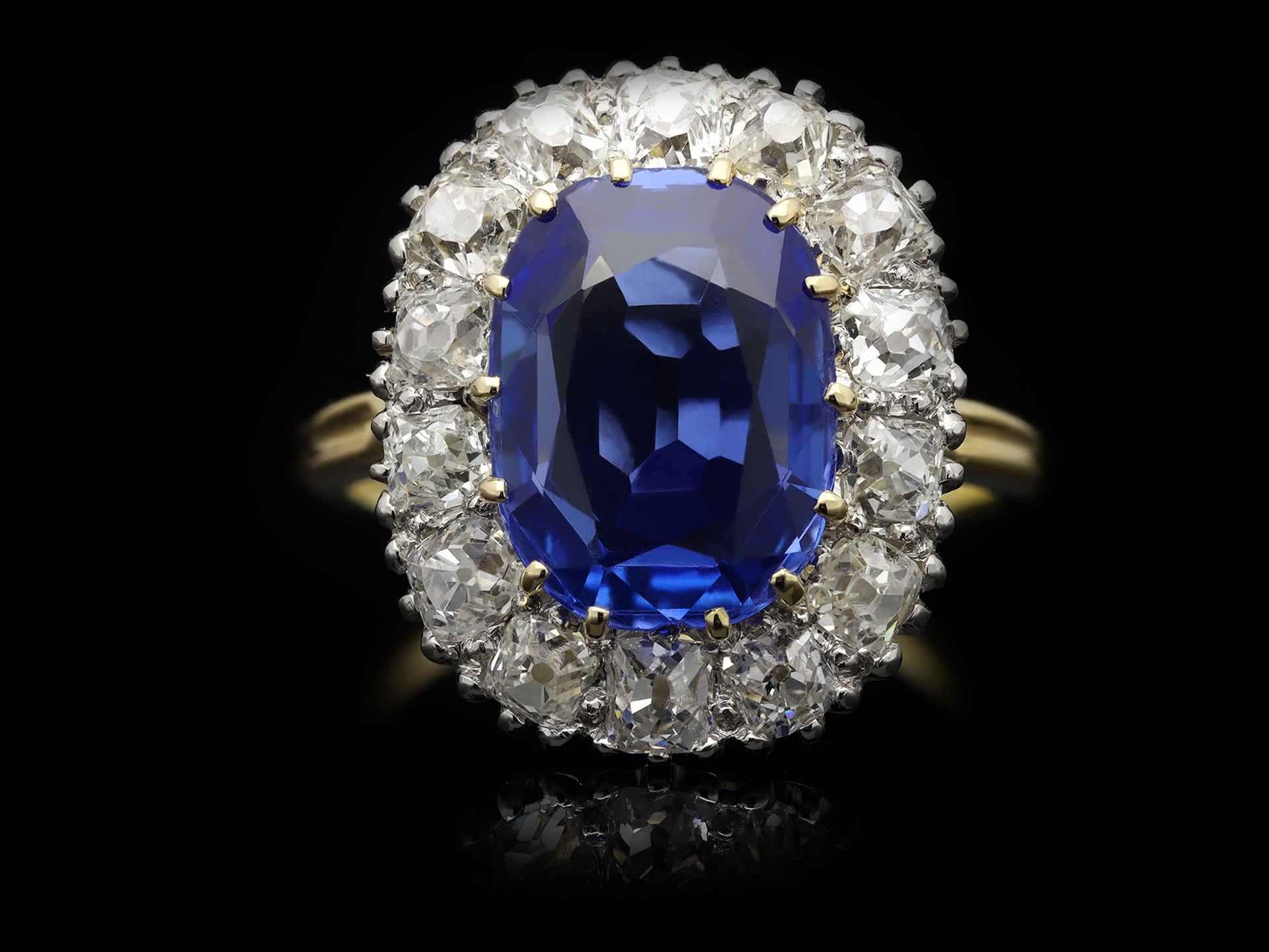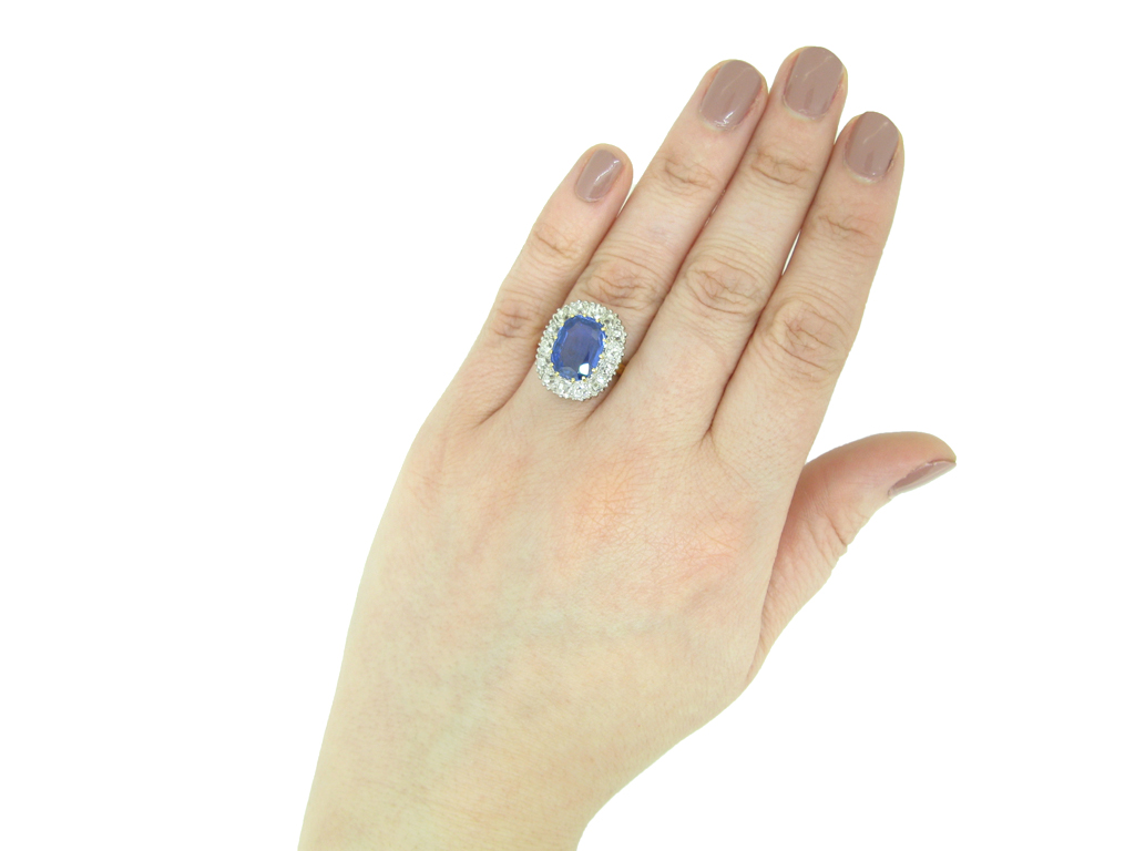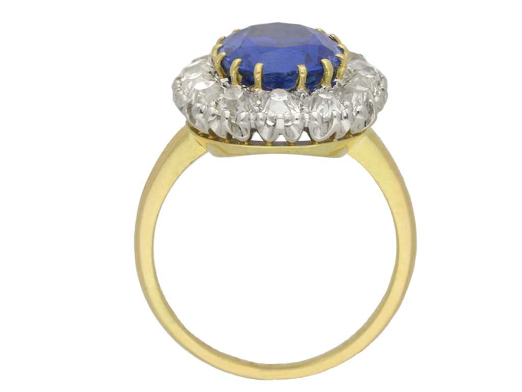 Edwardian Burmese sapphire and diamond cluster ring. Set to the centre with a cushion shape old cut natural and unenhanced Burmese sapphire in an open back claw setting with an approximate weight of 4.50 carats, further set with fifteen cushion shape old mine diamonds in open back grain settings with a combined approximate weight of 2.00 carats, to an elegant coronet cluster design featuring curving claws, intricately pierced gallery and fancy shape open back holing, flanked by trumpeting shoulders with grooved detailing, flowing through to a solid tapering shank. Marked 18 carat yellow gold and platinum, English, circa 1910, accompanied by Gemmological Certification Services report #81299-45.