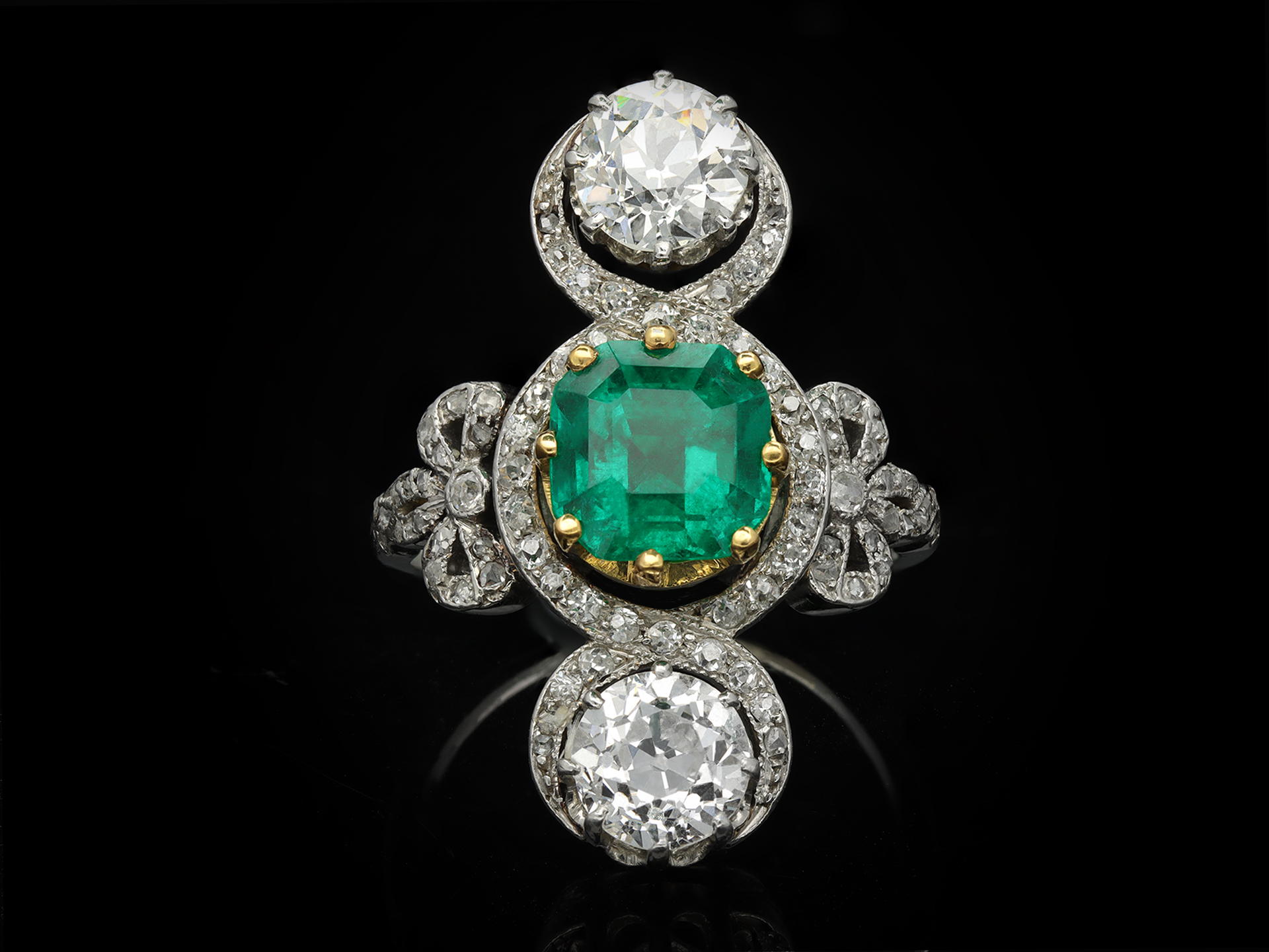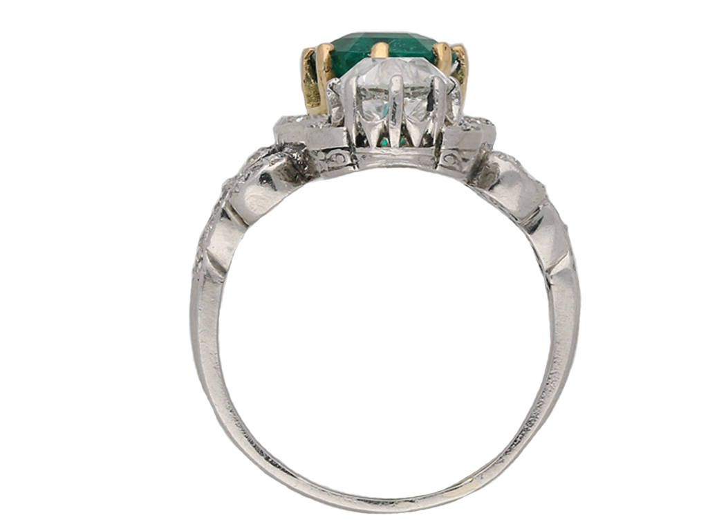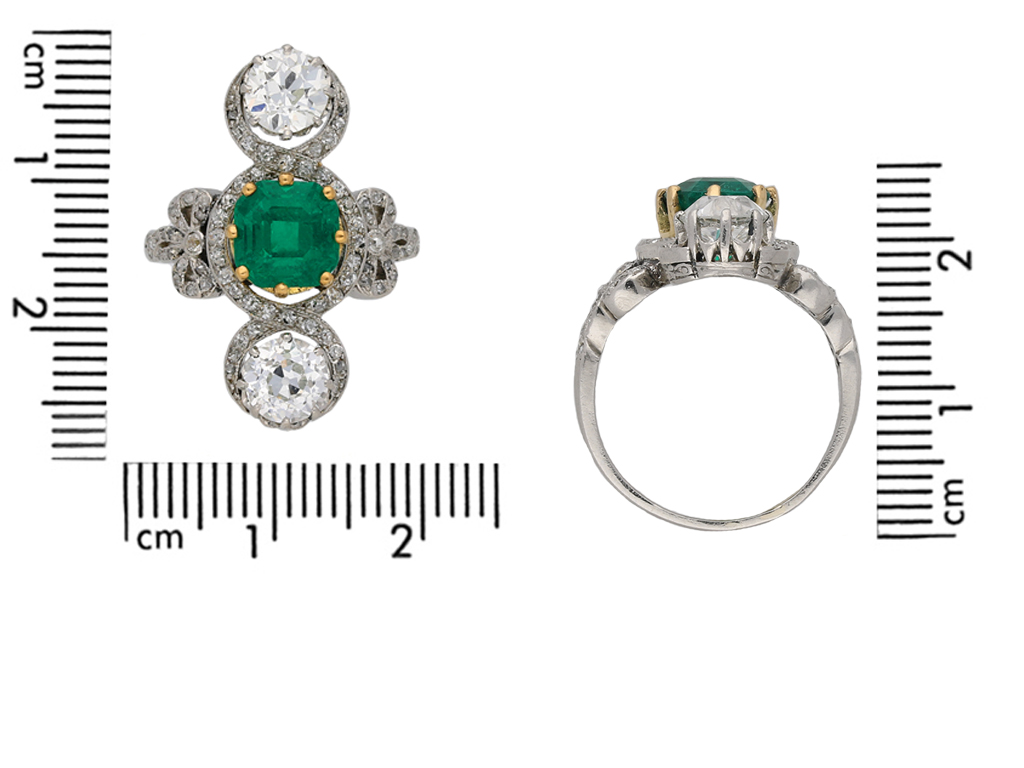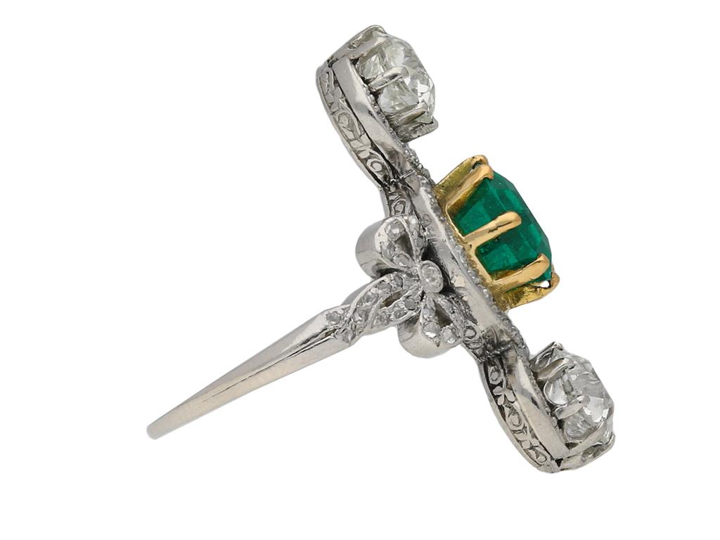 Edwardian Colombian emerald and diamond crossover ring. Set to centre with a single square emerald-cut natural Colombian emerald with minor clarity enhancement in an open back claw setting with an approximate weight of 2.50 carats, flanked by two round old cut diamonds in open back claw settings with a combined approximate weight of 1.75 carats, further adorned with seventy-eight round eight cut diamonds in open back grain settings with a combined weight of 0.75 carats. The total approximate diamond weight is 2.50 carats to a decorative crossover design featuring bow embellishment, millegrain edging, an intricately engraved gallery with a foliate motif and fancy open backholing, leading to tapered shoulders with ridged detail flowing through to a smooth D-shape shank. Tested platinum, circa 1915, accompanied by Gemmological Certification Services report #78207-30.