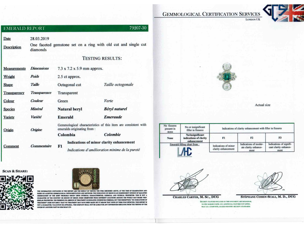 Gemstone Colombian Minor Oil Emerald, Emerald Cut, approximately 2.5ct 2 x Diamonds, Old Cut, approximately 1.75ct total 78 x Diamonds, Eight Cut, approximately 0.75ct total
