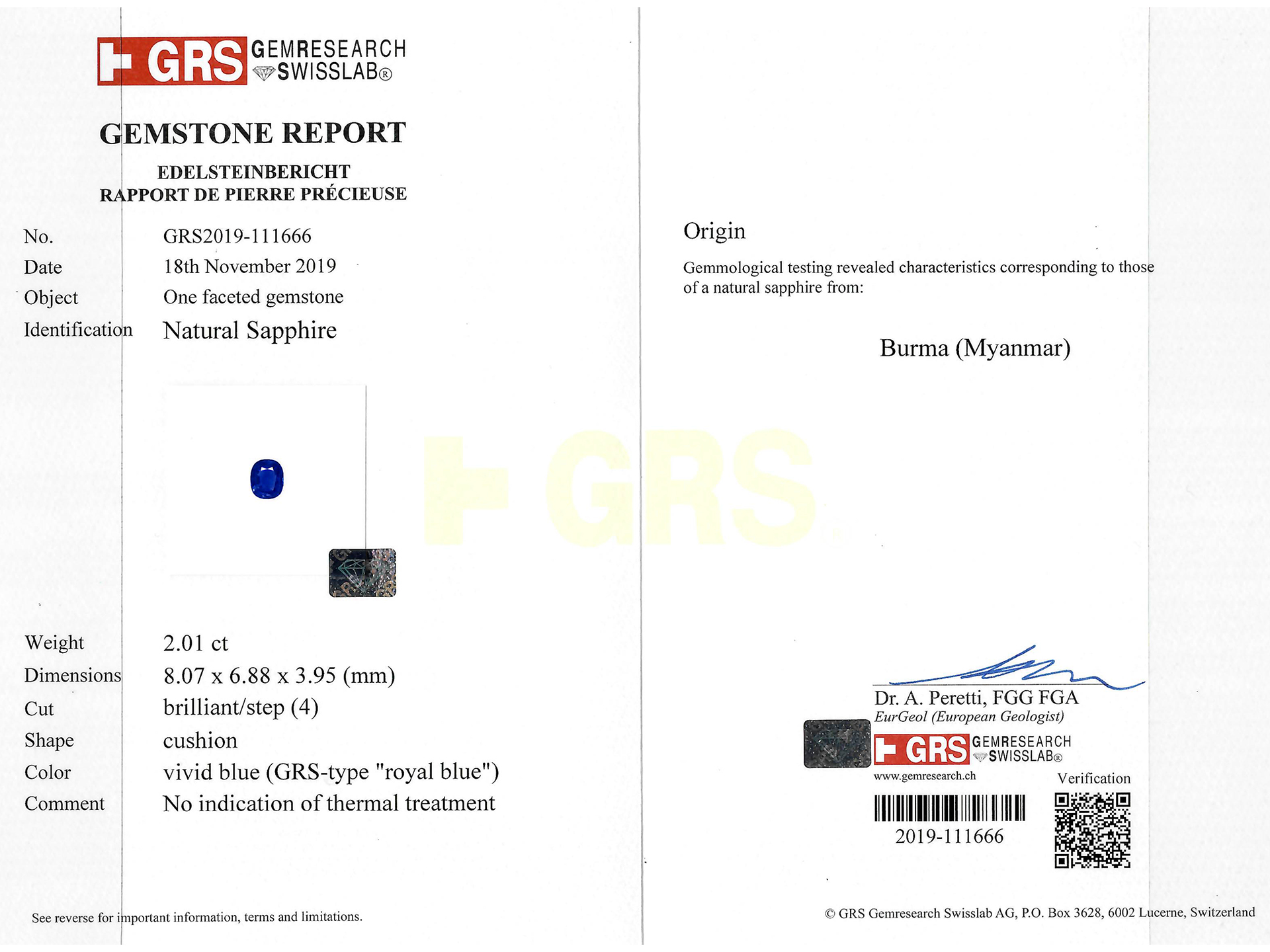 Edwardian Royal Blue Burmese sapphire and diamond cluster ring. Centrally set with a cushion shape old cut natural unenhanced Royal Blue Burmese sapphire in an open back claw setting with a weight of 2.01 carats, further adorned by twenty four round eight cut diamonds in open back grain settings with a combined approximate weight of 0.30 carats, to an elegant cluster design featuring polished edges, an intricately pierced gallery and open backholing, the raised shoulders supported by cheniers, flowing to a solid D-shape shank. Marked platinum, circa 1915, accompanied by Gem Research Swisslab (GRS) report #GRS2019-111666.