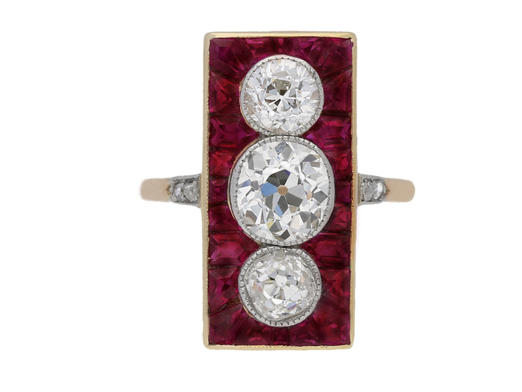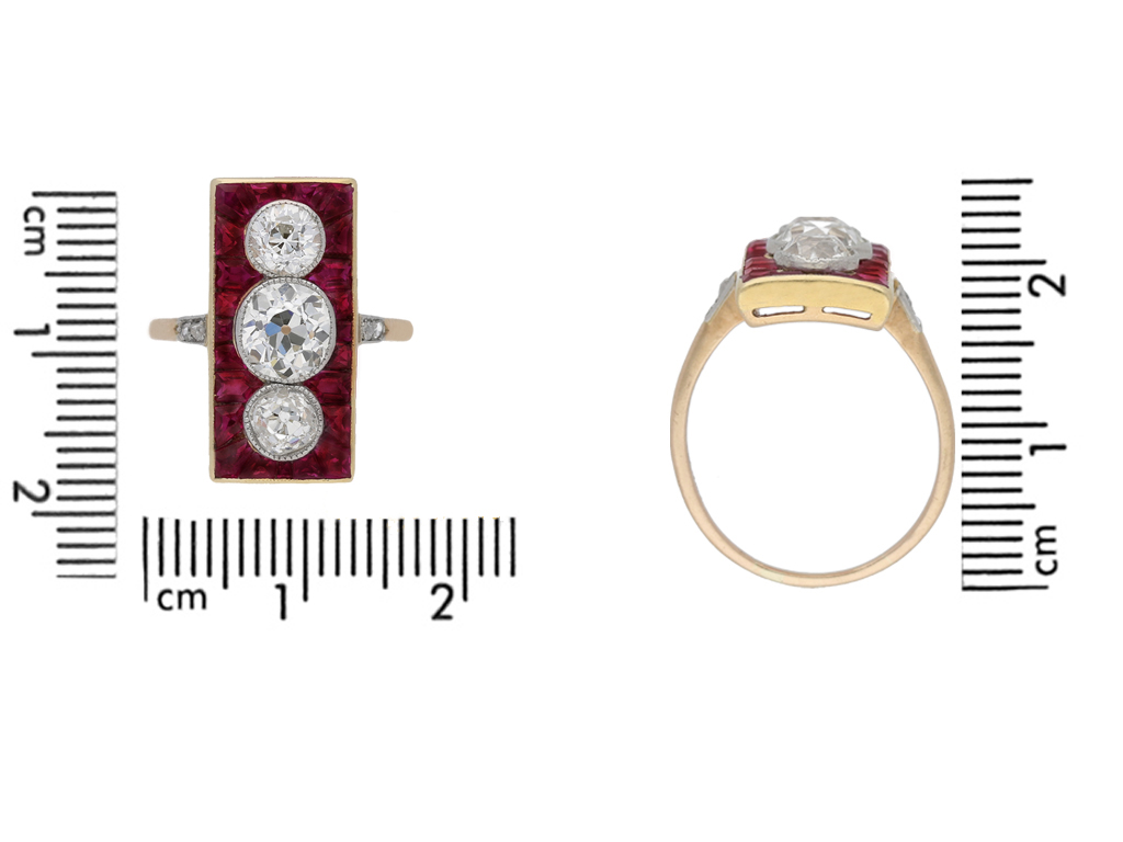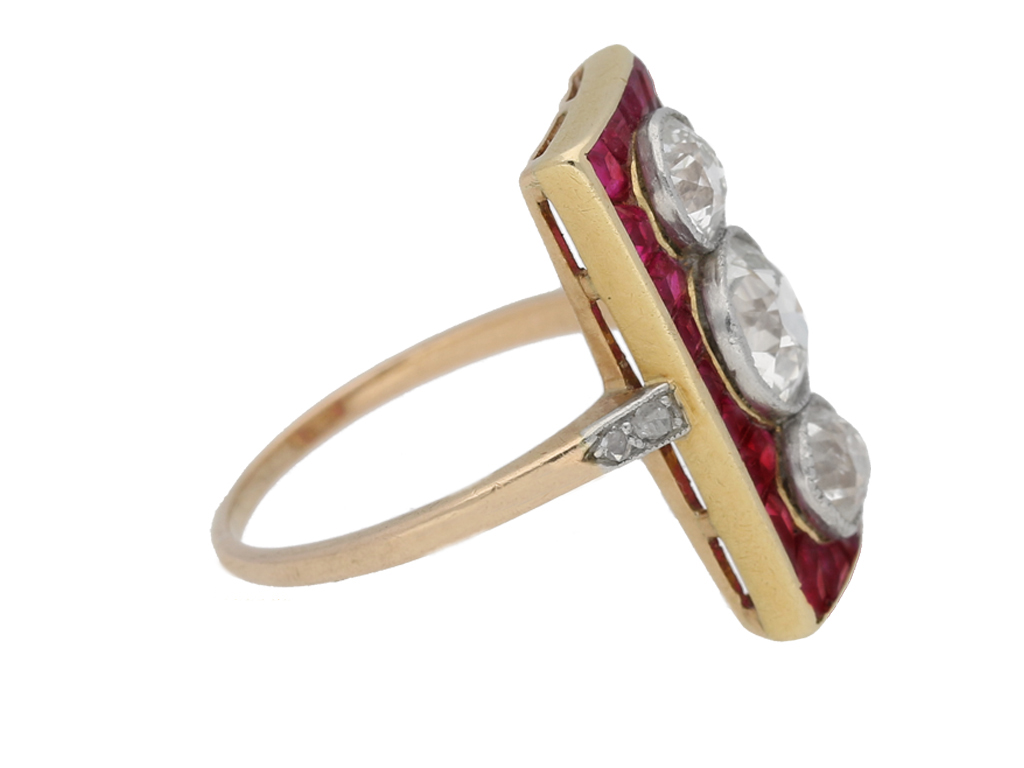 Edwardian diamond and ruby dress ring. Vertically set with three round old cut diamonds graduated from centre and in open back millegrain collet settings with a combined weight of 1.80 carats, within a rectangular frame of twenty four channel set tapered calibre cut natural unenhanced rubies set in open back yellow gold rubover settings with an approximate combined weight of 2.40 carats, the raised shoulders set with four round rose cut diamonds in millegrain bead settings, with a combined weight of 0.04 carats. The total approximate diamond weight is 1.84 carats, to an elegant rectangular plaque with an openwork gallery and intricate backholing, tapering to a solid D-shape shank. Tested rose gold and platinum, circa 1905.