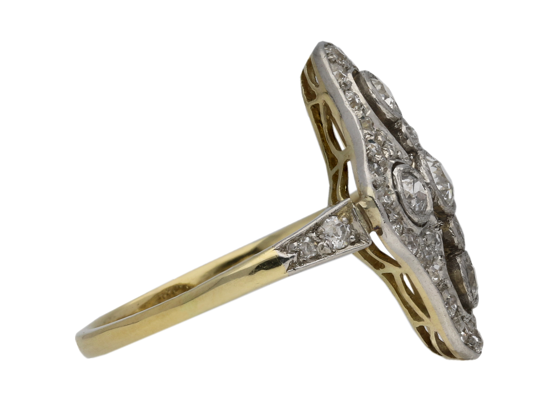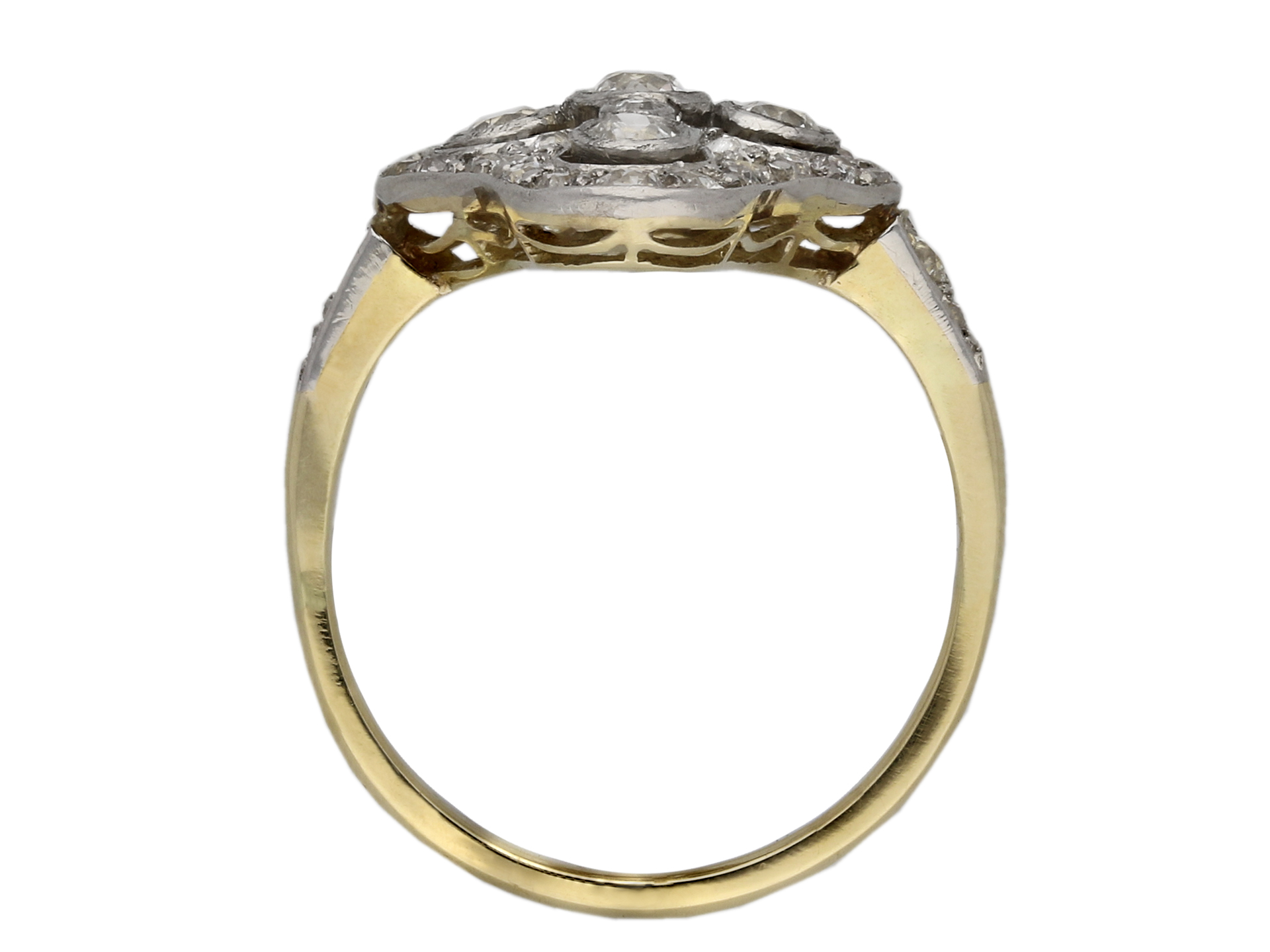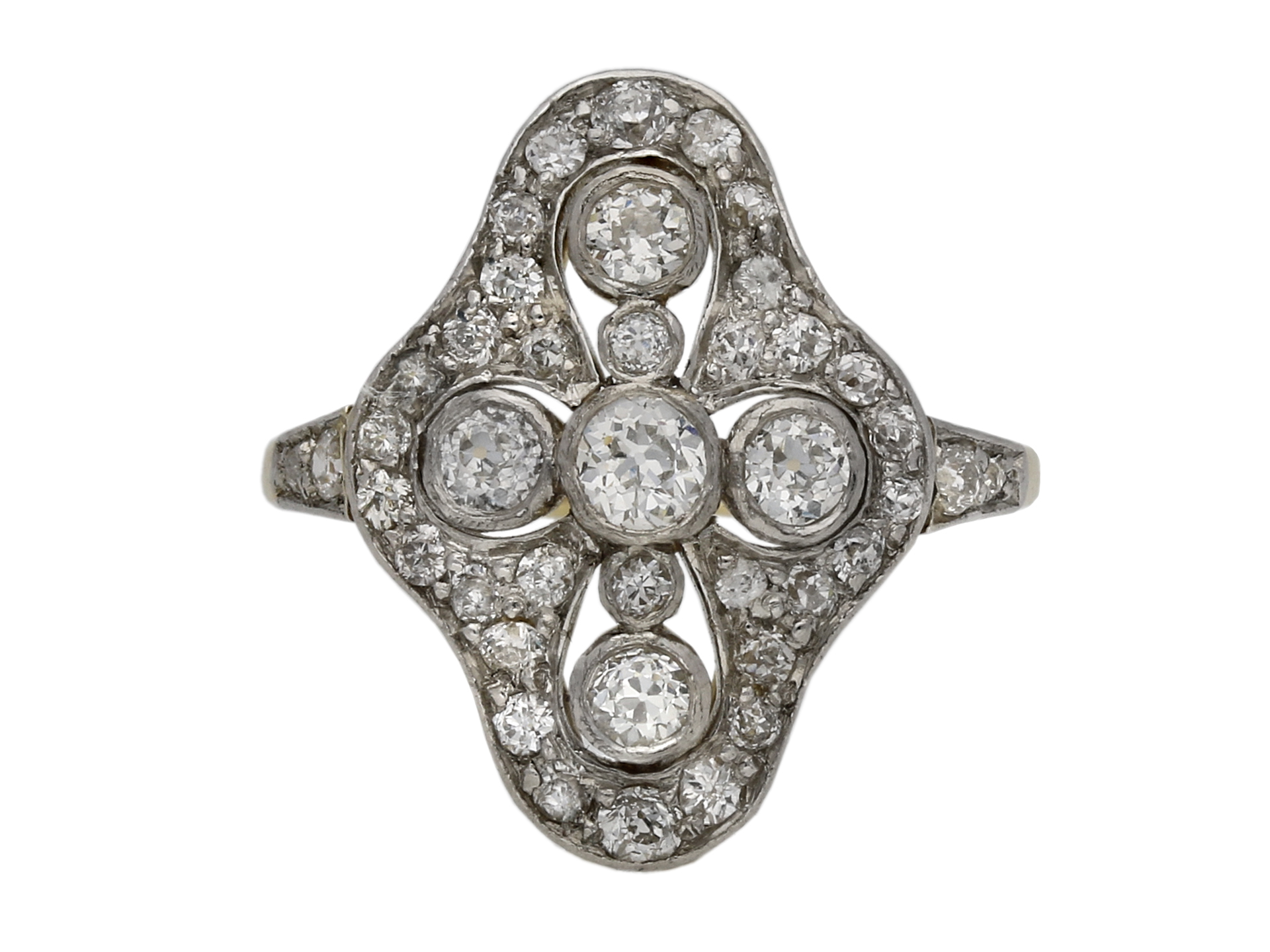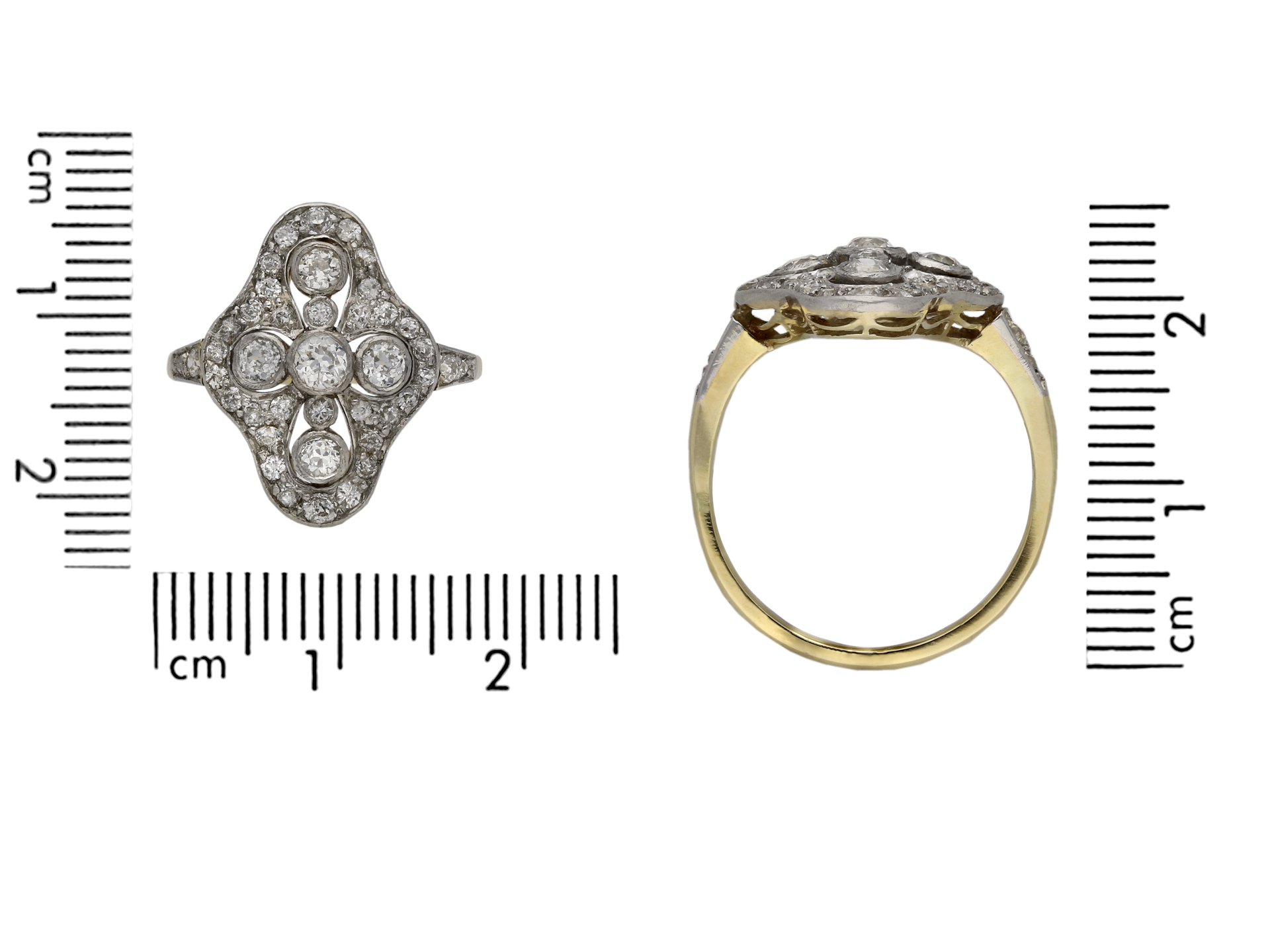 Edwardian diamond cluster ring. Set to centre with five round old cut diamonds in open back rubover settings with a combined approximate weight of 0.50 carats, further set with thirty six round old cut diamonds in open back rubover and grain settings with a combined weight of 1.00 carats. The total approximate diamond weight is 1.50 carats, to a quatrefoil cluster form featuring openwork details, an intricately pierced gallery and open backholing, leading to smooth shoulders and flowing through to a solid shank. Tested yellow gold and platinum, circa 1910.