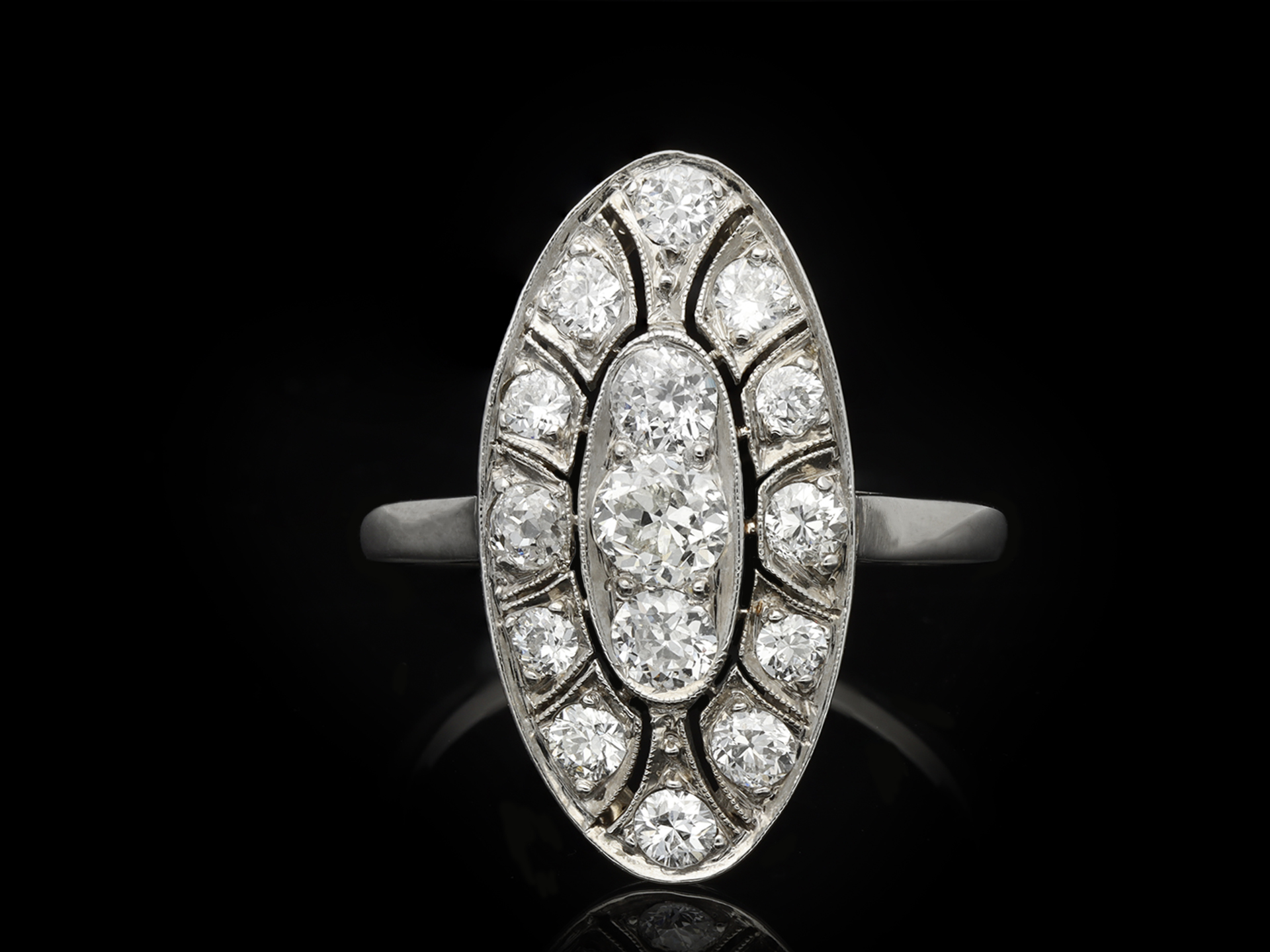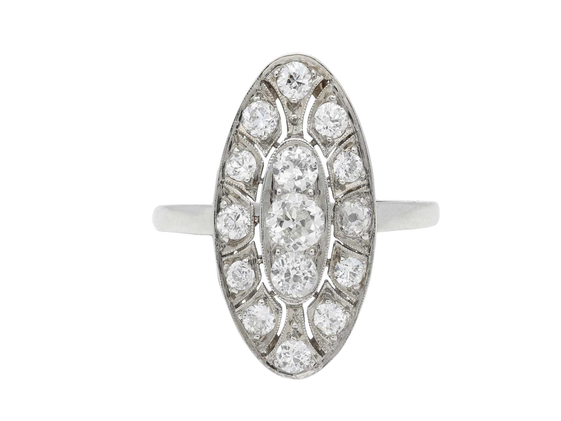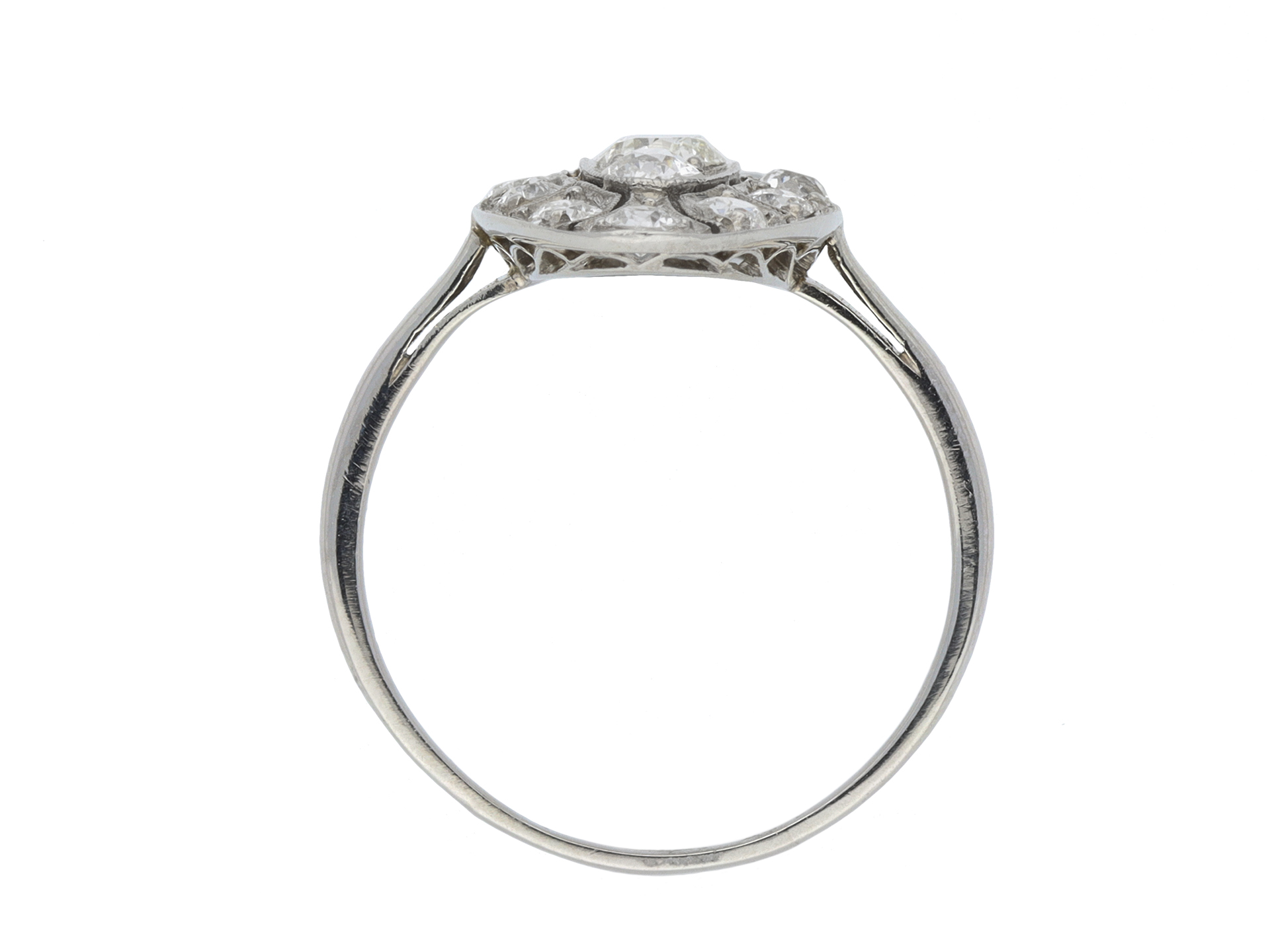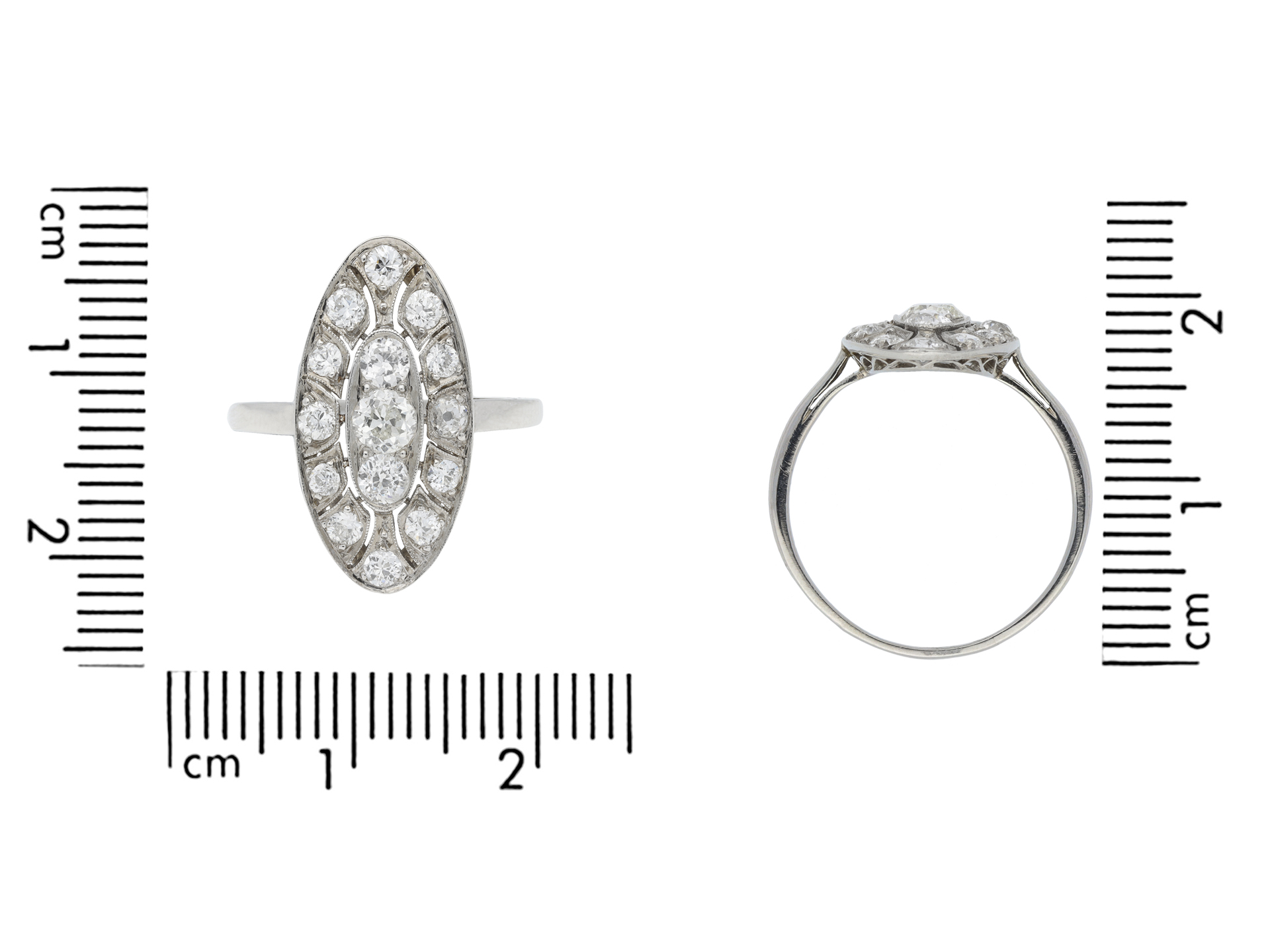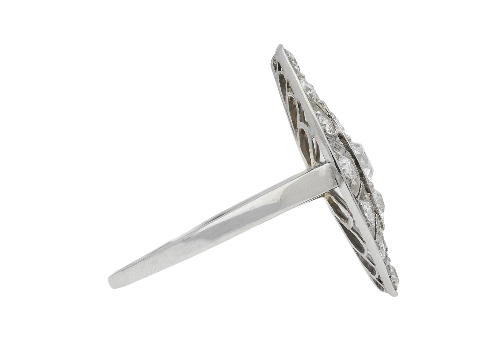 Edwardian diamond cluster ring. Centrally set with a row of three round old cut diamonds in open back grain settings with an approximate combined weight of 1.00 carats, surrounded by a single row of twelve round old cut diamonds in open back grain settings with a combined weight of 0.60 carats. The total approximate diamond weight is 1.60 carats, to an elegant cluster design featuring a decoratively pierced openwork gallery and open backholing, leading to tapering shoulders and flowing through to a smooth D-shaped shank. Tested platinum, circa 1905.