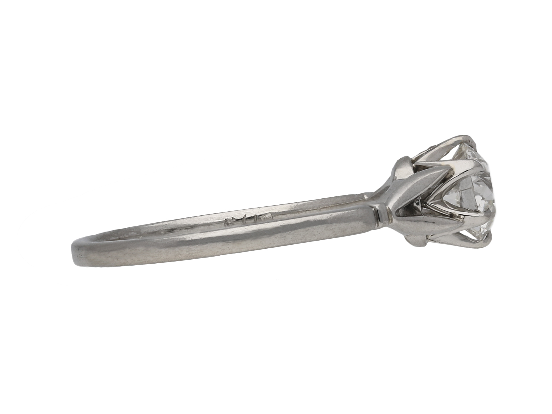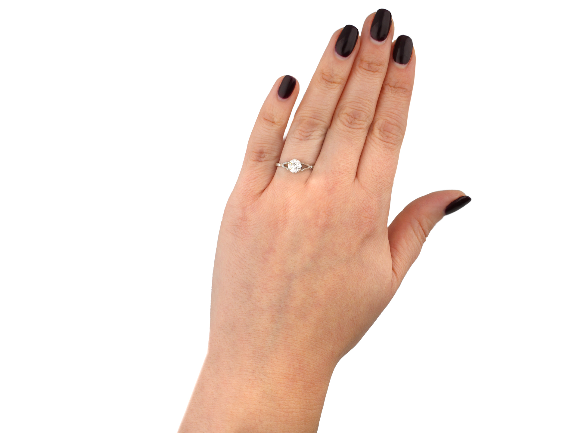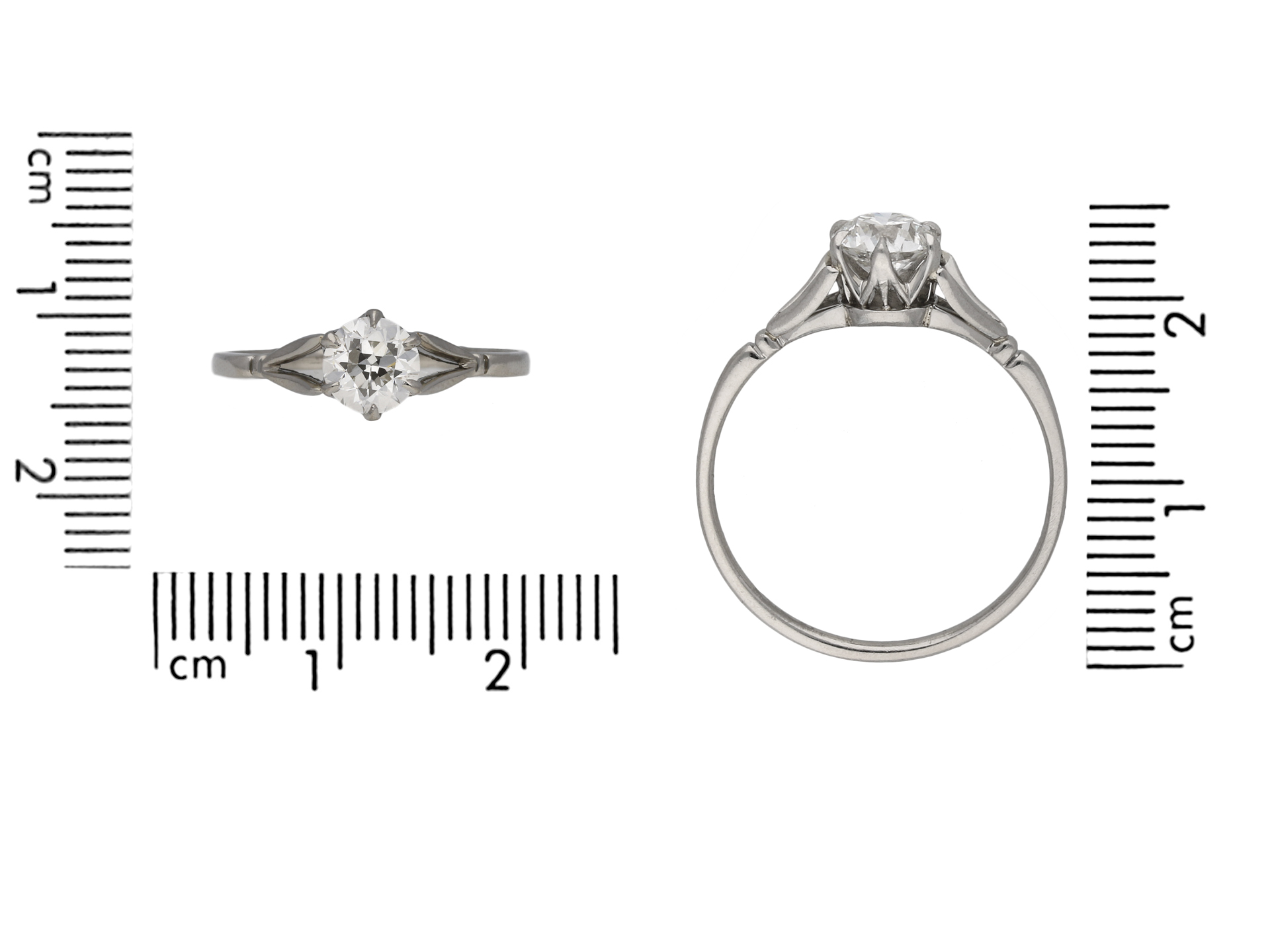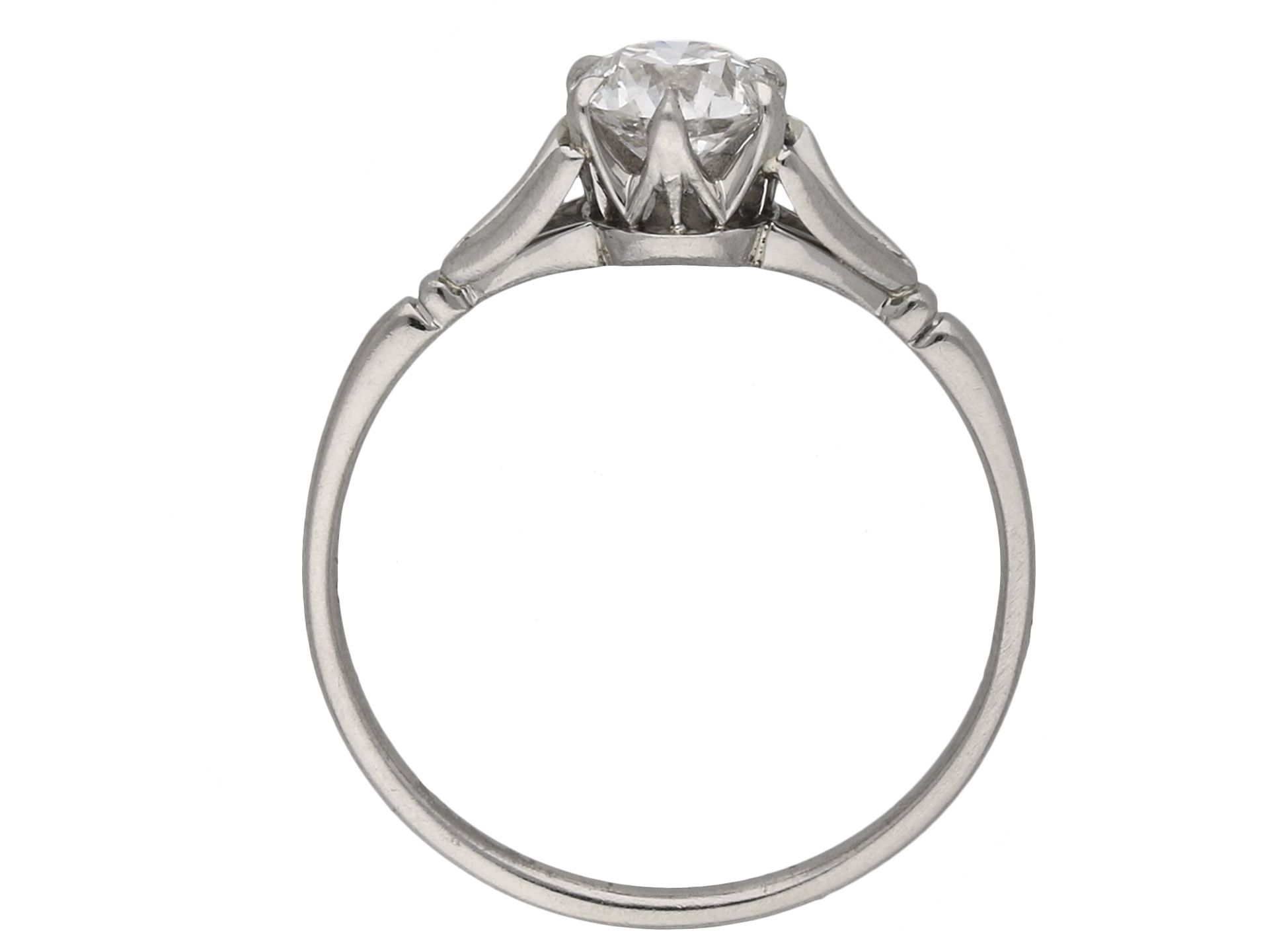 Edwardian diamond solitaire ring. Set with a round old cut diamond, H colour, VS2 clarity with a weight of 0.73 carats in an open back claw setting, to an elegant solitaire design featuring curving claws, a geometric pierced gallery and open backholing, leading to raised split shoulders with grooved detail and flowing through to a solid D-shape shank. Marked platinum, numbered '903', English, circa 1910, accompanied by Gemological Institute of America (GIA) report #6204722401.