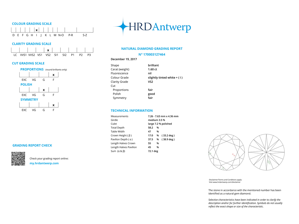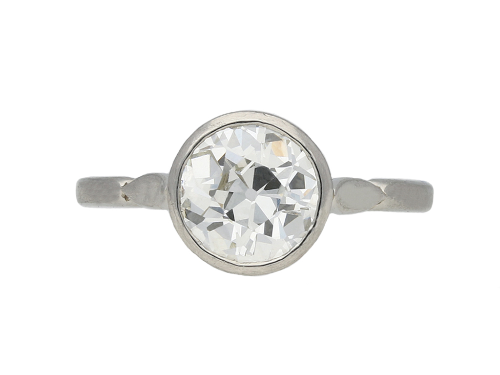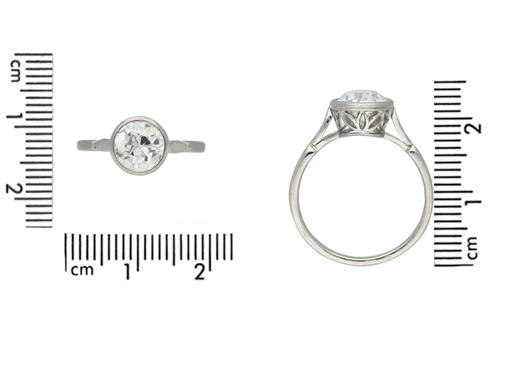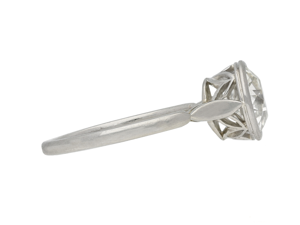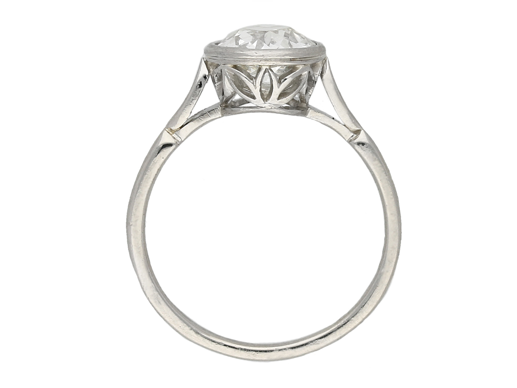 Edwardian diamond solitaire ring. Centrally set with a round old cut diamond, I colour, VS2 clarity, with an approximate weight of 1.60 carats, in an open back rubover setting, to an elegant circular openwork collet with intricately pierced leaf motifs, fine ribbed border and shaped open backholing, the raised open shoulders feature leaf decoration before terminating to a solid D-shape shank. Tested platinum, numbered '392', English, circa 1915, accompanied by HRD Antwerp report #170003127464.