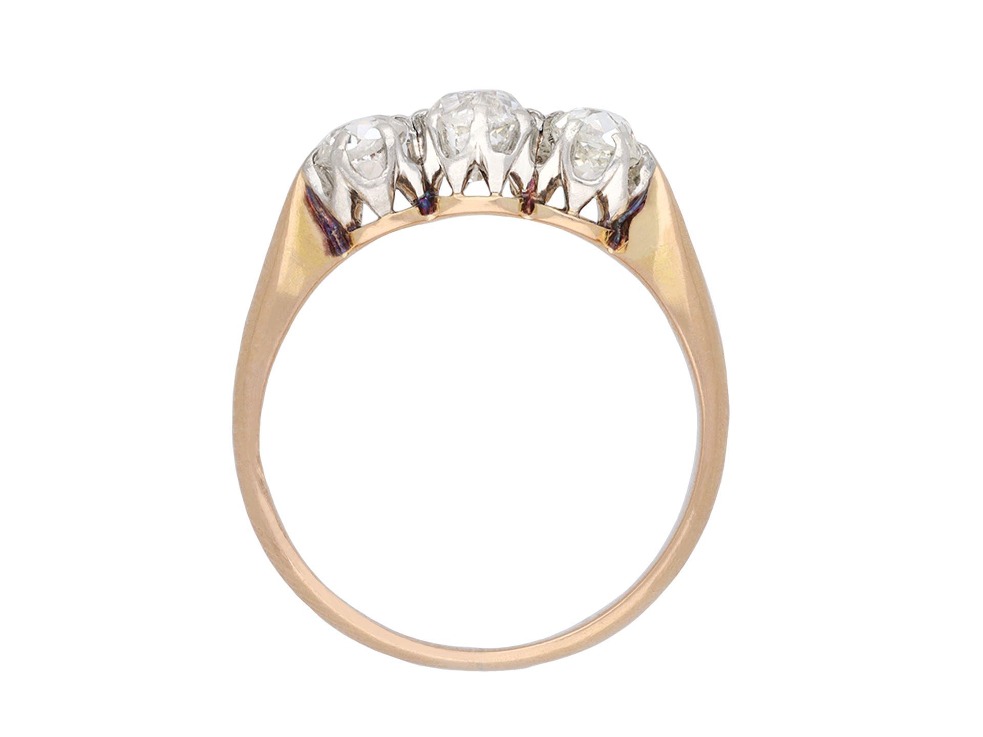 Antique three stone rings are rich in symbolism and meaning, with the three stones holding a different meaning for everyone. Romantically, they can stand for three special words such as ‘I love you’, ‘you, me, us’, or even ‘the past, present and future’. To some, they can symbolise the presence of others in their life for example children, the holy trinity or even a lasting friendship. This three stone ring, dates to the early twentieth century and is set with old mine diamonds which hail from the historic diamond reserves of India or Brazil. With a beautiful scintillation of light, these stones would have been cut and faceted by hand, making each one an individual treasure.