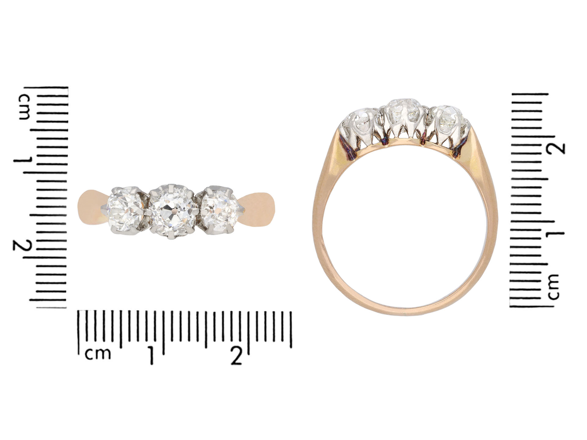 Old mine diamond three stone ring. Set to centre with one cushion shape old mine diamond in an open back claw setting with an approximate weight of 0.40 carats, flanked by two cushion shape old mine diamonds in open back claw settings with a combined weight of 0.50 carats. The total approximate diamond weight is 0.90 carats to an elegant three stone design featuring curving claws, an intricately pierced gallery and open circular backholing, leading to inwardly tapering raised shoulders flowing through to a solid D-shape shank. Tested rose gold and platinum, French import marks, circa 1910.