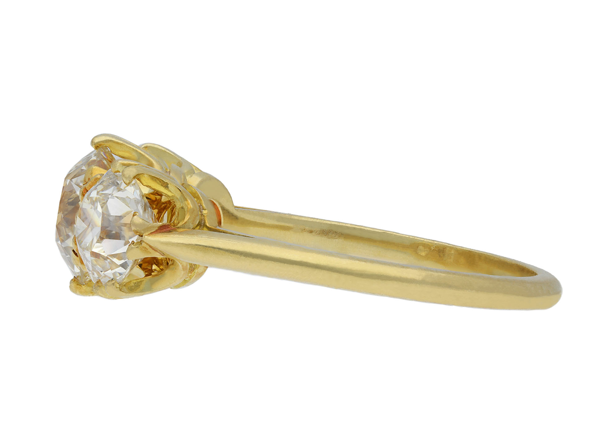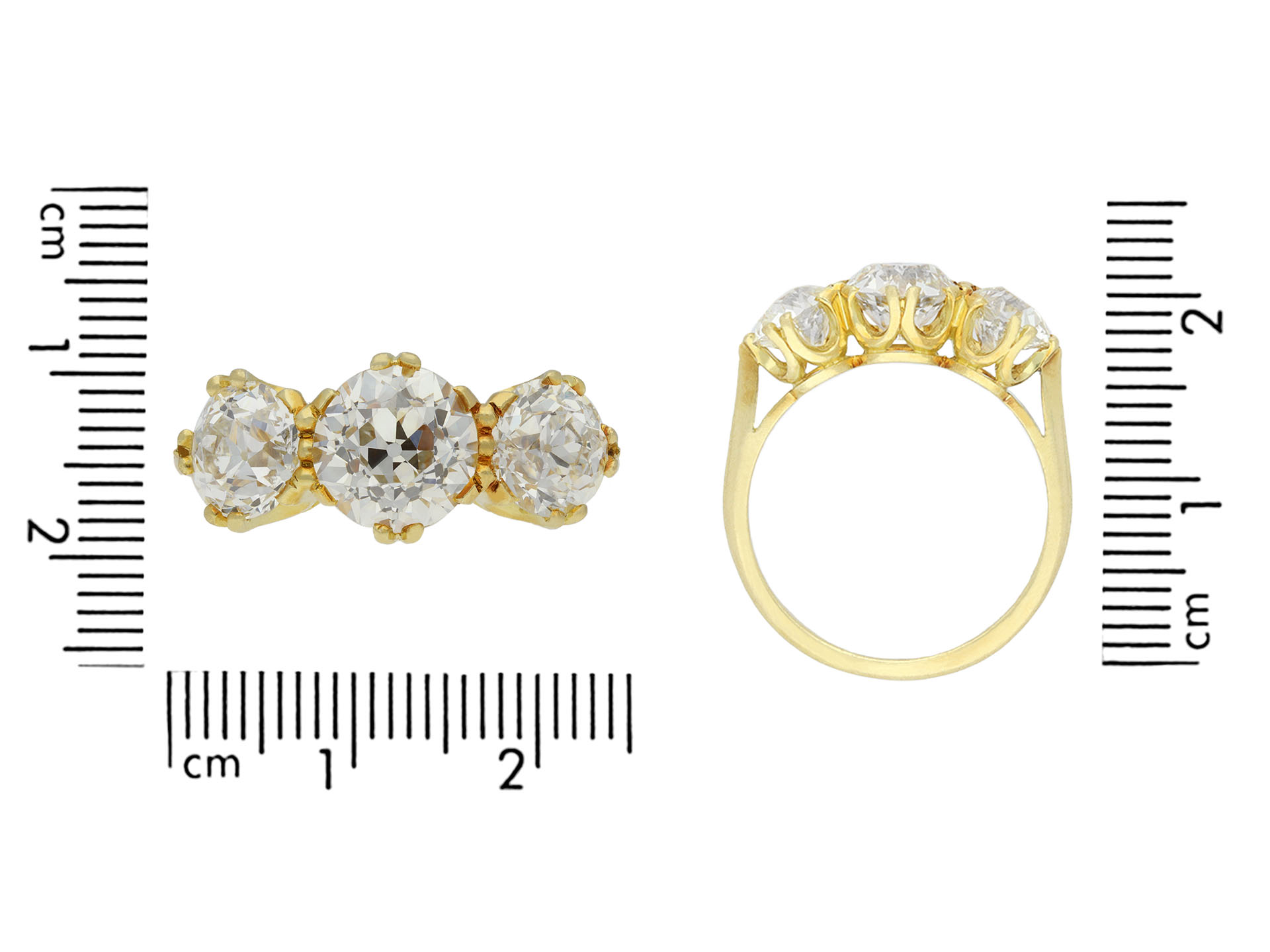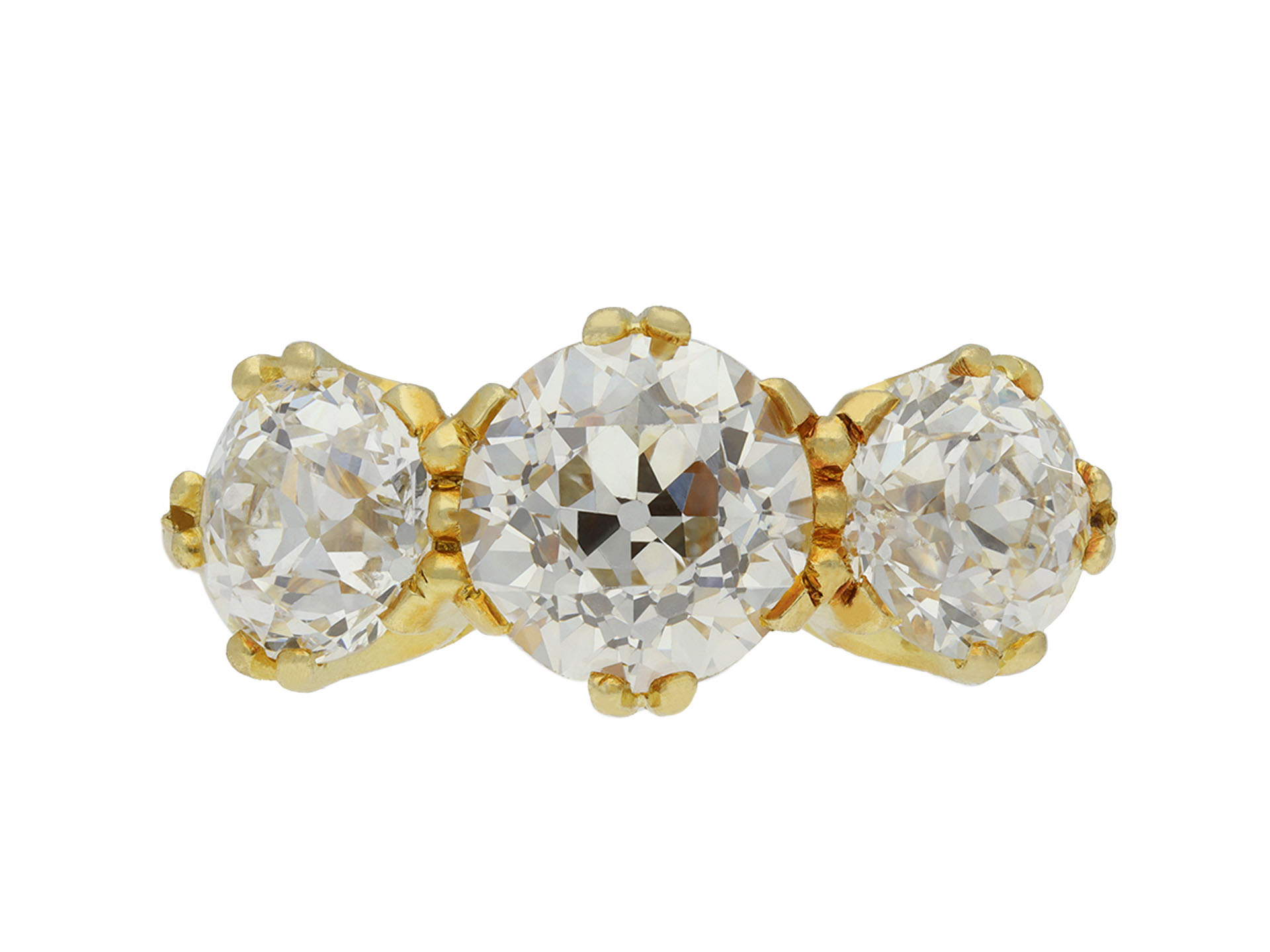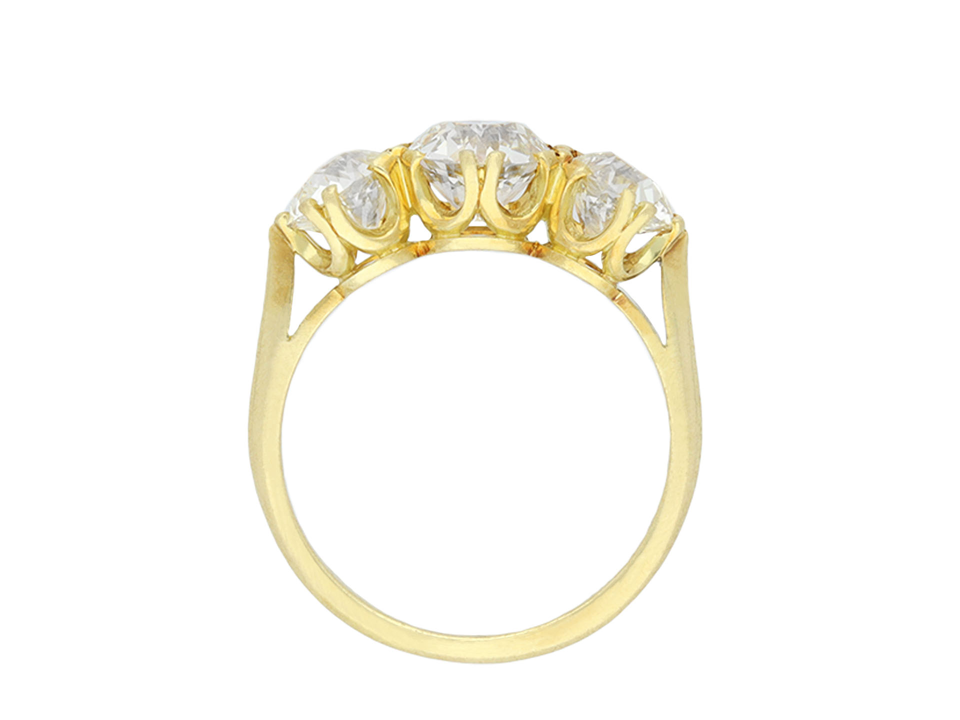 Edwardian diamond three stone ring. Set to centre with one round old cut diamond, J colour, VS2 clarity with a weight of 1.16 carats in an open back claw setting, flanked by two round old cut diamonds in open back claw settings with a combined approximate weight of 1.35 carats. The total approximate diamond weight is 2.51 carats to an elegant three stone design featuring curving claws, an intricately pierced gallery and circular open backholing, the slightly raised shoulders flowing through to a solid D-shape shank. Tested yellow gold, circa 1905, accompanied by Gemological Institute of America (GIA) report #5231507706.