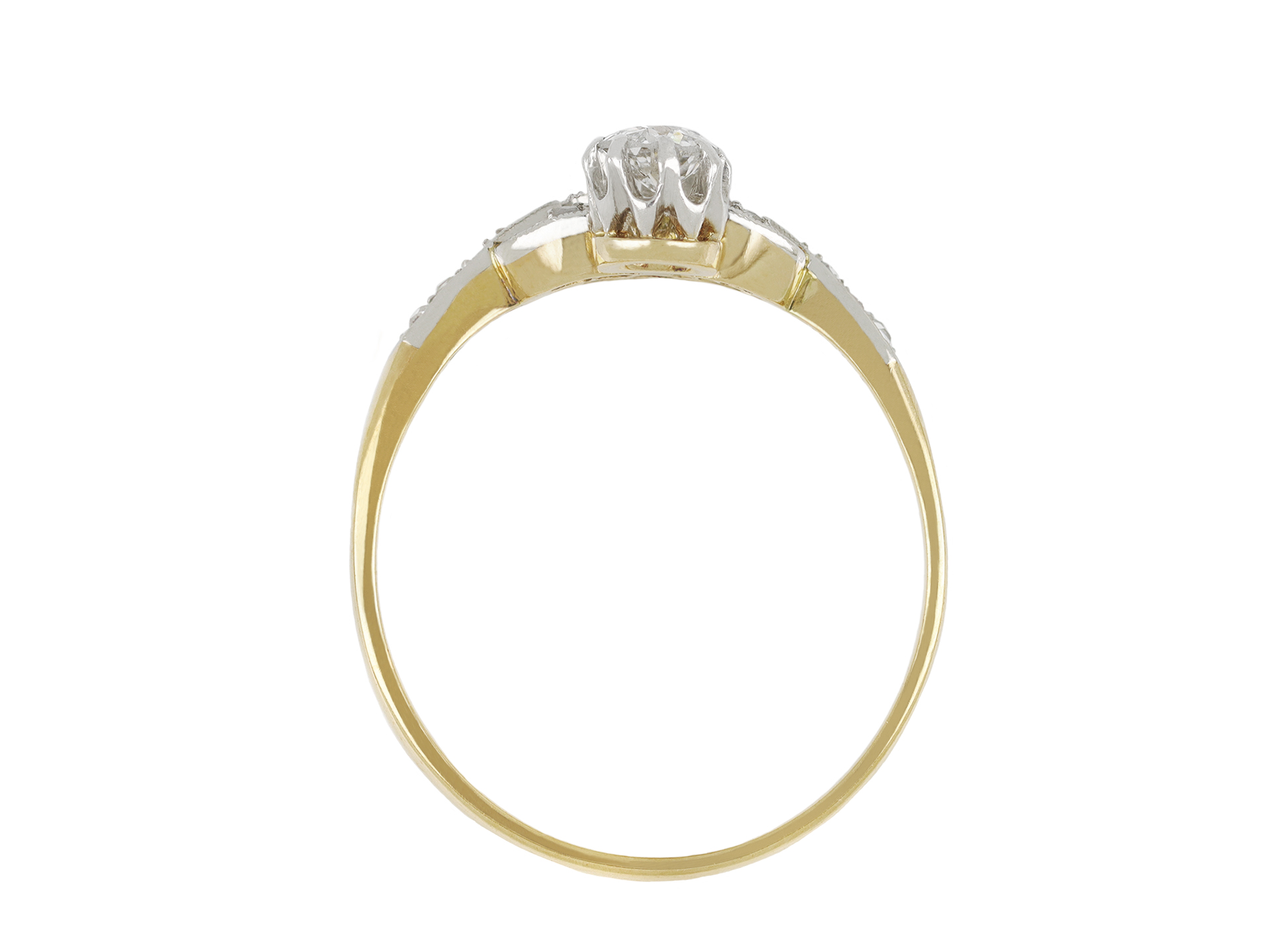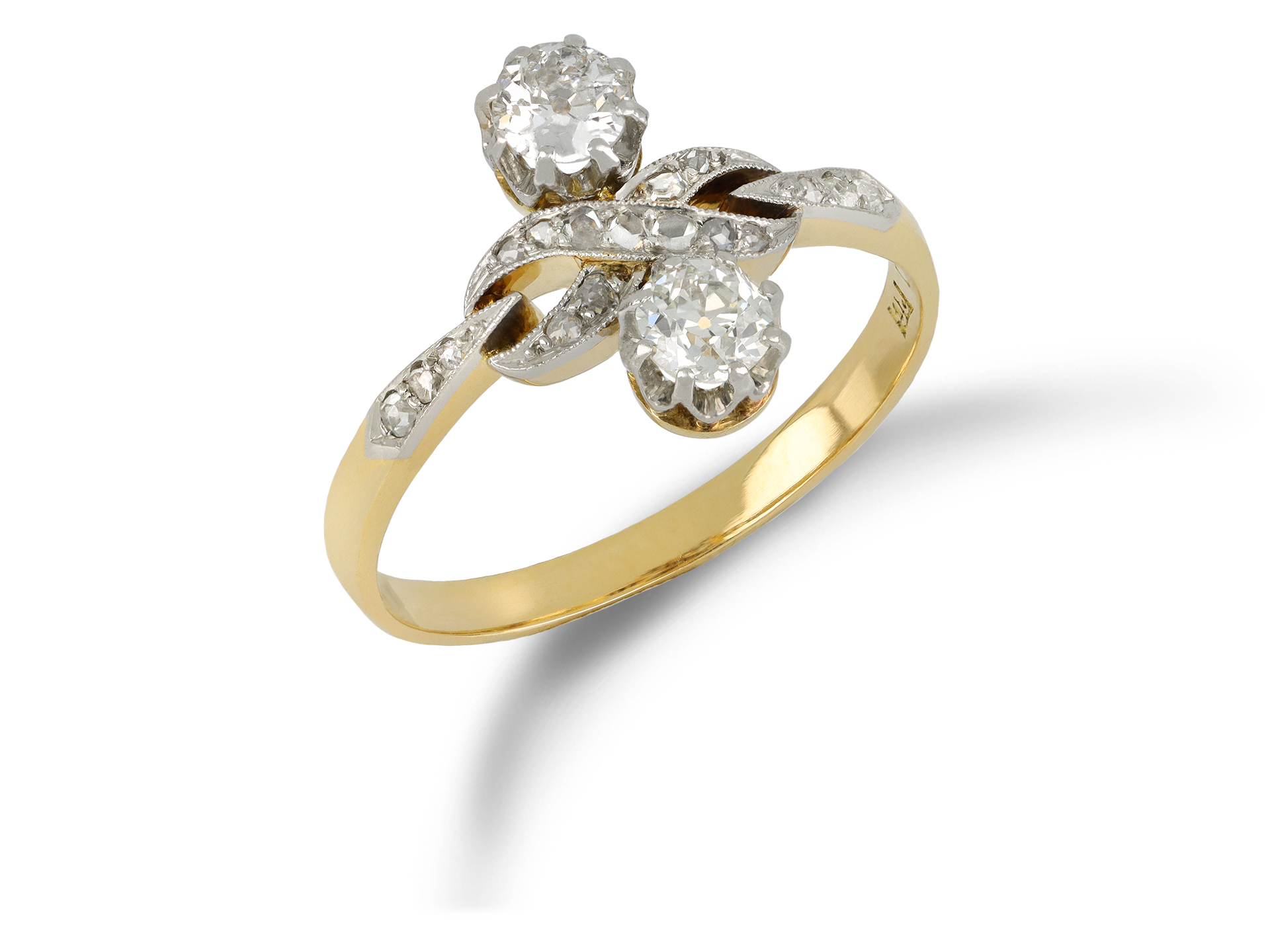 Edwardian diamond two stone ring. Set vertically with two round old cut diamonds in open back claw settings with a combined approximate weight of 0.50 carats, further set with seventeen round rose cut diamonds in open back grain settings with a combined weight of 0.17 carats. The total approximate diamond weight is 0.67 carats to an ornate scrolling design, featuring intricate openwork with millegrain edging, a finely pierced gallery and open backholing, leading to inwardly tapering shoulders and flowing through to a solid D-shape shank. Marked 18 carat yellow gold with platinum settings, indistinct maker's mark, English, circa 1905.