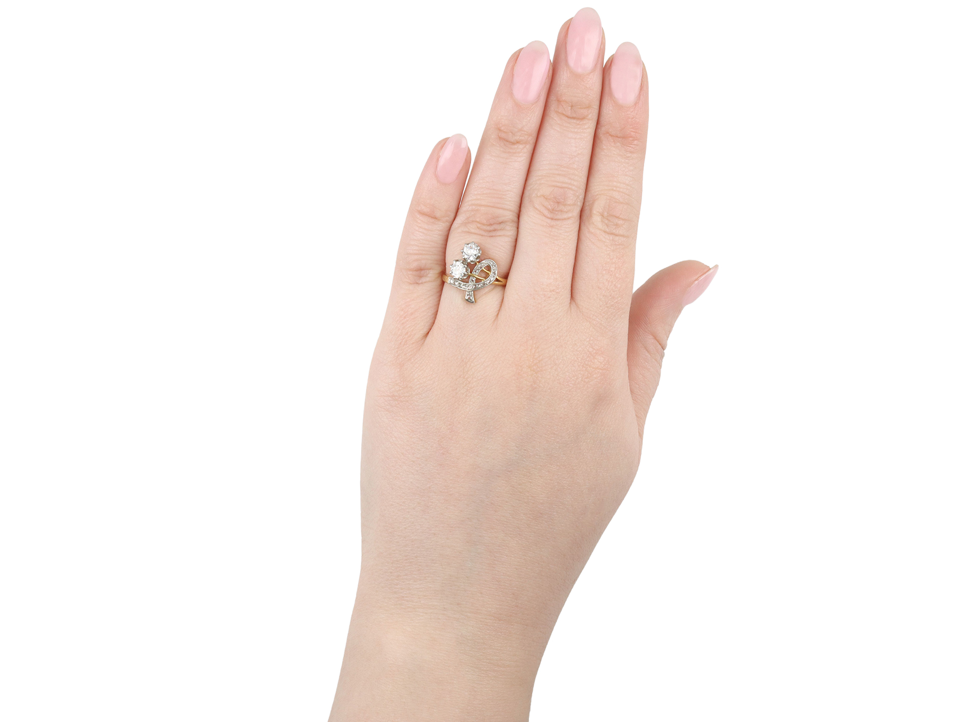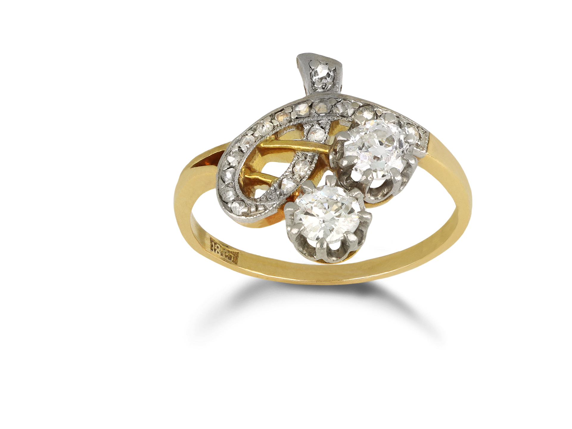 Edwardian diamond two stone ring. Set with two round old cut diamonds in open back claw settings with a combined approximate weight of 0.60 carats, further set with seventeen round rose cut diamonds in open back grain settings with a combined weight of 0.17 carats. The total approximate diamond weight is 0.77 carats, to an stylised foliate cross over design, featuring curving claws, millegrain edging and fancy shape open backholing, flanked by conforming shoulders flowing through to a solid tapering shank. Marked 18 carat yellow gold, tested platinum, circa 1910.