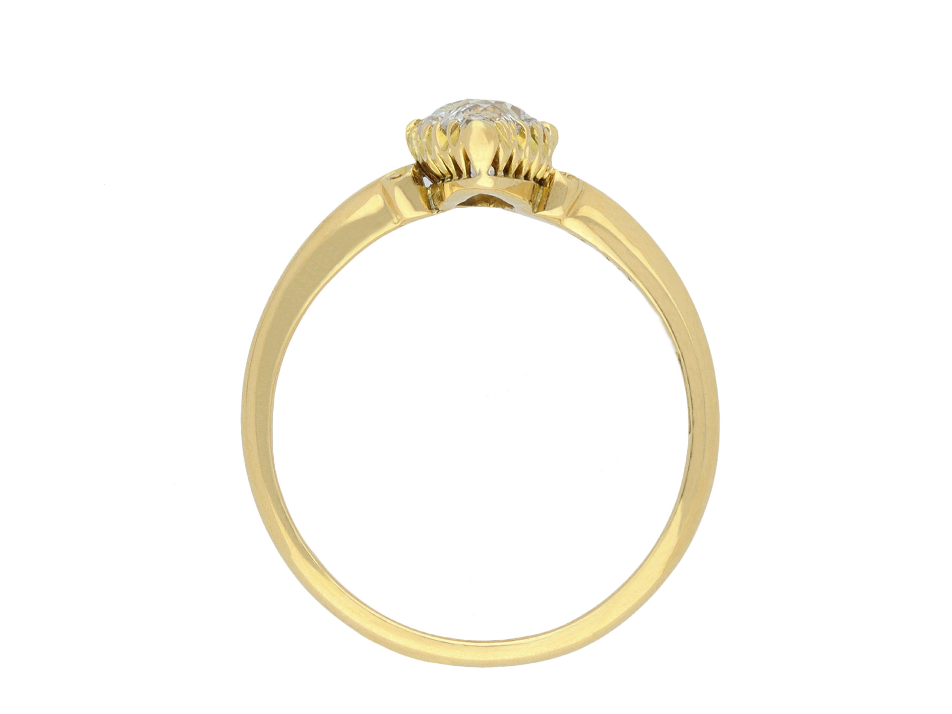 Edwardian marquise shape diamond cluster ring. Set with three round old cut diamonds in open back claw settings with a combined approximate weight of 0.85 carats, further set with six round eight cut diamonds in open back grain settings with a combined weight of 0.06 carats. The total approximate diamond weight is 0.91 carats to a vertical marquise cluster design featuring curving claws, an intricately pierced gallery and open backholing, leading to slightly raised shoulders with carved scroll motifs and flowing through to a solid D-shape shank. Marked 18 carat yellow gold, settings tested platinum, maker's mark 'F.ST' for Frederick Stone, numbered '400', circa 1905.
