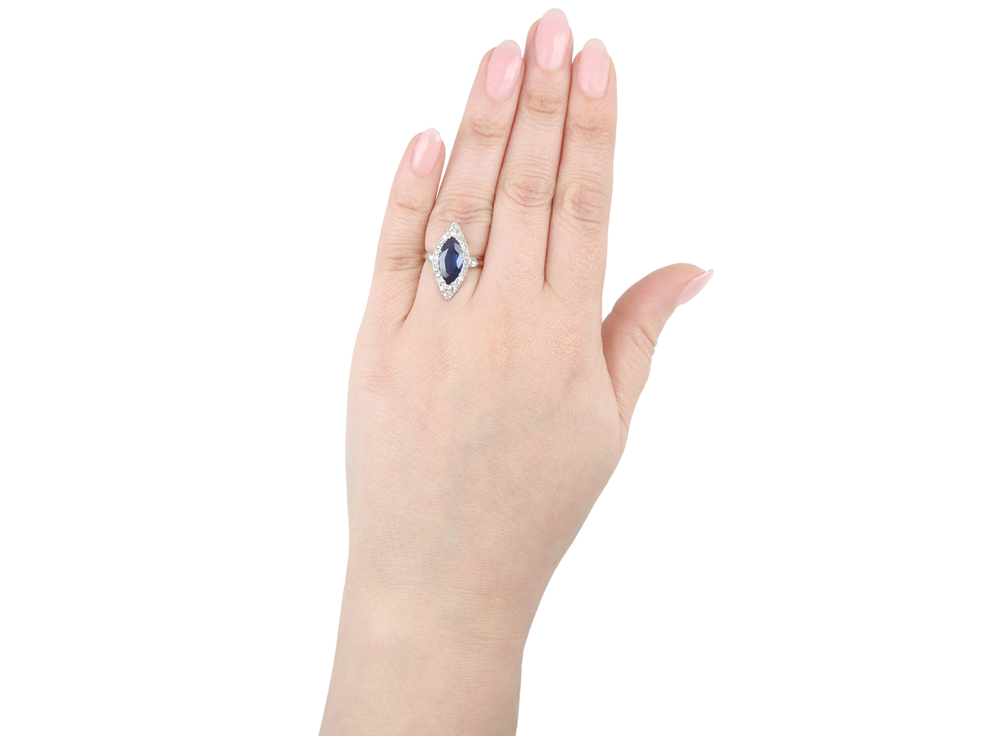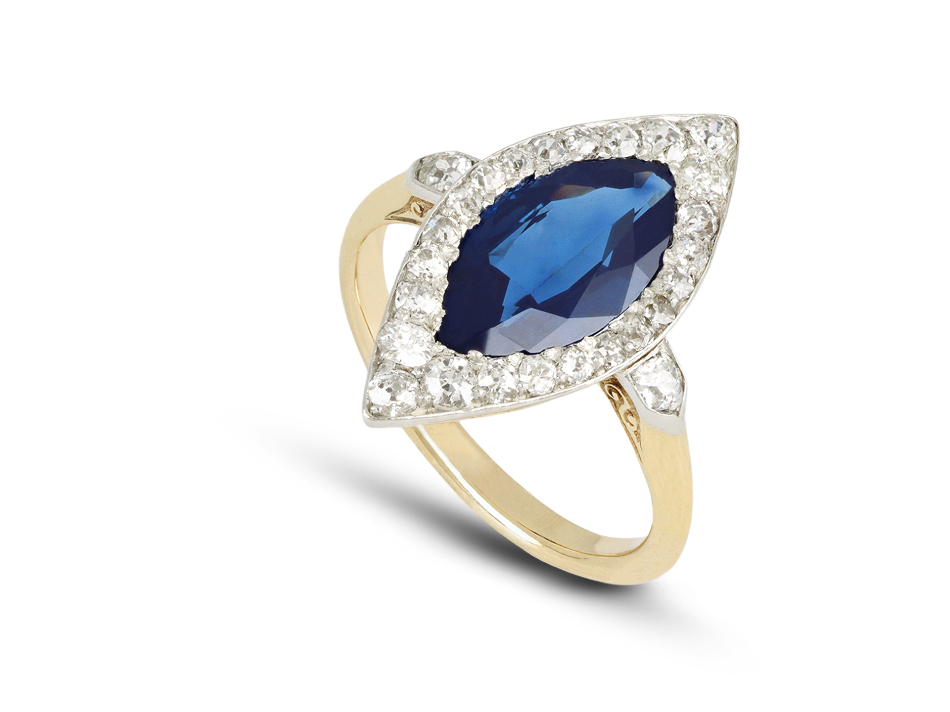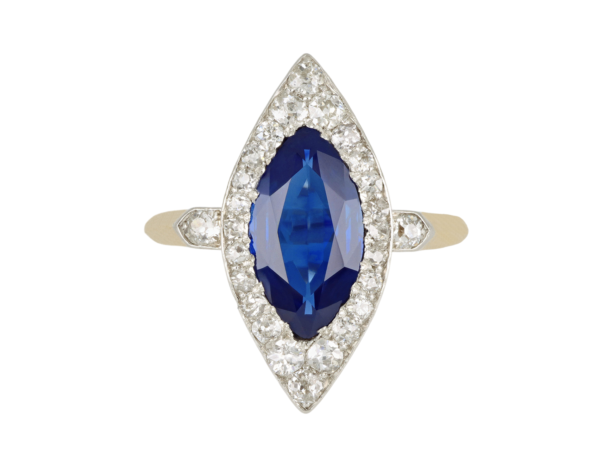 Edwardian sapphire and diamond marquise cluster ring, circa 1910.