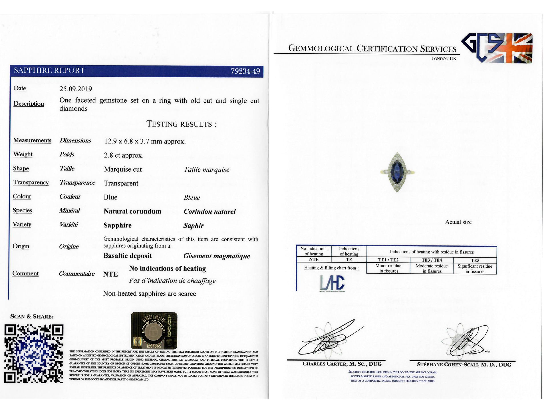 Edwardian sapphire and diamond marquise cluster ring. Set to centre with a marquise shape old cut natural unenhanced sapphire in an open back grain setting with an approximate weight of 2.80 carats, encircled by a single row of twenty-four round old mine diamonds in open back grain settings with an approximate combined weight of 0.67 carats, further set to the shoulders, with two round old mine diamonds in open back grain settings with a combined weight of 0.08 carats. The total approximate diamond weight is 0.75 carats, to an elegant marquise cluster design featuring polished edges, an intricately pierced gallery and open backholing, leading to smooth shoulders with engraved scrolling motifs, flowing through to a solid D-shape shank. Tested yellow gold with platinum settings, circa 1910, accompanied by Gemmological Certification Services report #79234-49.