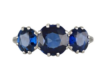 Edwardian sapphire and diamond three stone ring, circa 1910.