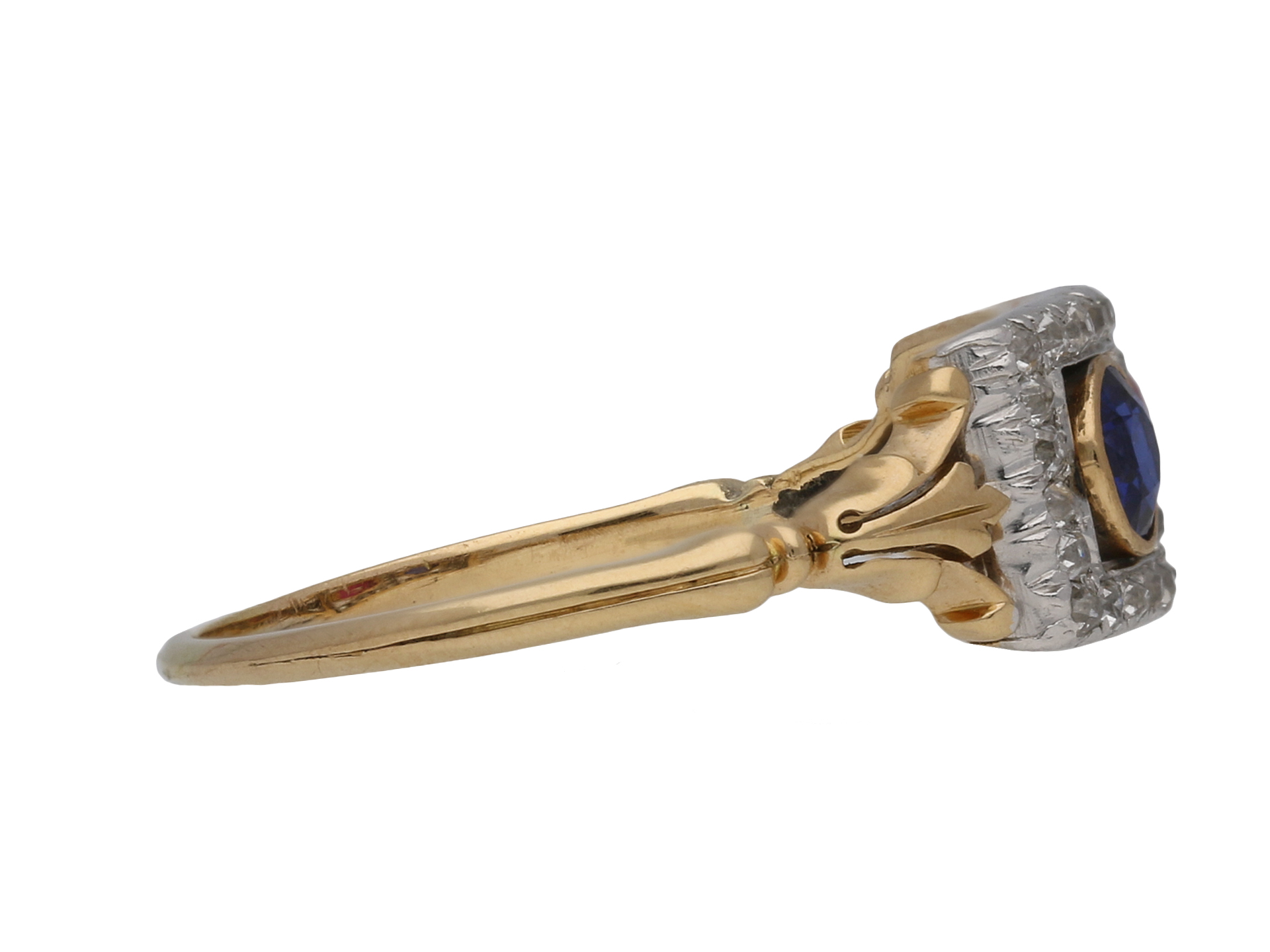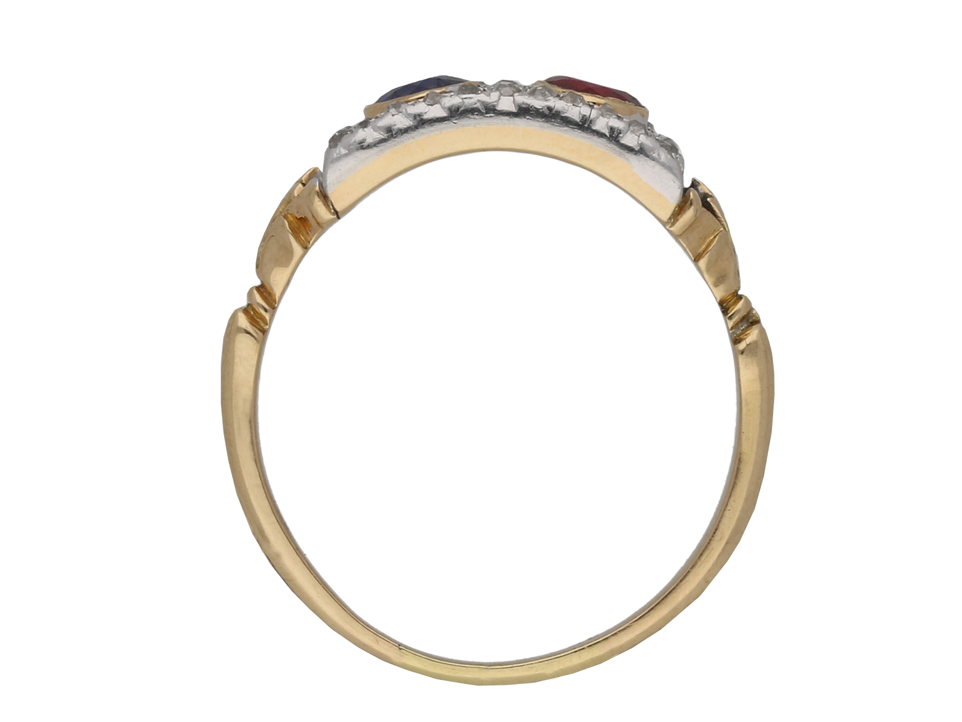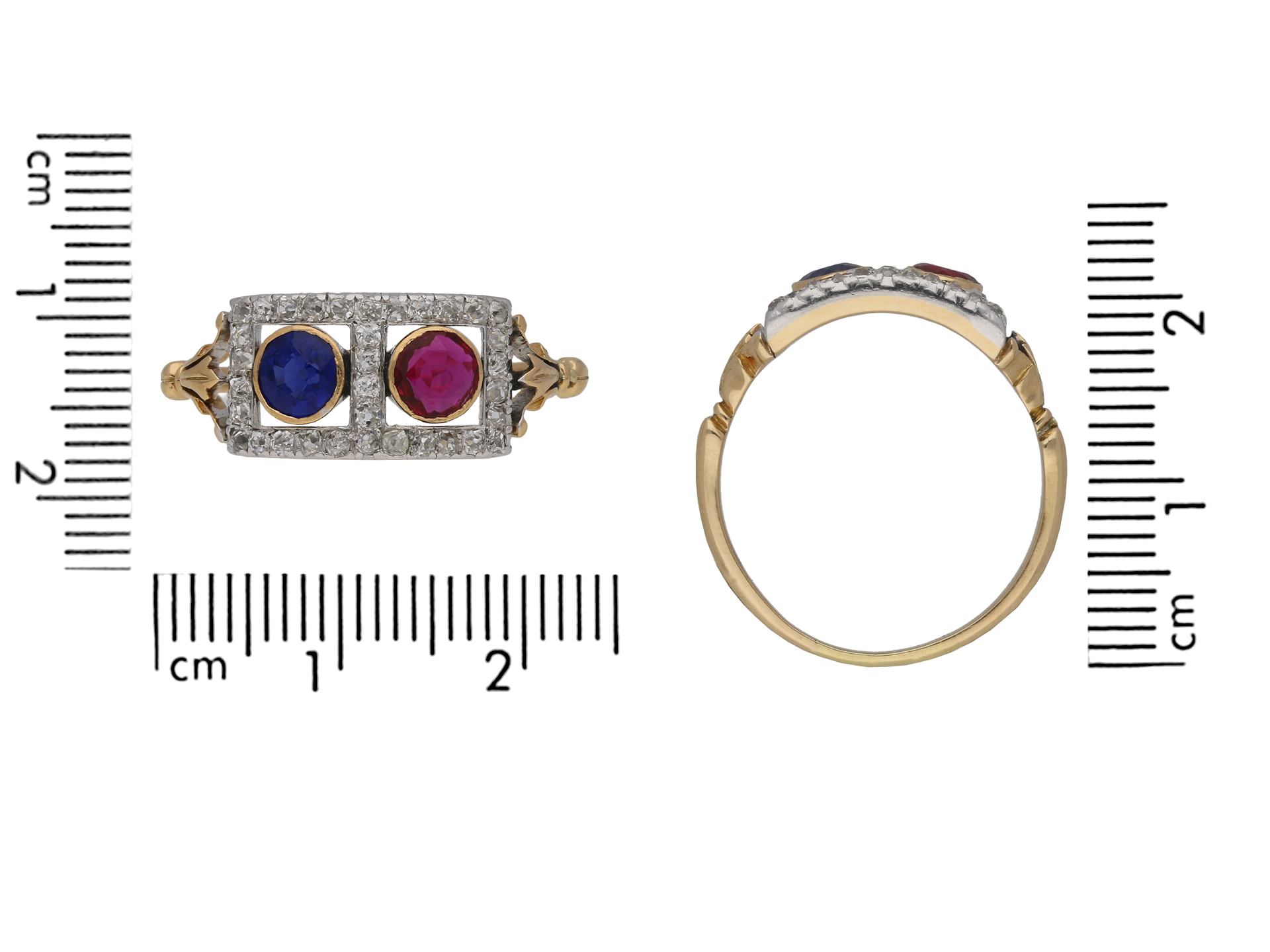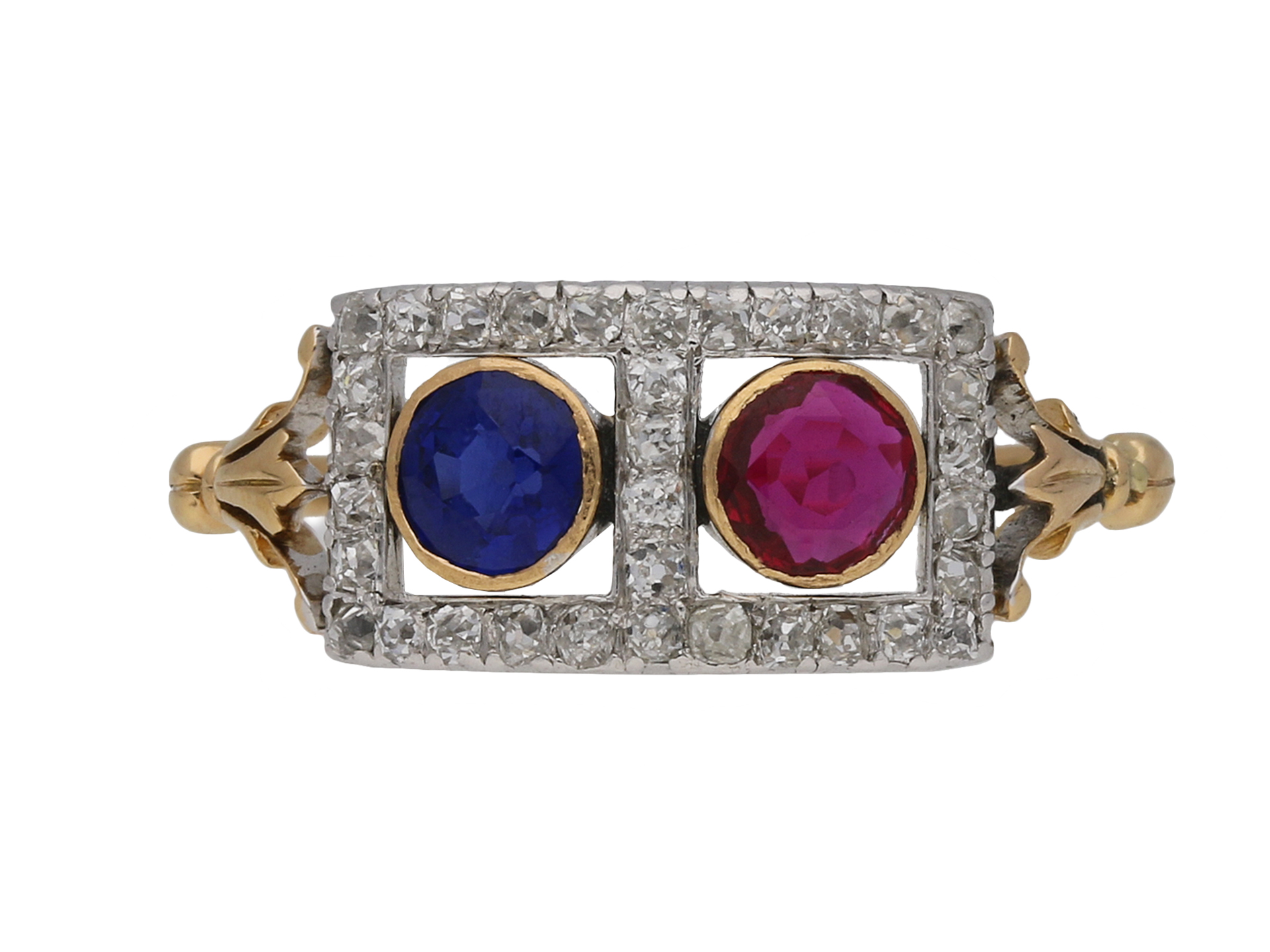 Edwardian sapphire, ruby and diamond ring. Set with one round old cut natural unenhanced sapphire in an open back rubover setting with an approximate weight of 0.25 carats, further set with one round old cut natural unenhanced ruby in an open back rubover setting with an approximate weight of 0.25 carats, surrounded by thirty four cushion shape old cut diamonds in open back grain settings with an approximate combined weight of 0.68 carats, to a linear cluster design featuring polished borders, stylised claws and open backholing, leading to tri-split shoulders with a foliate pattern and flowing through to a tapered ridged D-shape shank. Tested rose gold and platinum, circa 1905.