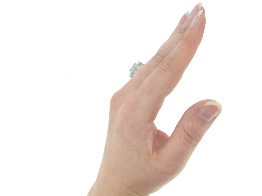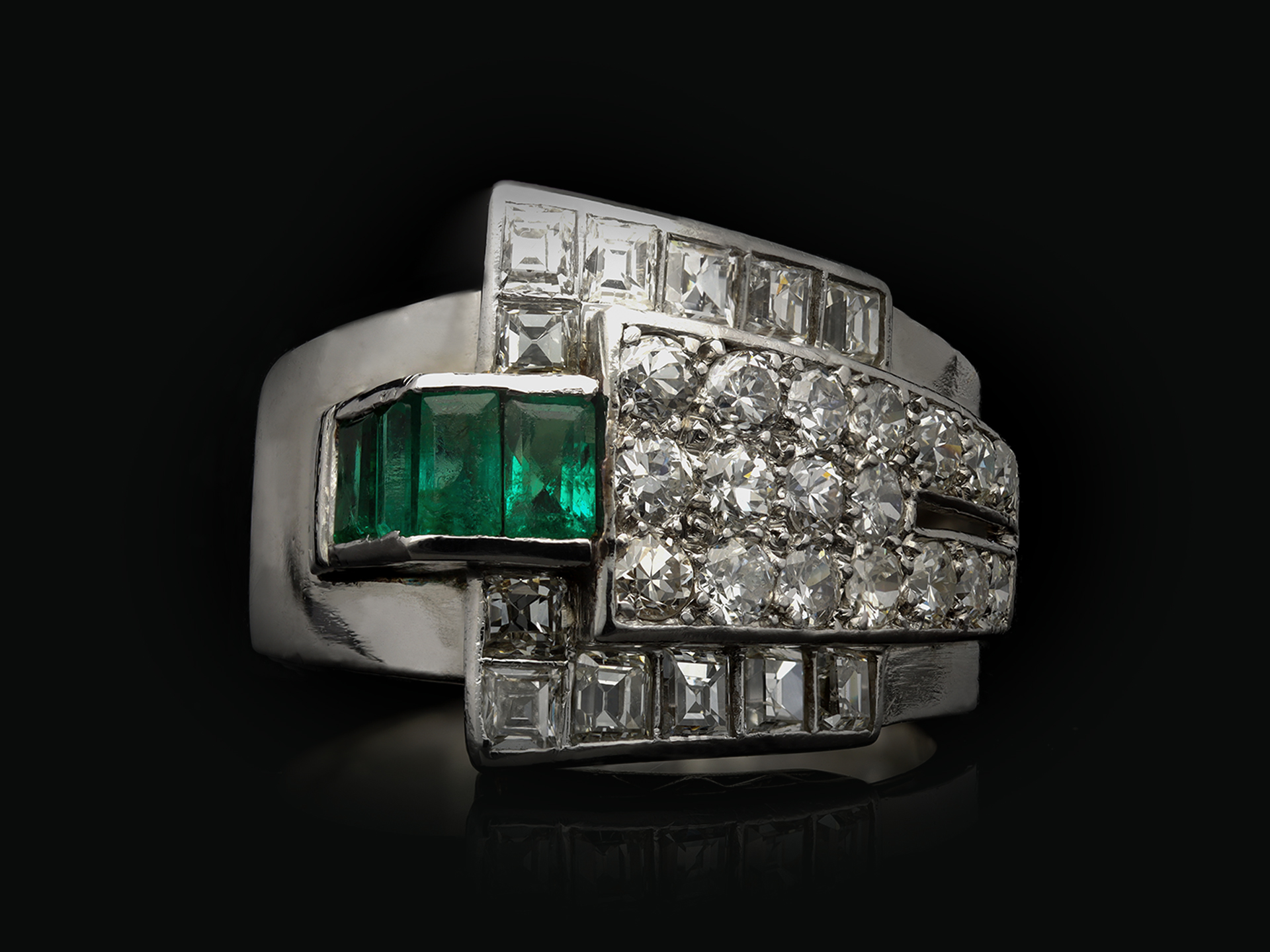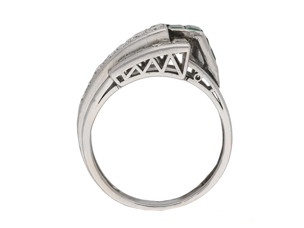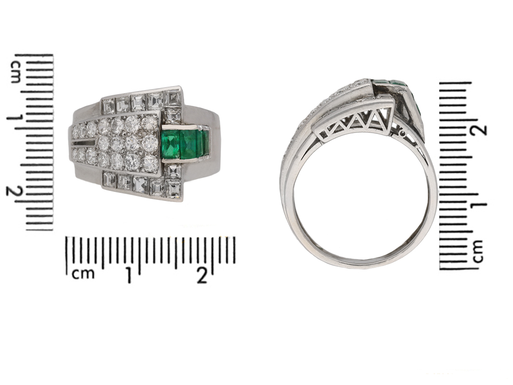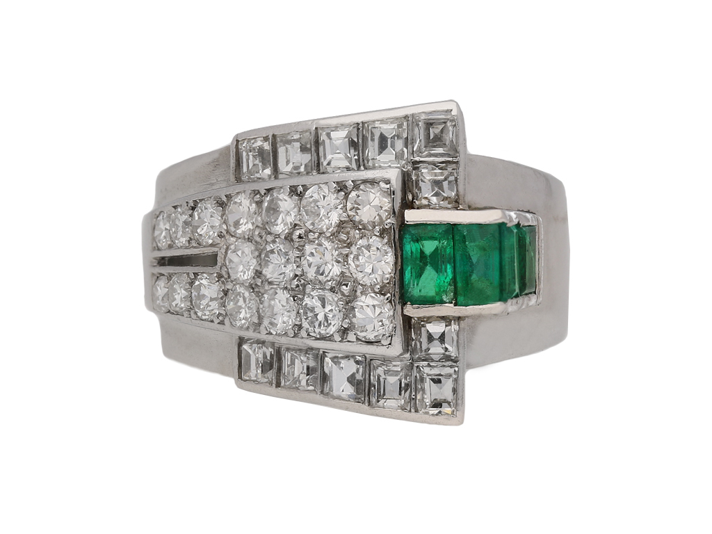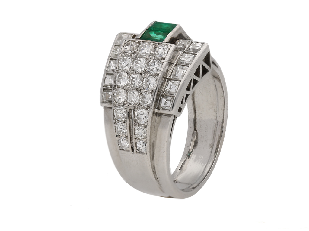 Emerald and diamond cocktail ring. Set with four rectangular baguette cut natural emeralds in an open back channel setting with an approximate total weight of 0.80 carats, further set with twelve square baguette cut diamonds in open back rubover settings with a total weight of 1.20 carats and eighteen round star top cut diamonds in open back grain settings with a total weight of 0.54 carats. The combined approximate diamond weight is 1.74 carats, to a heavy asymmetrical bezel composed of a tapered raised stepped element, all above an openwork geometric gallery with pierced backholing, and on a square shank. Tested platinum, circa 1935.