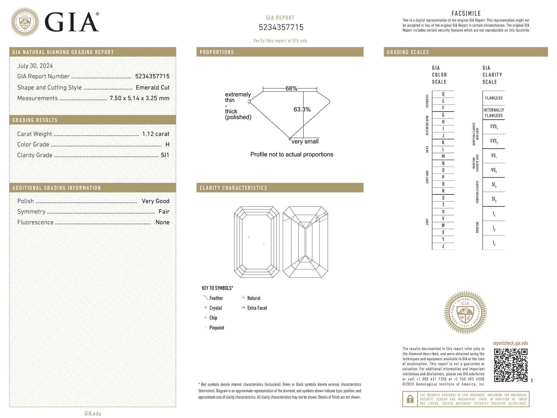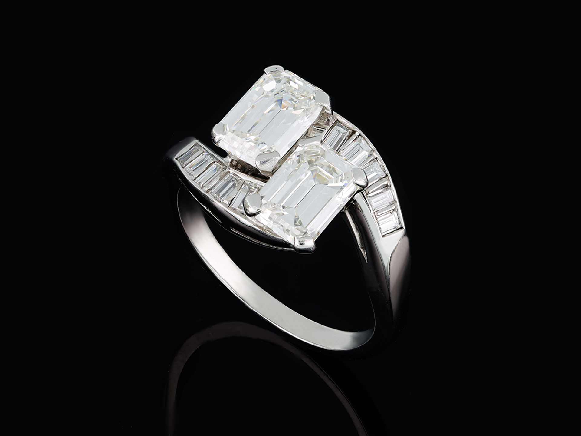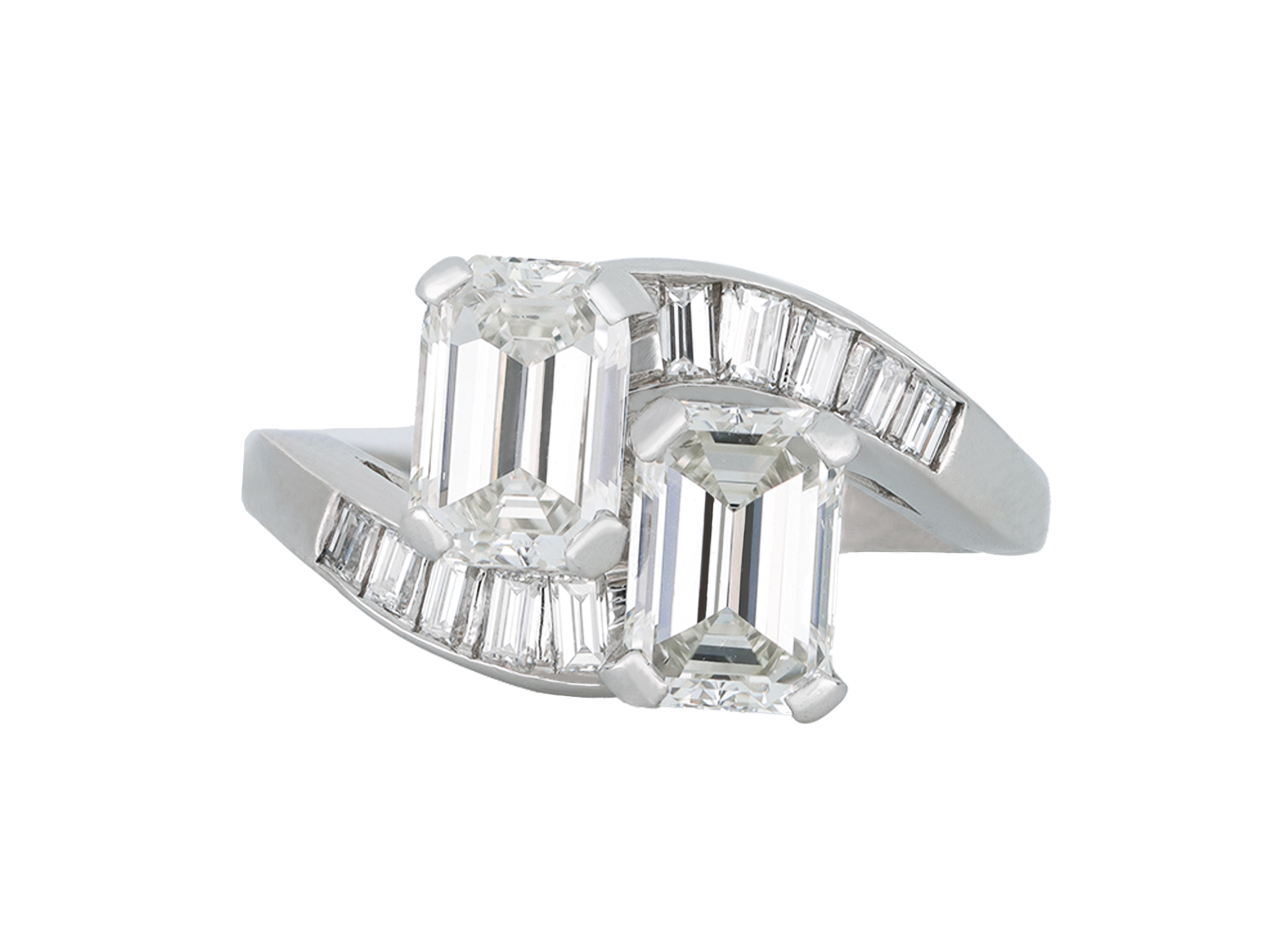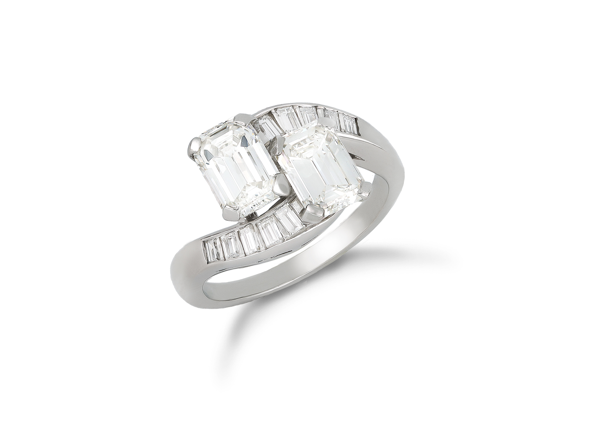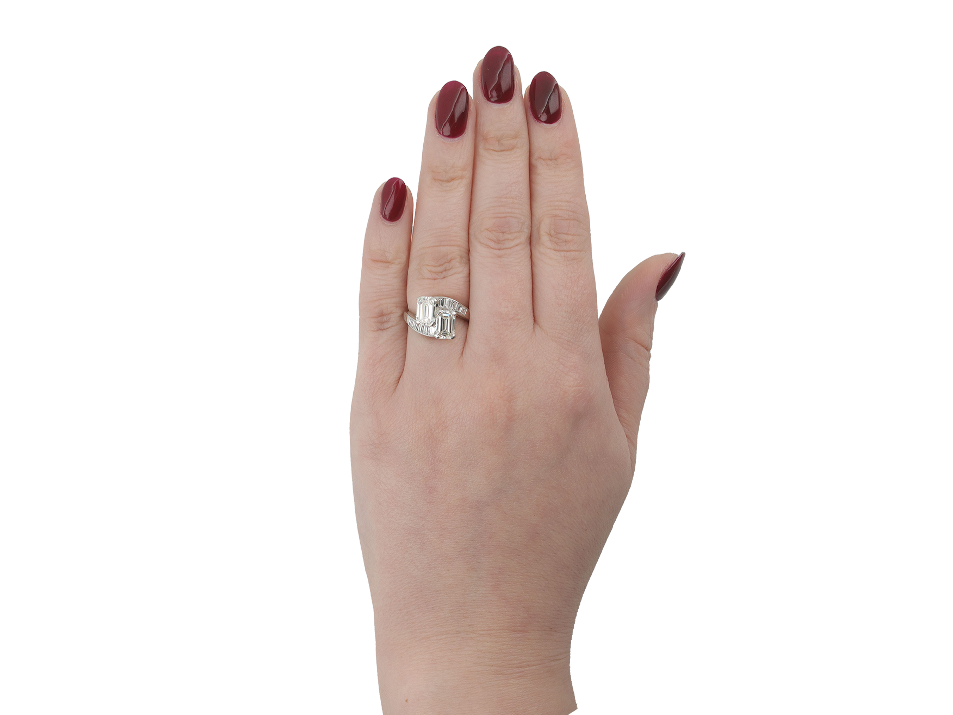 Emerald-cut diamond cross over ring. Set with one emerald-cut diamond in an open back claw setting, H colour, SI1 clarity with a weight of 1.12 carats, further set with one emerald-cut diamond in an open back claw setting, I colour, VS1 clarity with a weight of 1.11 carats, flanked by ten rectangular baguette cut diamonds in open back channel settings with a combined weight of 0.40 carats. The total approximate diamond weight is 2.63 carats, to a striking crossover design featuring polished borders, a finely pierced gallery and fancy open backholing, leading to smooth shoulders and flowing through to a solid D-shape shank. Marked platinum and iridium, American, circa 1950, accompanied by Gemological Institute of America (GIA) reports #5234357715 & #2231357455.