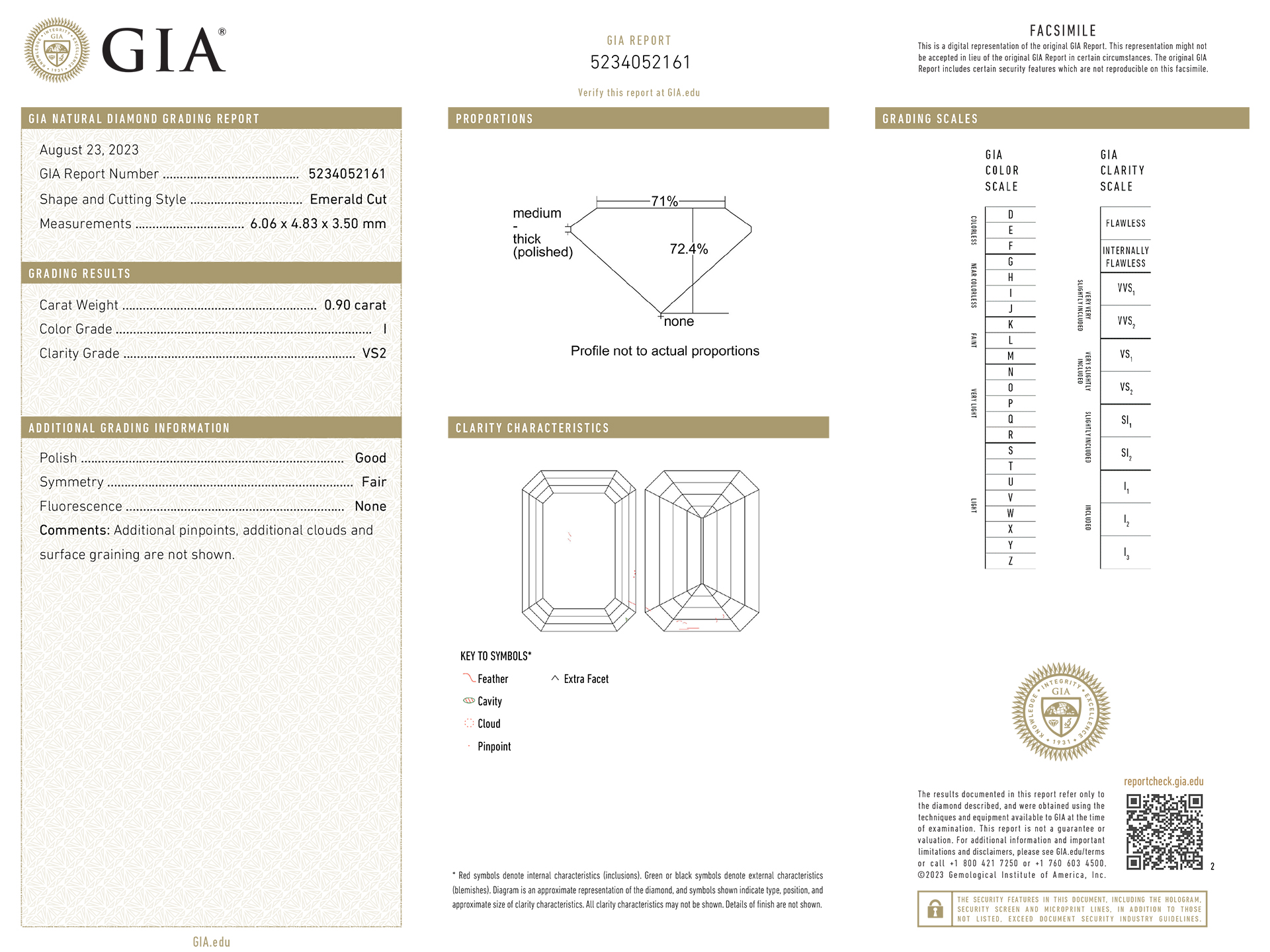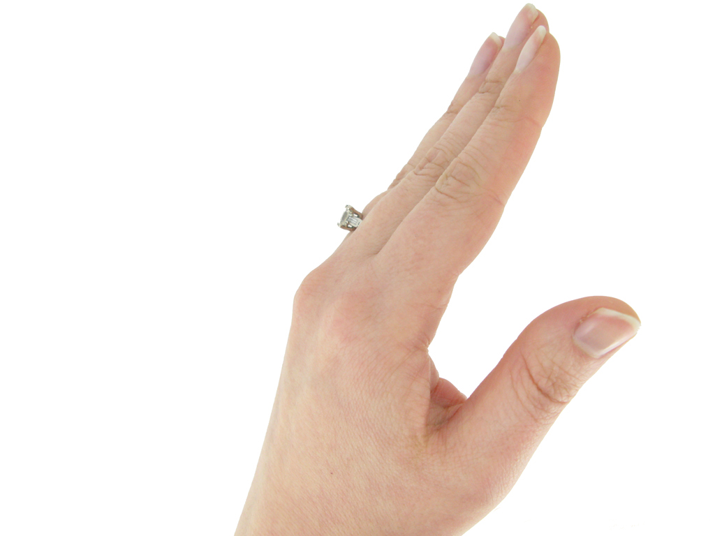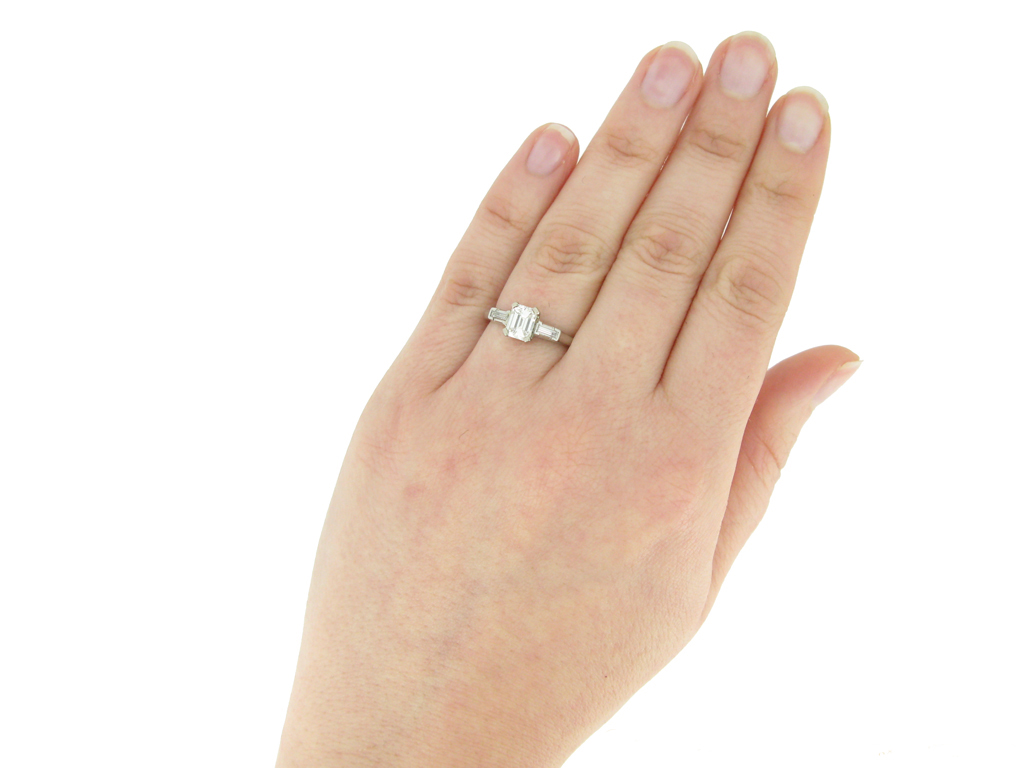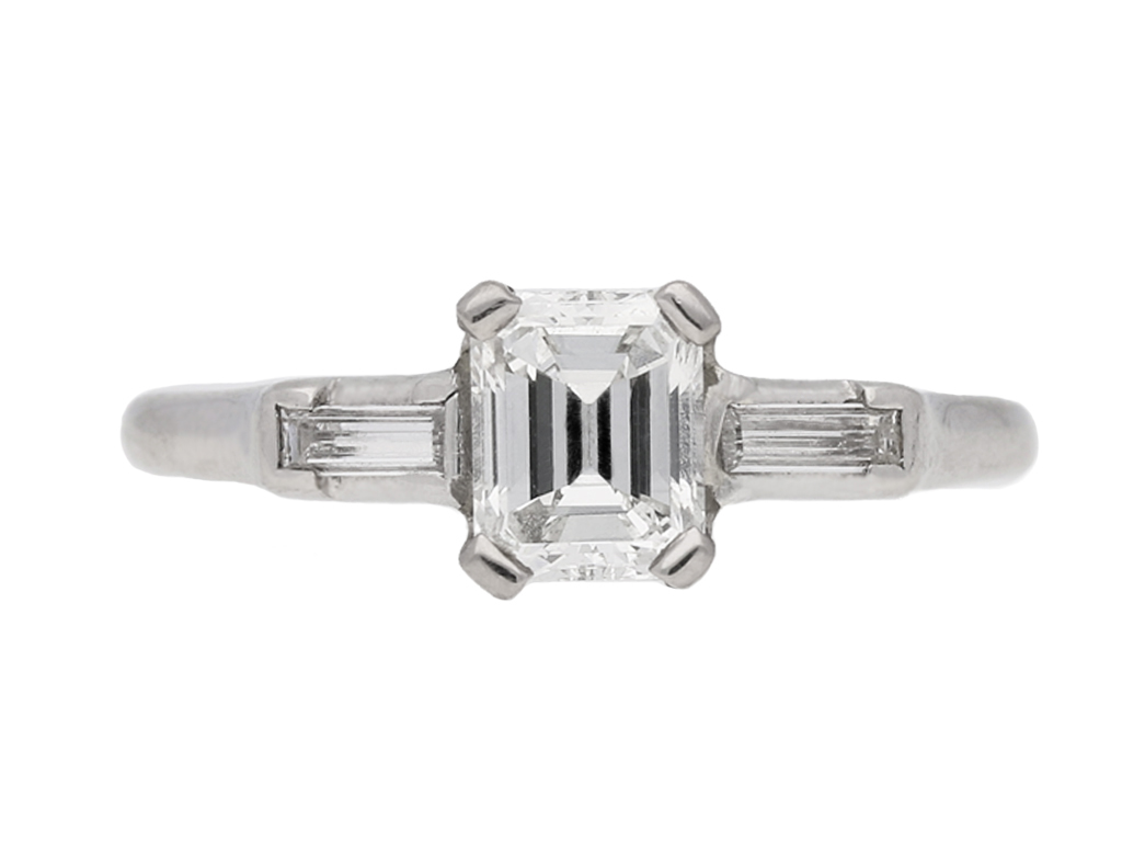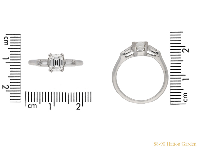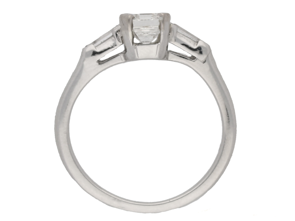 Emerald-cut diamond flanked solitaire ring. Centrally set with an octagonal emerald-cut diamond, I colour, VS2 clarity, with a weight of 0.90 carats, in an open back claw setting, flanked by two rectangular baguette cut diamonds in open back half rubover settings with a combined weight of 0.16 carats. The total approximate diamond weight is 1.06 carats, to an elegant flanked solitaire design featuring corner claws, a linear pierced gallery and geometric open backholing, the gently sloping shoulders lead through to a solid D-shape shank. Marked platinum and iridium, indistinct maker's mark, American, circa 1950, accompanied by Gemological Institute of America (GIA) report #5234052161.